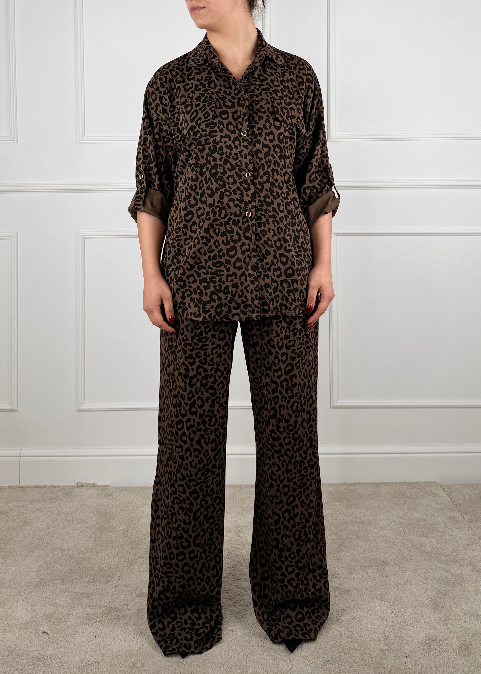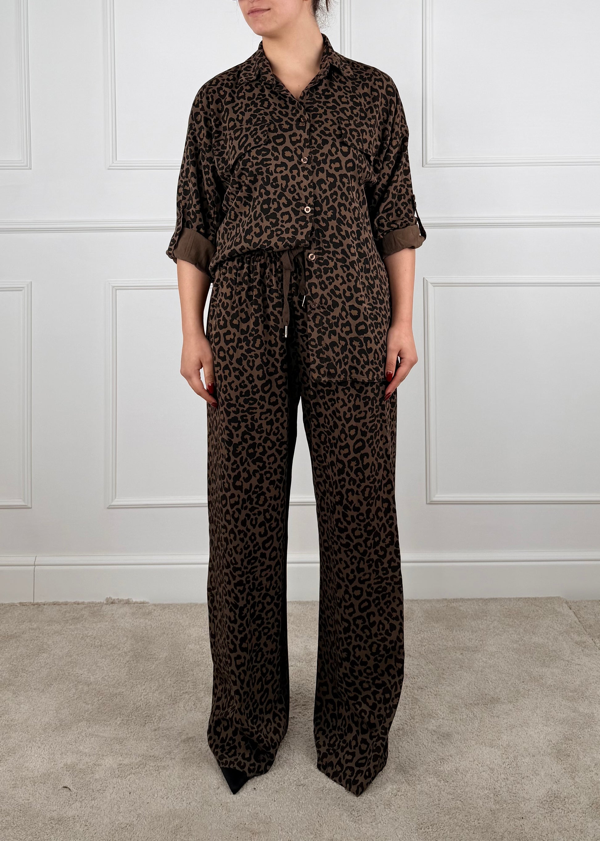 Completo maculato composto da camicia e pantalone. Camicia chiusura con bottoni, tasche finta con patta sul davanti. Pantalone palazzo elastico in vita con coulisse, tasche a filo. Composizione: 100% Viscosa