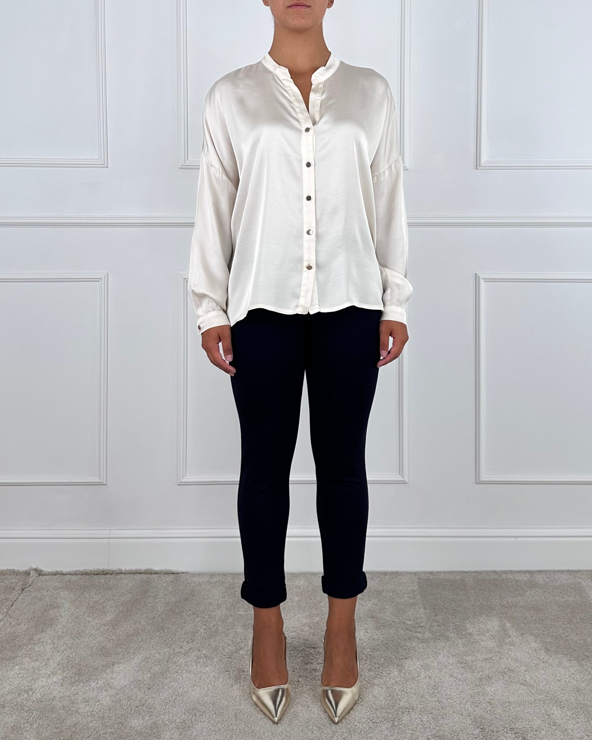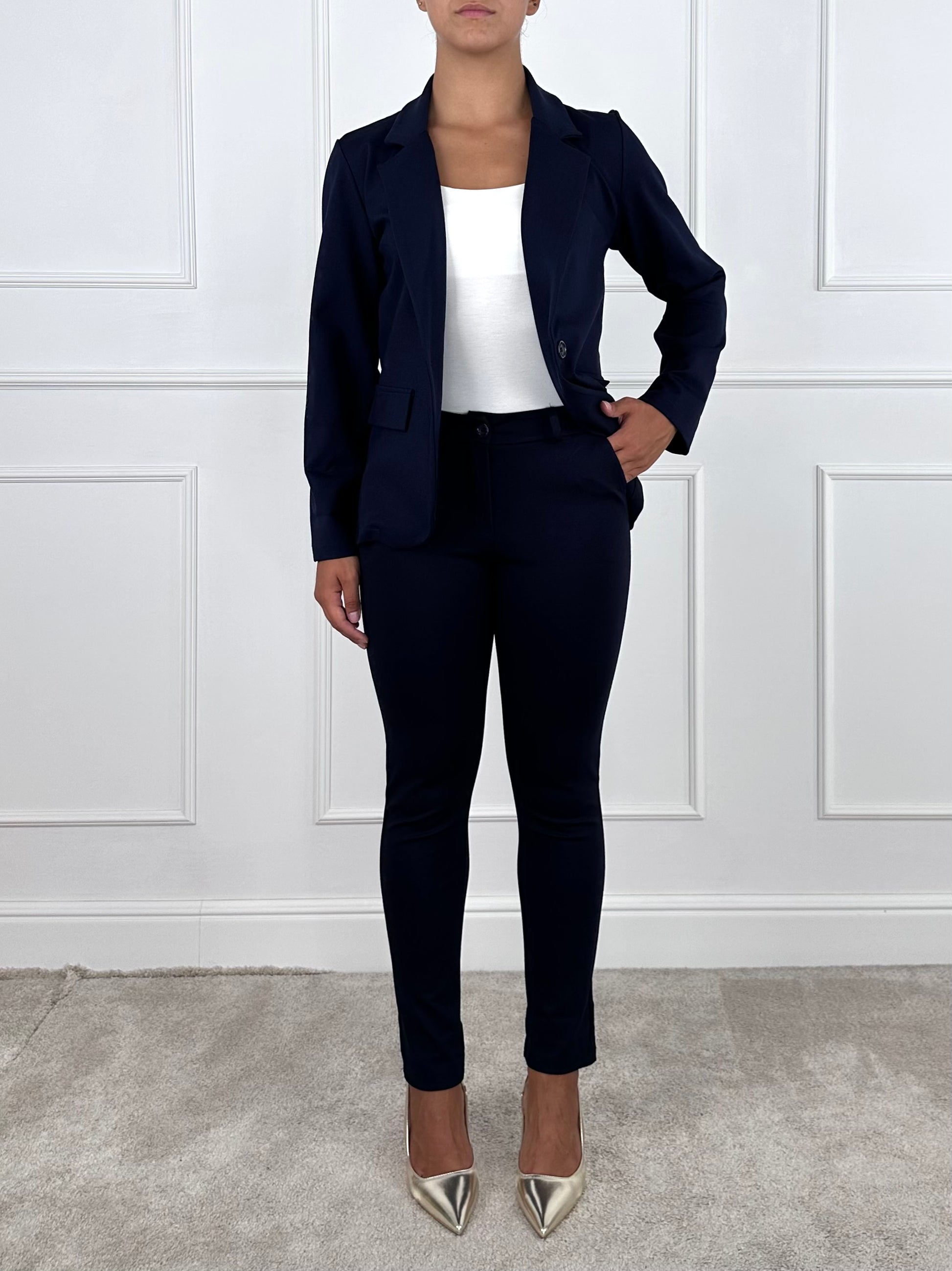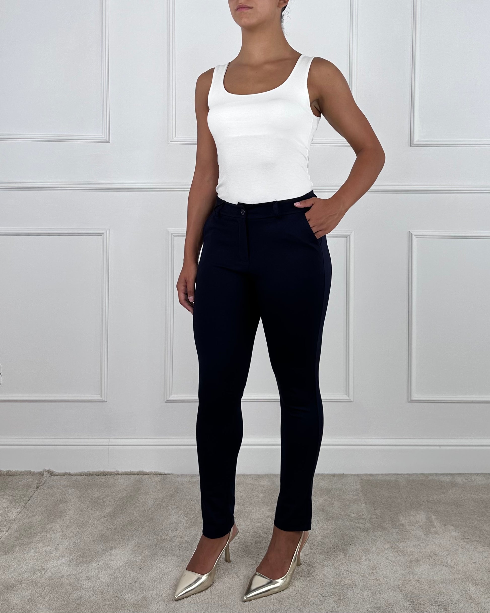 Pantalone modello sigaretta, punto milano, chisura con bottone e zip nascosta. Dotato di passanti e cintura. Composizione: 65% Viscosa 30% Poliestere 5% Elastan