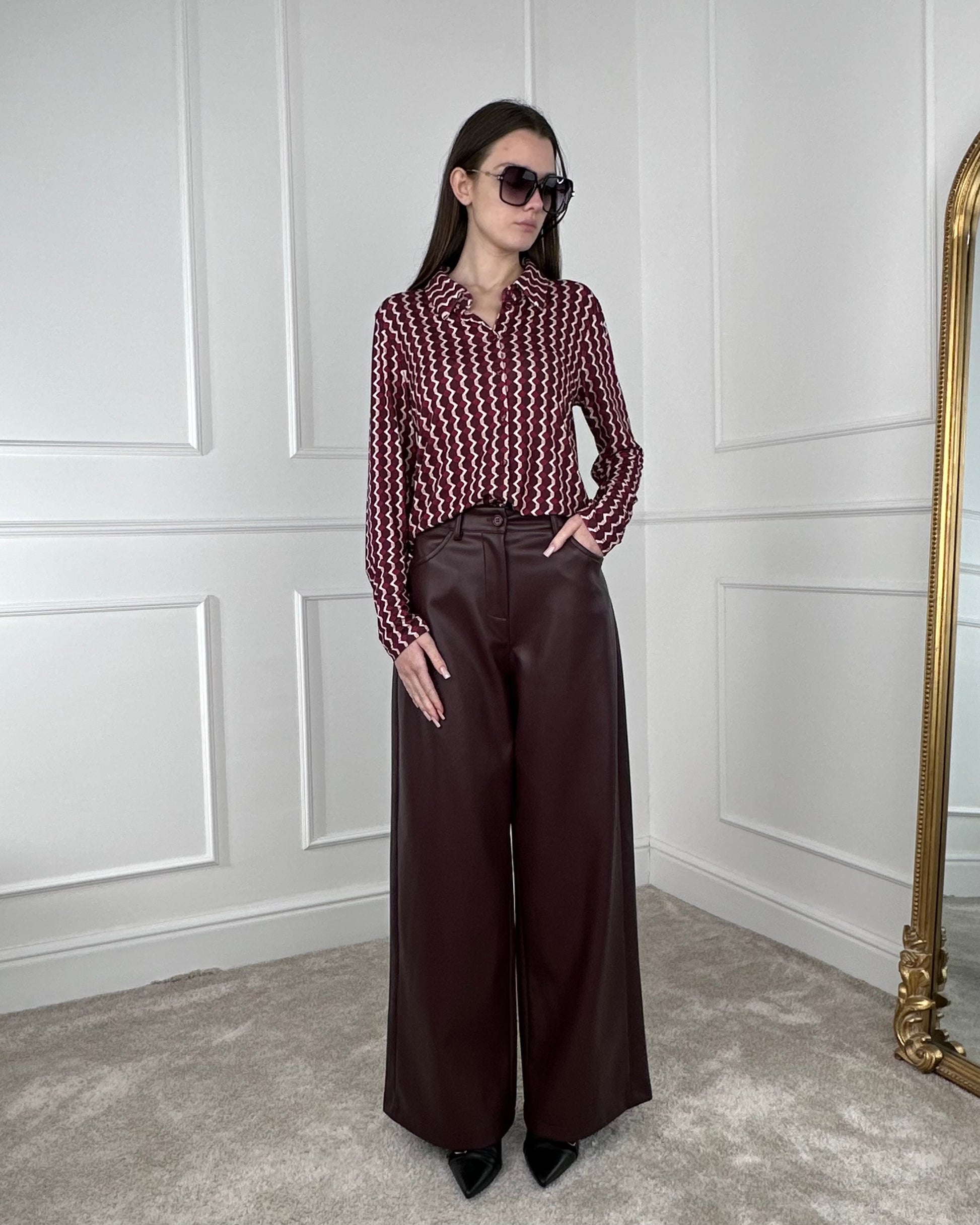 Tensione in pantalone GIUSI in similpelle modello palazzo, chiusura con bottone e zip nascosta. Tasche sul davanti e sul retro, dotato di passanti. Composizione: 50% Poliuretano 50% Poliestere
