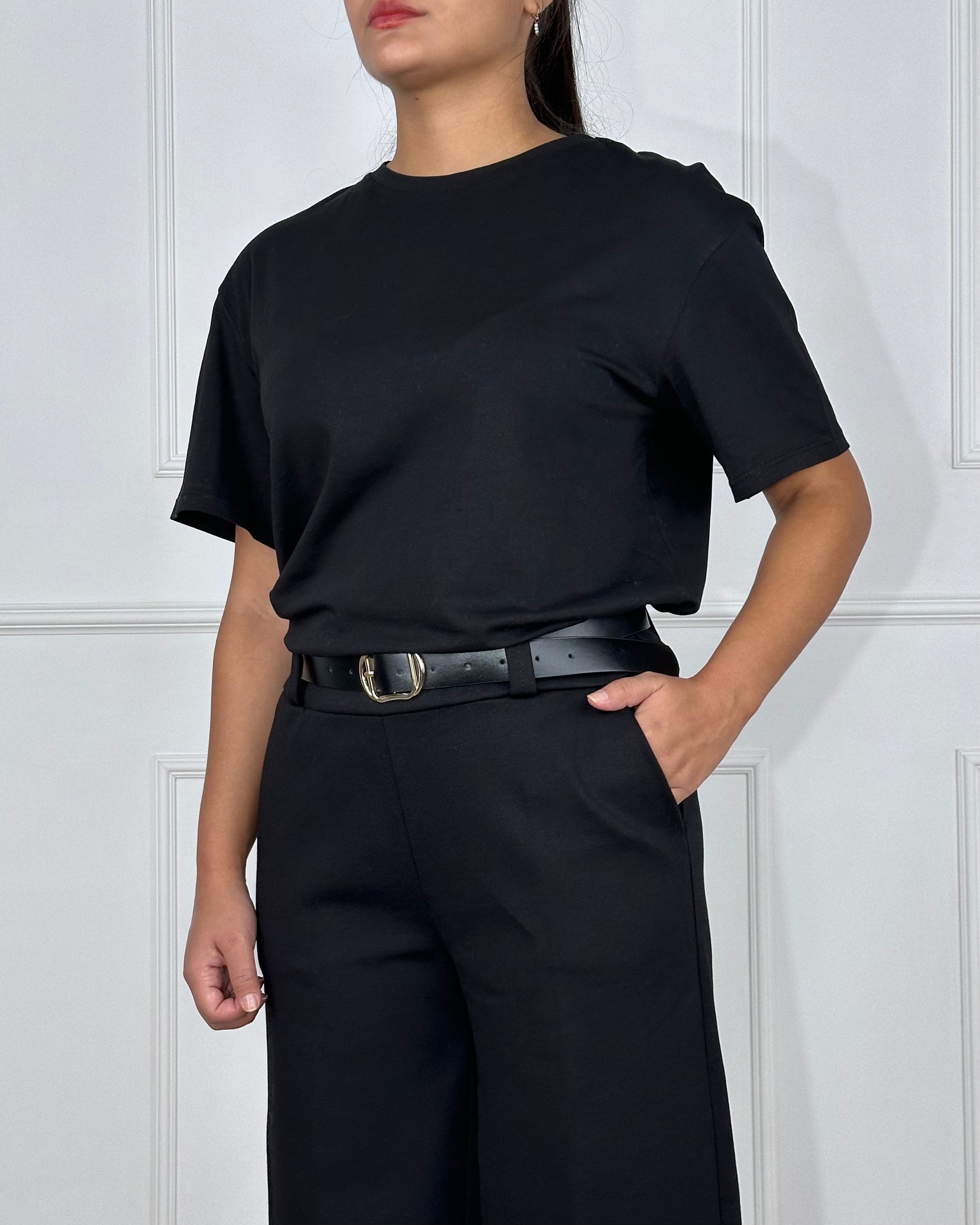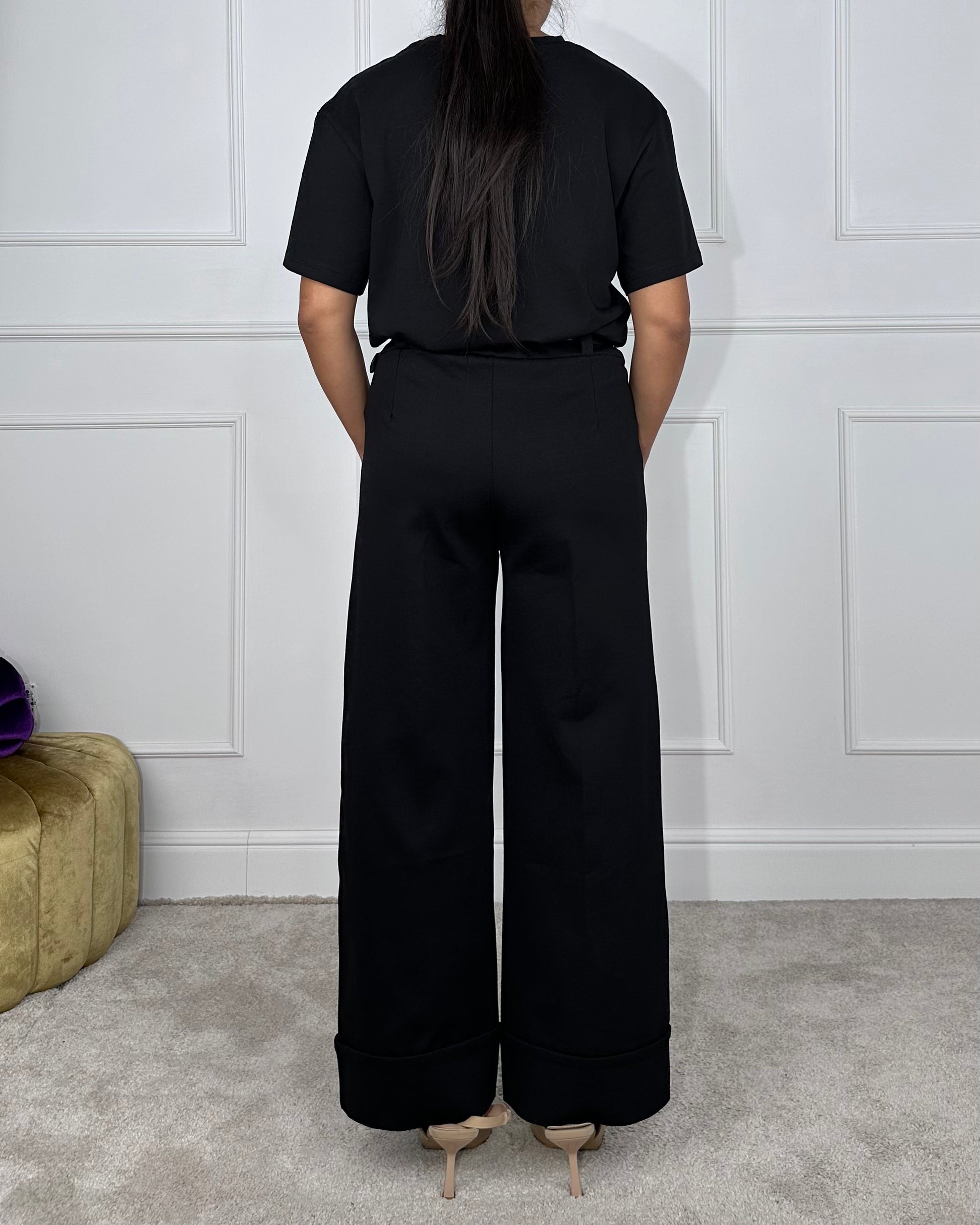 Pantalone palazzo punto milano, elastico in vita, dotato di cintura e passanti. Risvolto cucito. Se vuoi creare un completo è disponibile la giacca con il codice 6062 Composizione: 65% Viscosa 30% Poliestere 5% Elastan