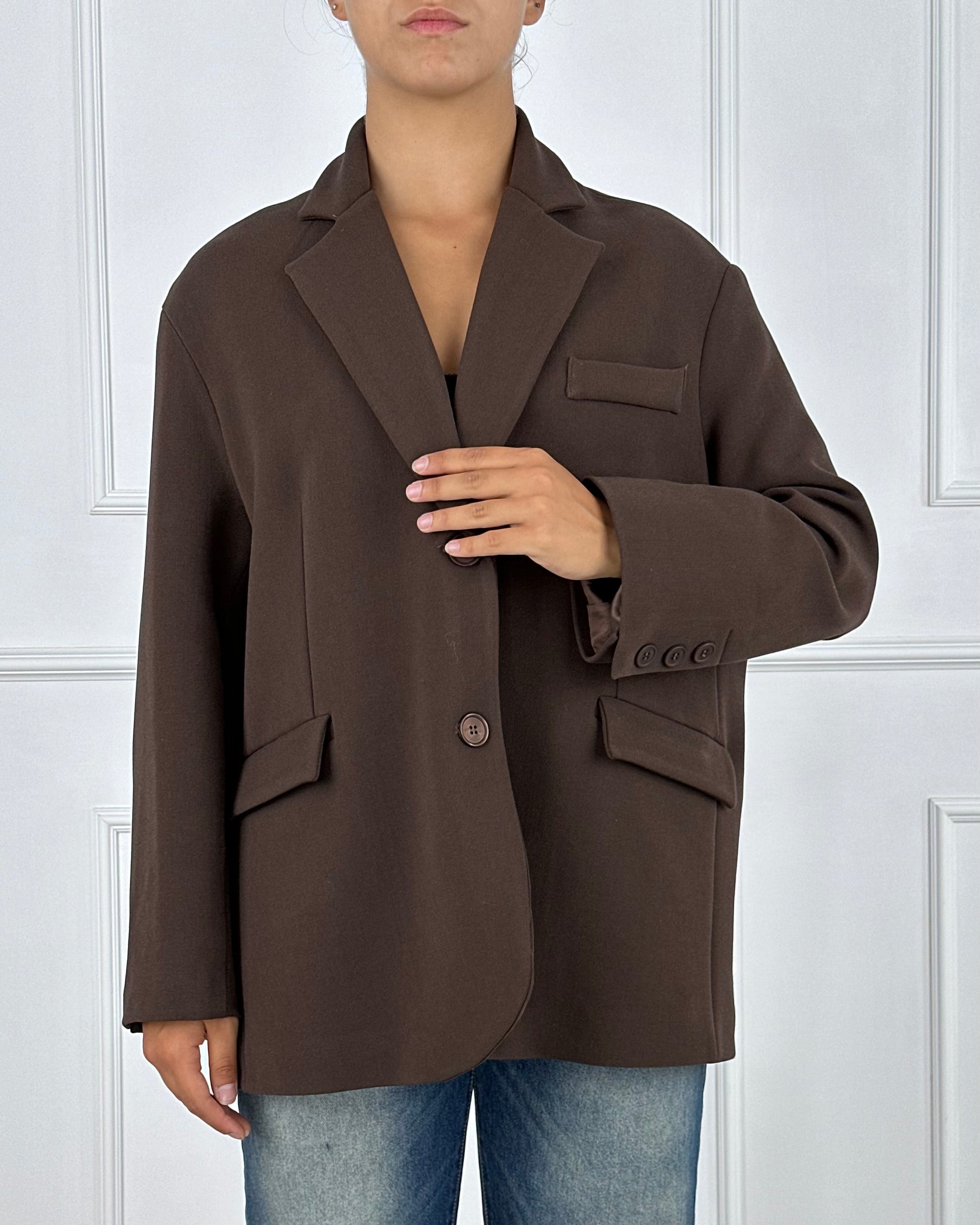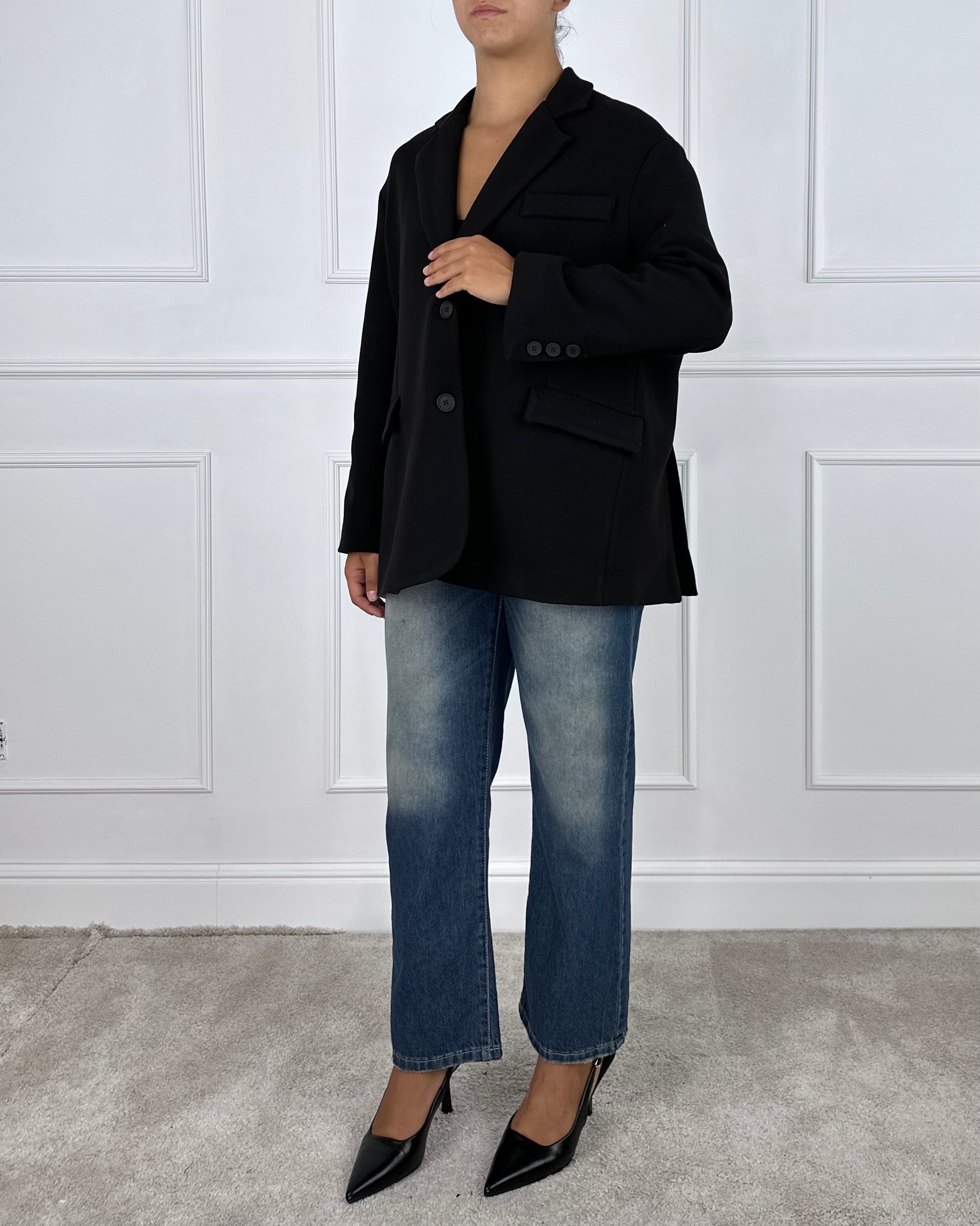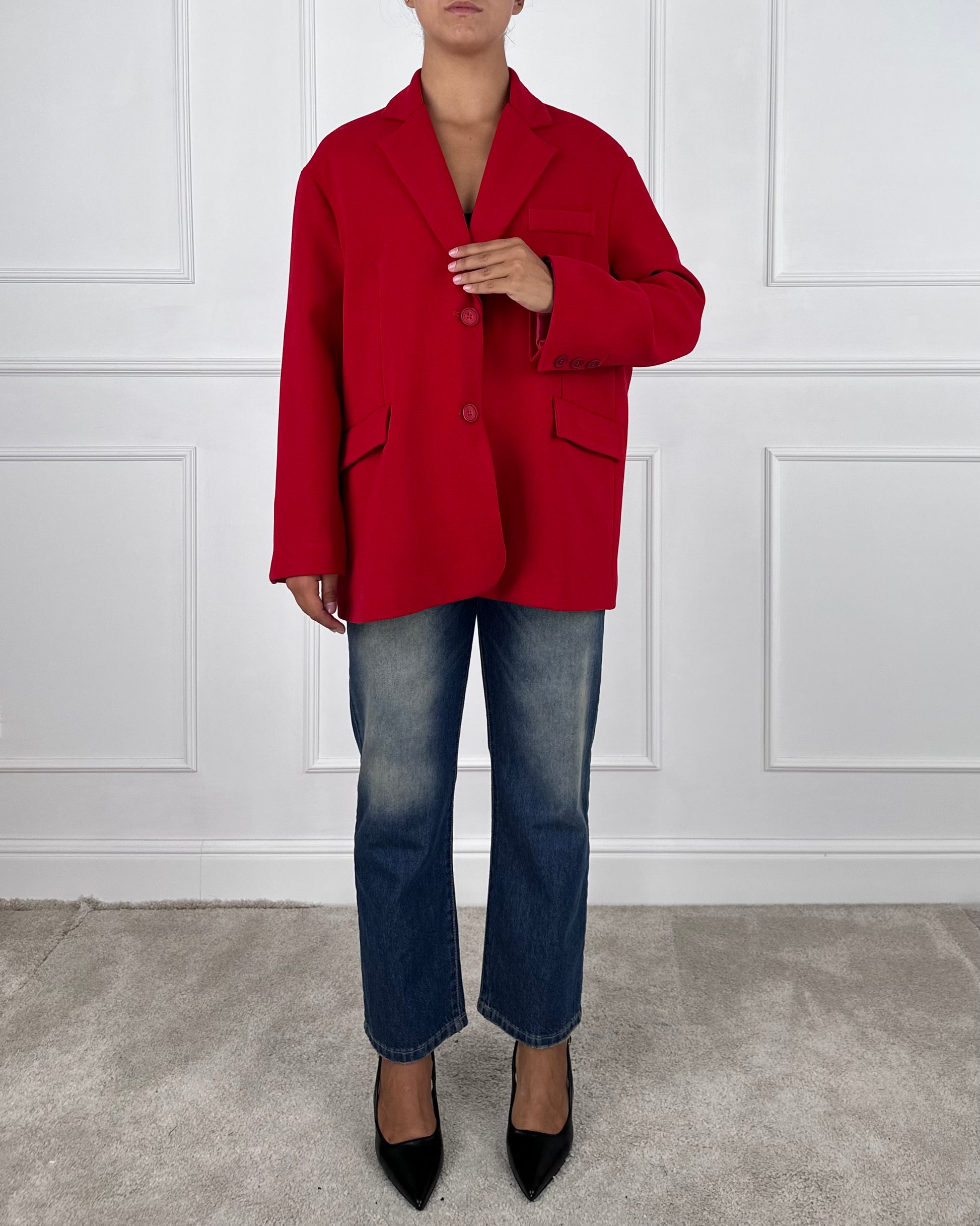 Tensione in giacca taglio over, tasche finte sul davanti con patta, chiusura con bottoni. Foderata Composizione giacca 68% Poliestere 28% Viscosa 4% Elastan Composizione fodera: