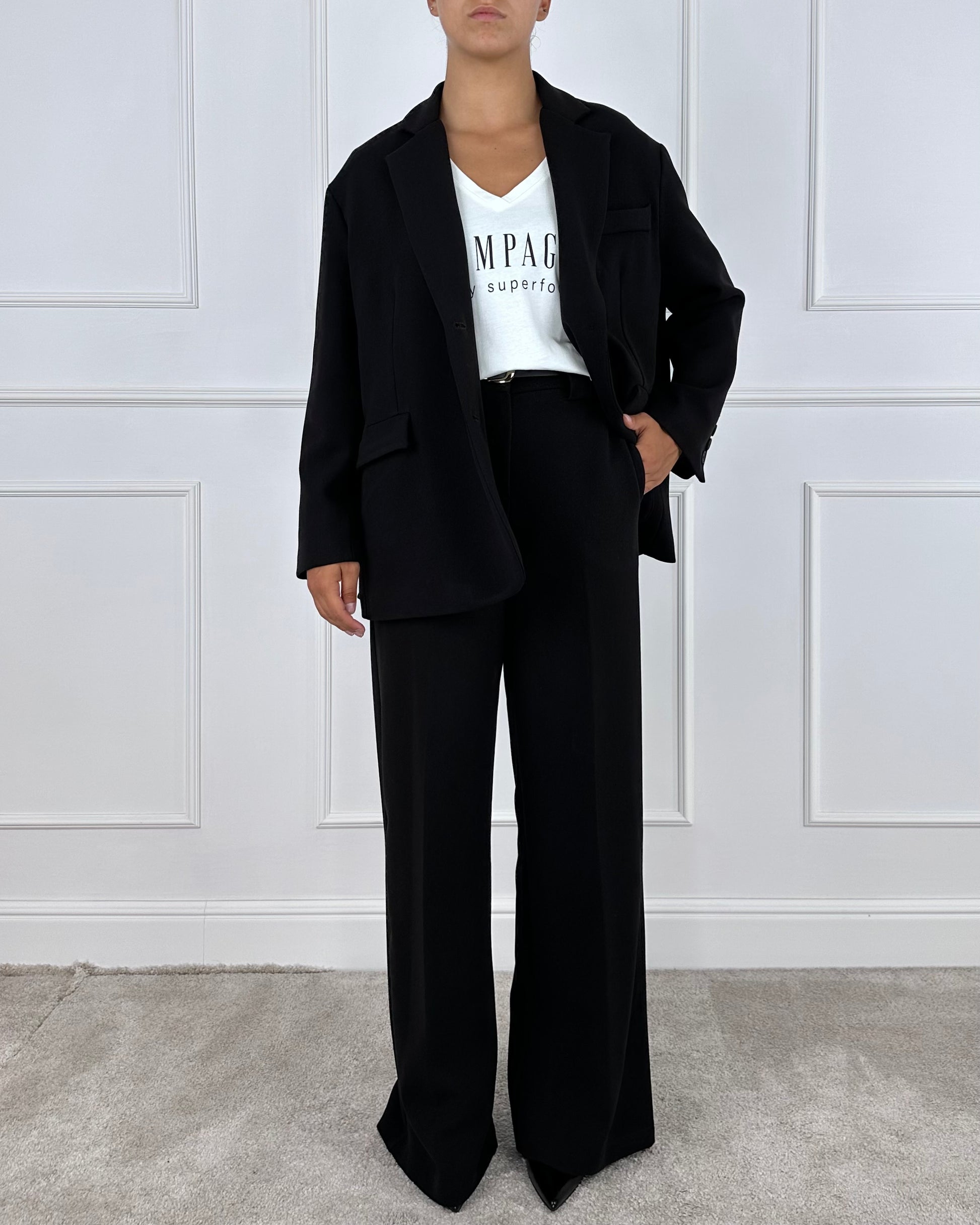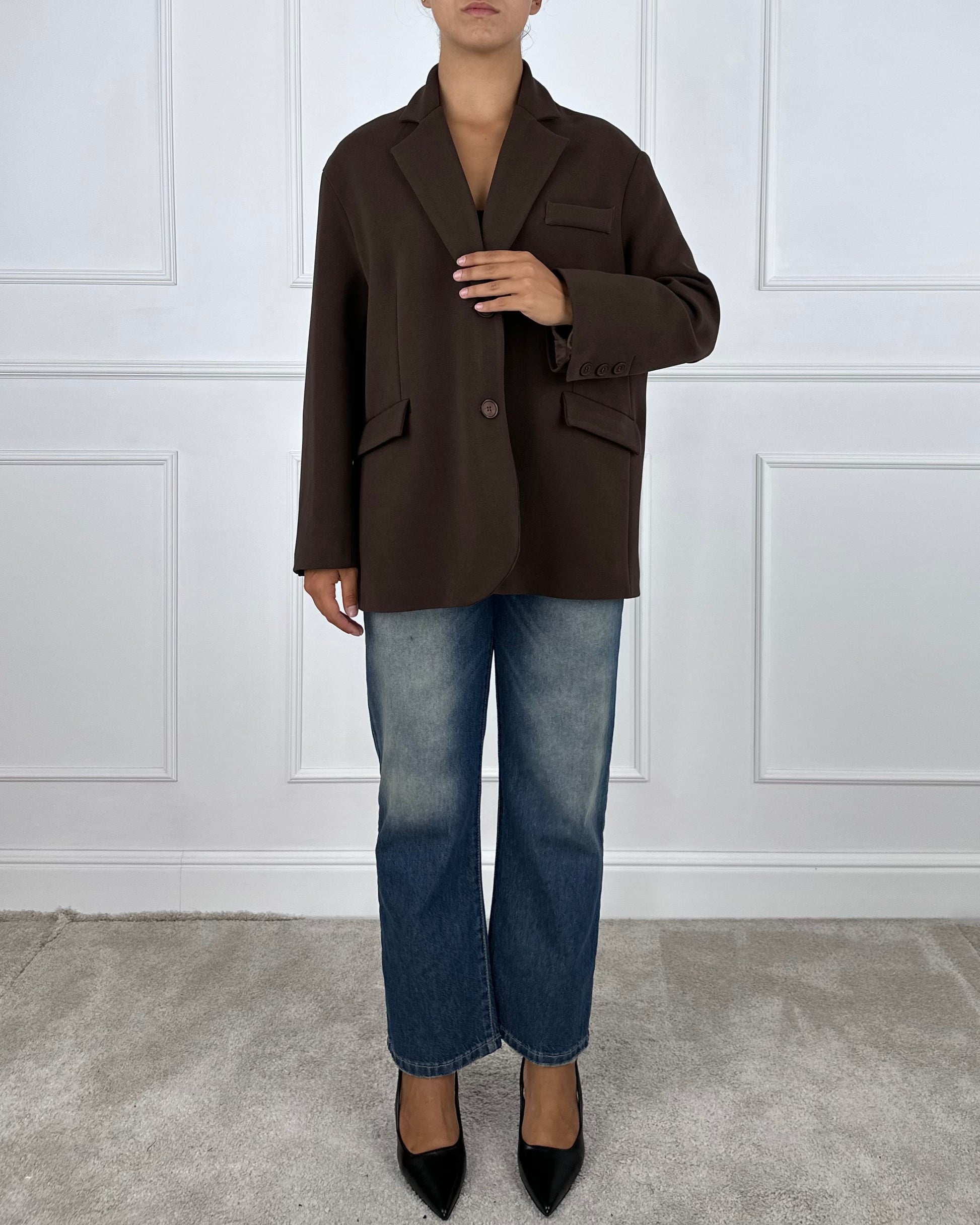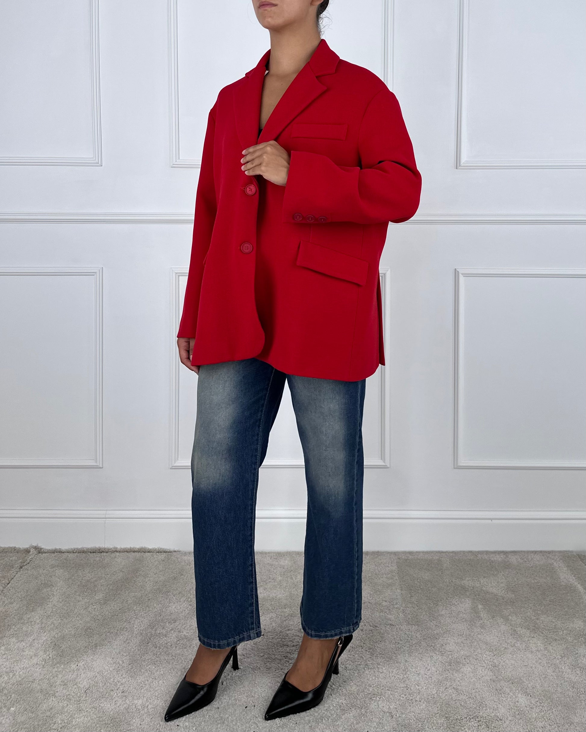 Tensione in giacca taglio over, tasche finte sul davanti con patta, chiusura con bottoni. Foderata Composizione giacca 68% Poliestere 28% Viscosa 4% Elastan Composizione fodera: