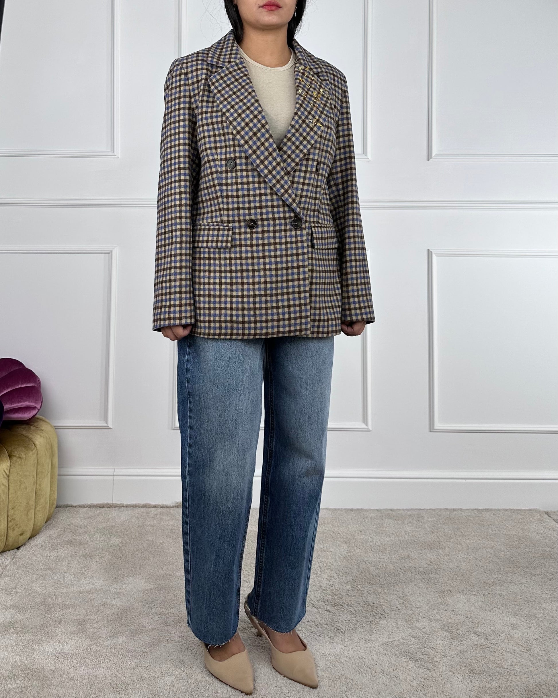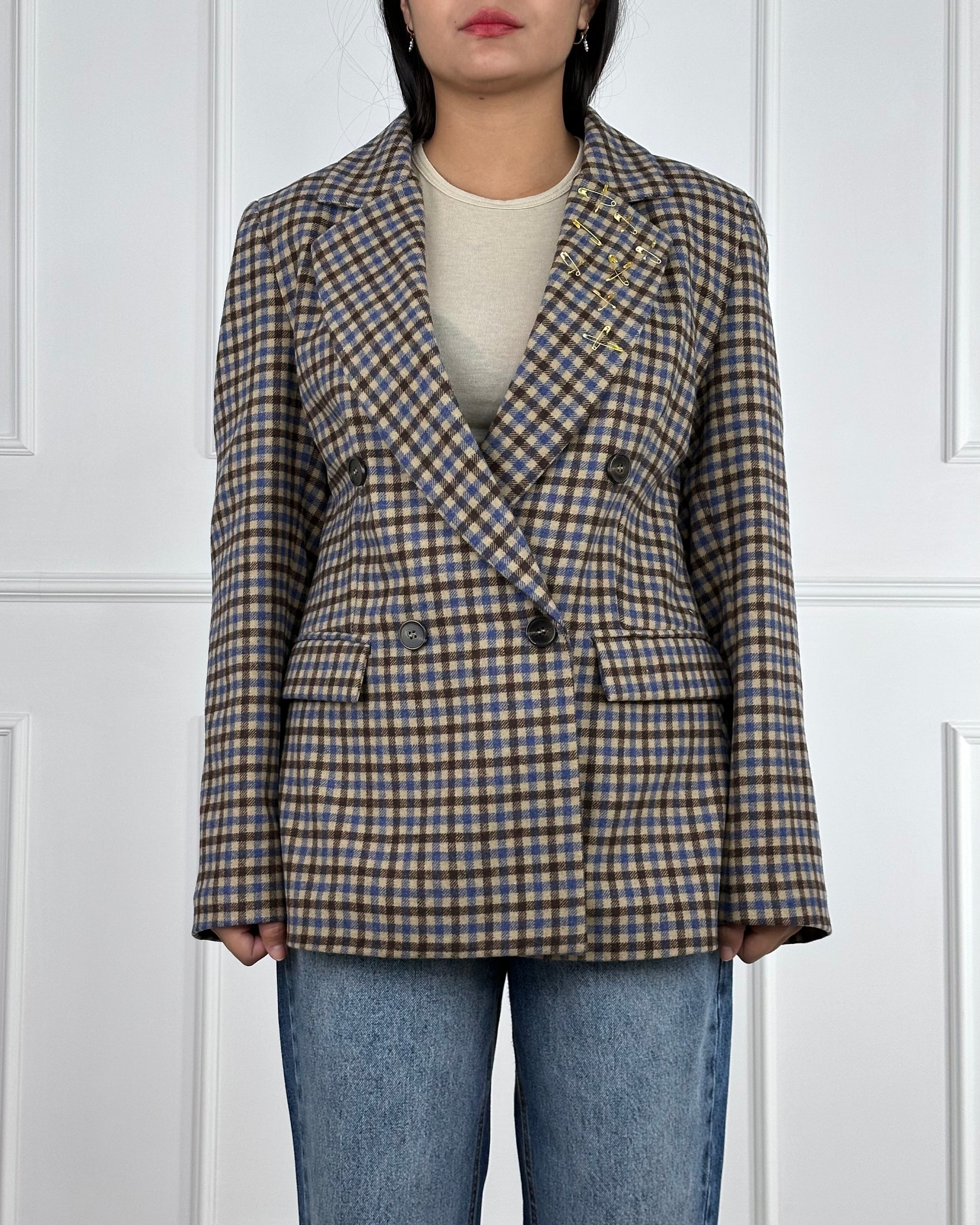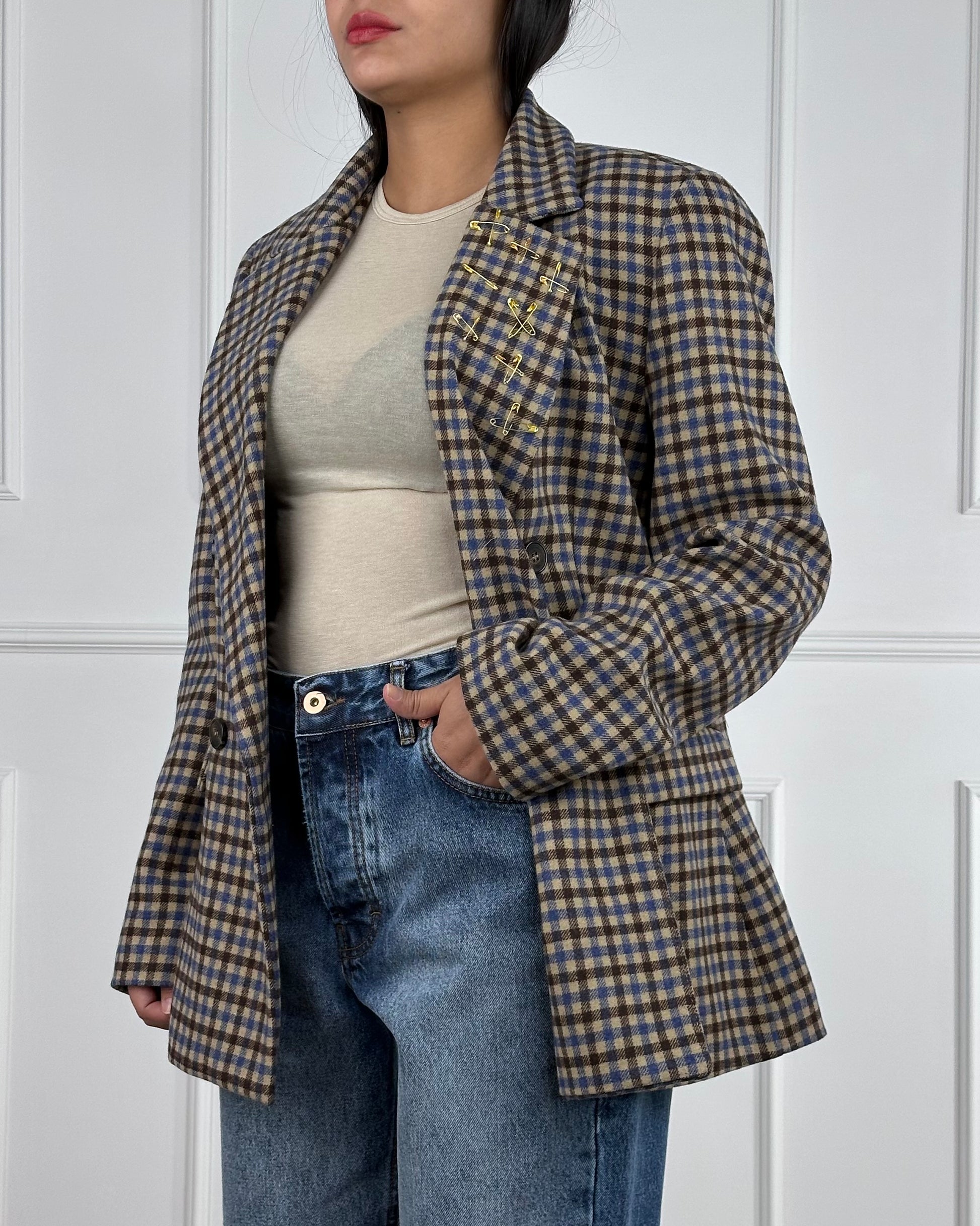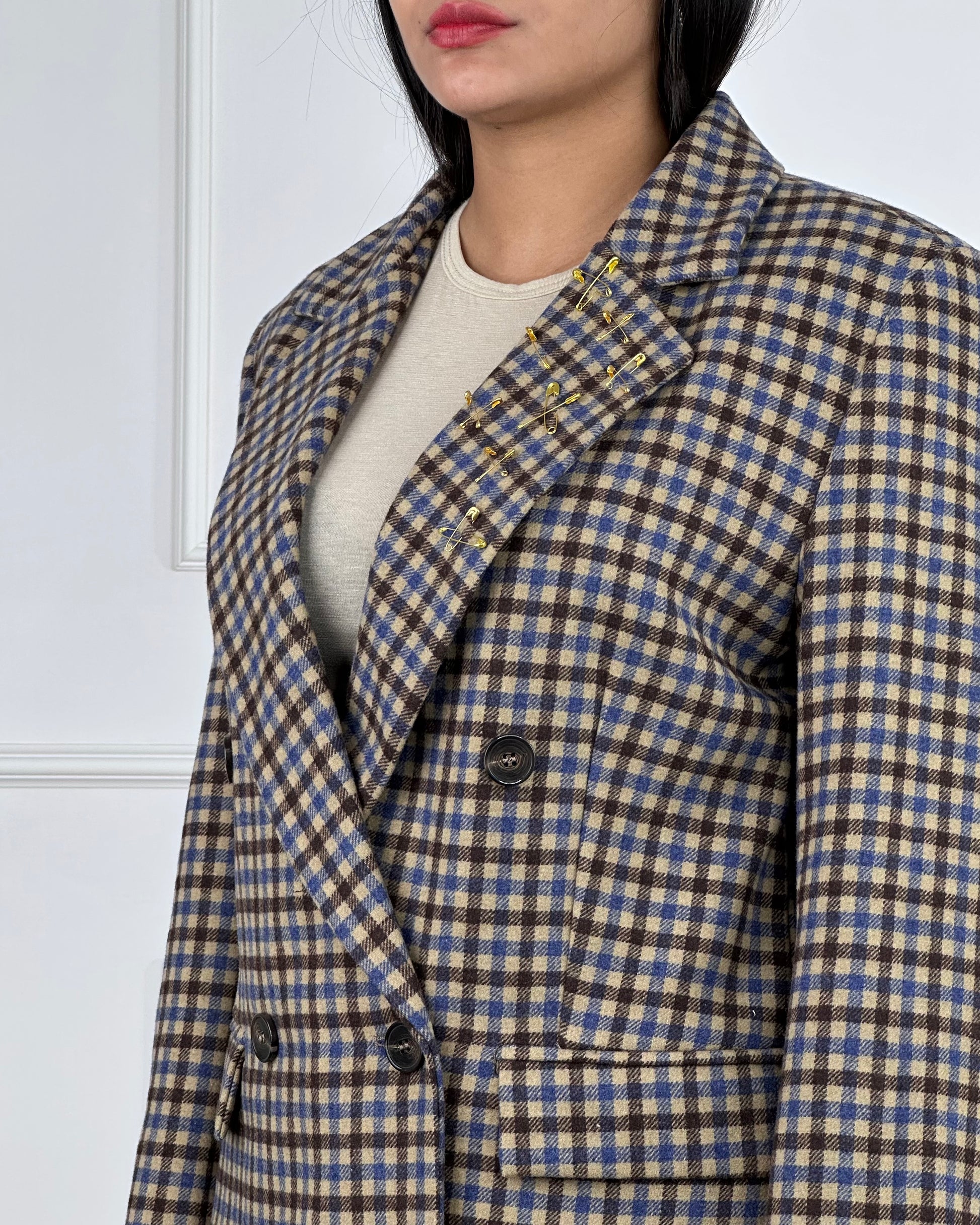 Tensione in giacca mano lana doppio petto, applicazione di spille rimovibili,chiusura con bottoni. foderata. composizione: 70%polyester 15%viscose 15%lana composizione fodera 100%polyestere