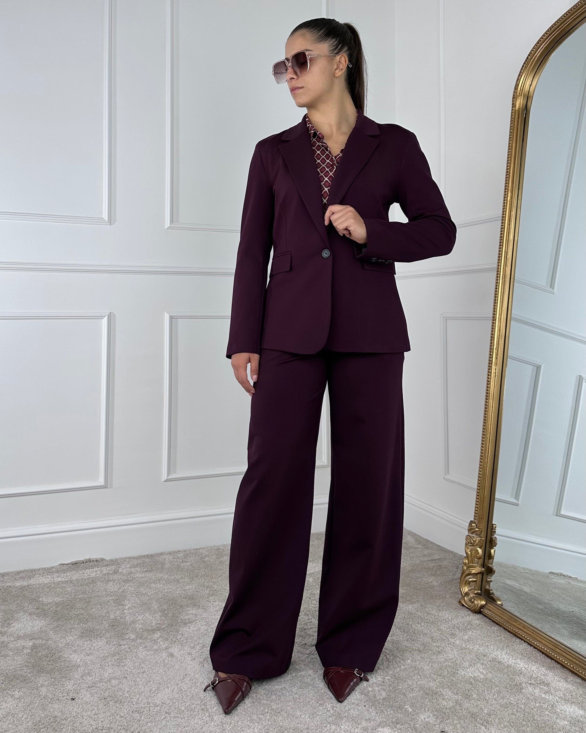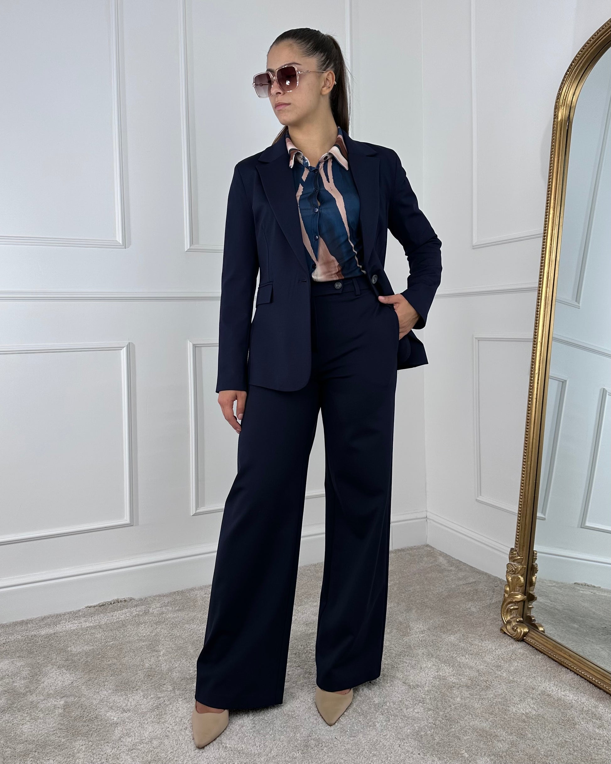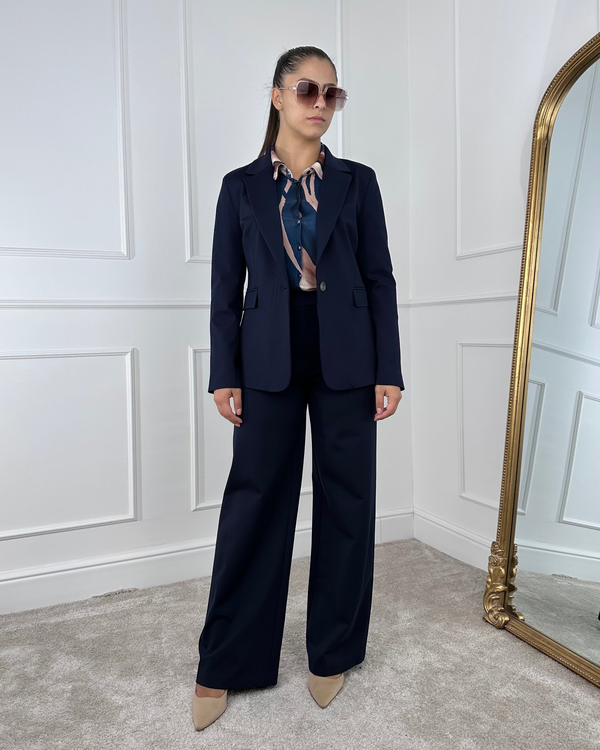 Tensione in giacca monopetto punto milano, chiusura con bottone, tasche finte con patta.
