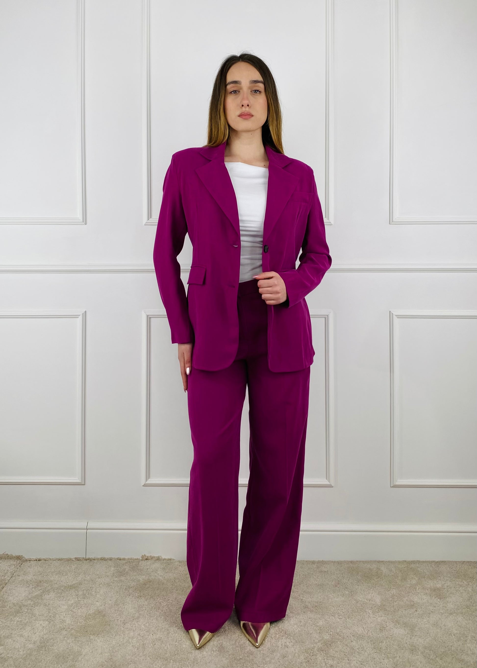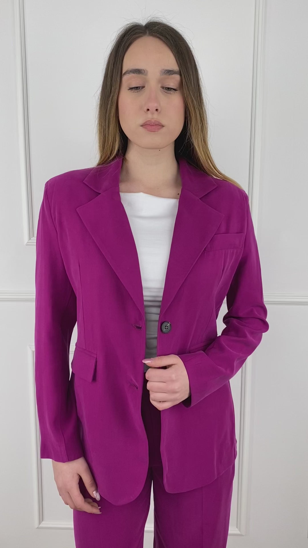 Tensione in giacca in cupro, monopetto, tasche finte sul davanti con patta. Se vuoi creare un completo è disponibile i pantalone con il codice: 26P4397. Composiizone: 94% Viscosa 6% Poliestere