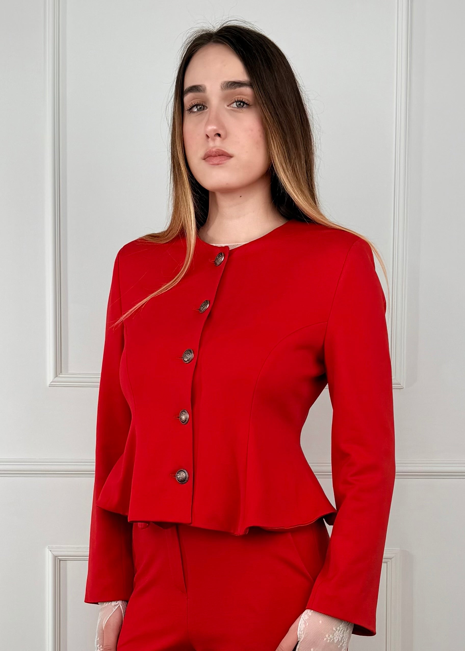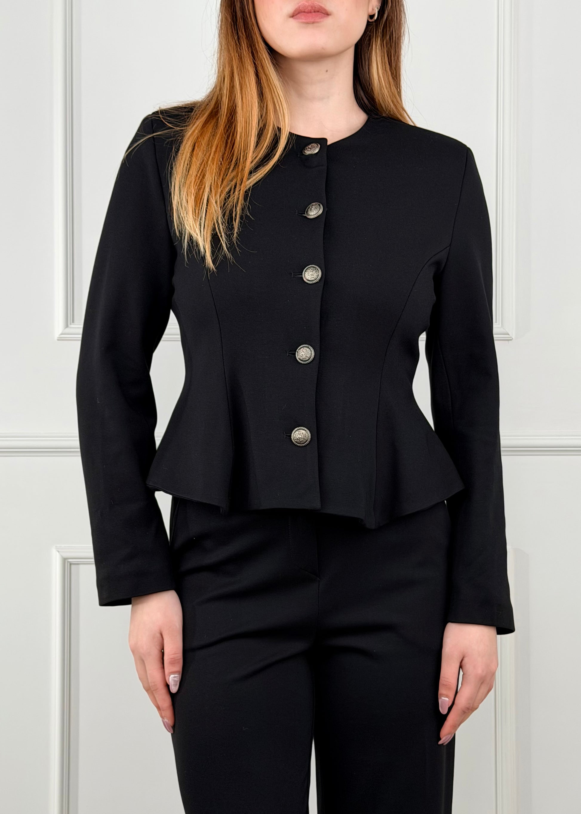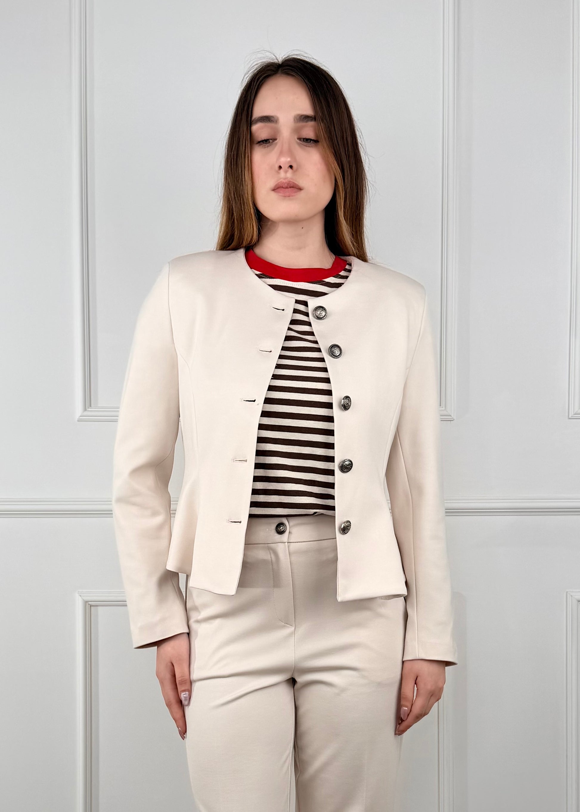 Tensione in giacca sfiancata in punto milano, collo coreano, chiusura con bottoni lavorati. Se vuoi creare un completo è disponibile il pantalone con il codice: 26P441 Composizione: 62% Viscosa 32% Polyamide 3% Elastan Composizione fodera: 10