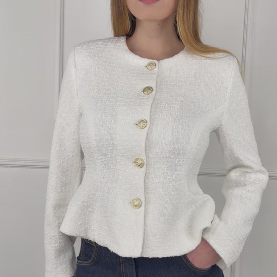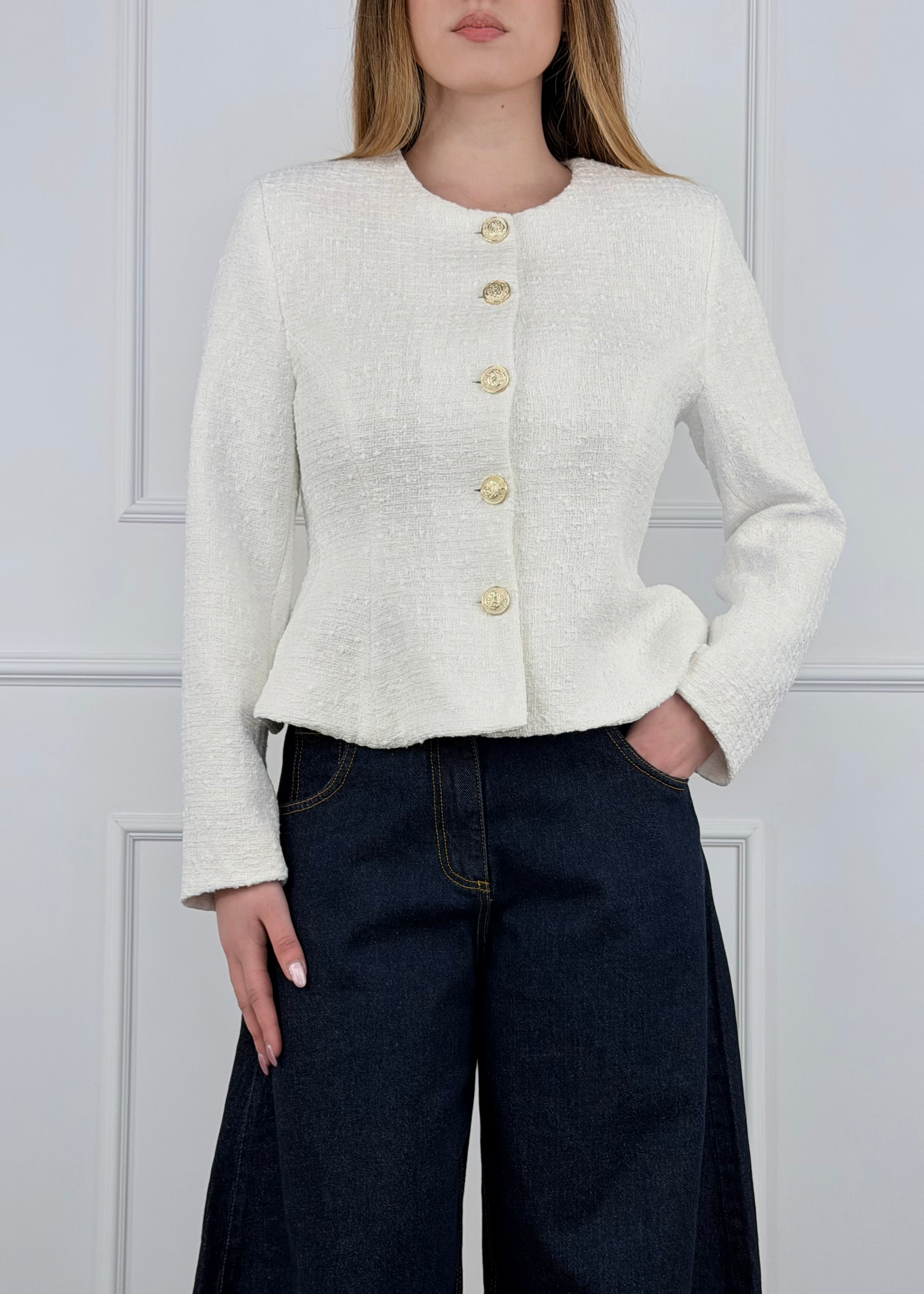Tensione in giacca bouclè sfiancata, chiusura con bottoni oro. Foderata Composizione: 74% Cotone 26% Poliestere Composizione fodera: 100% poliestere