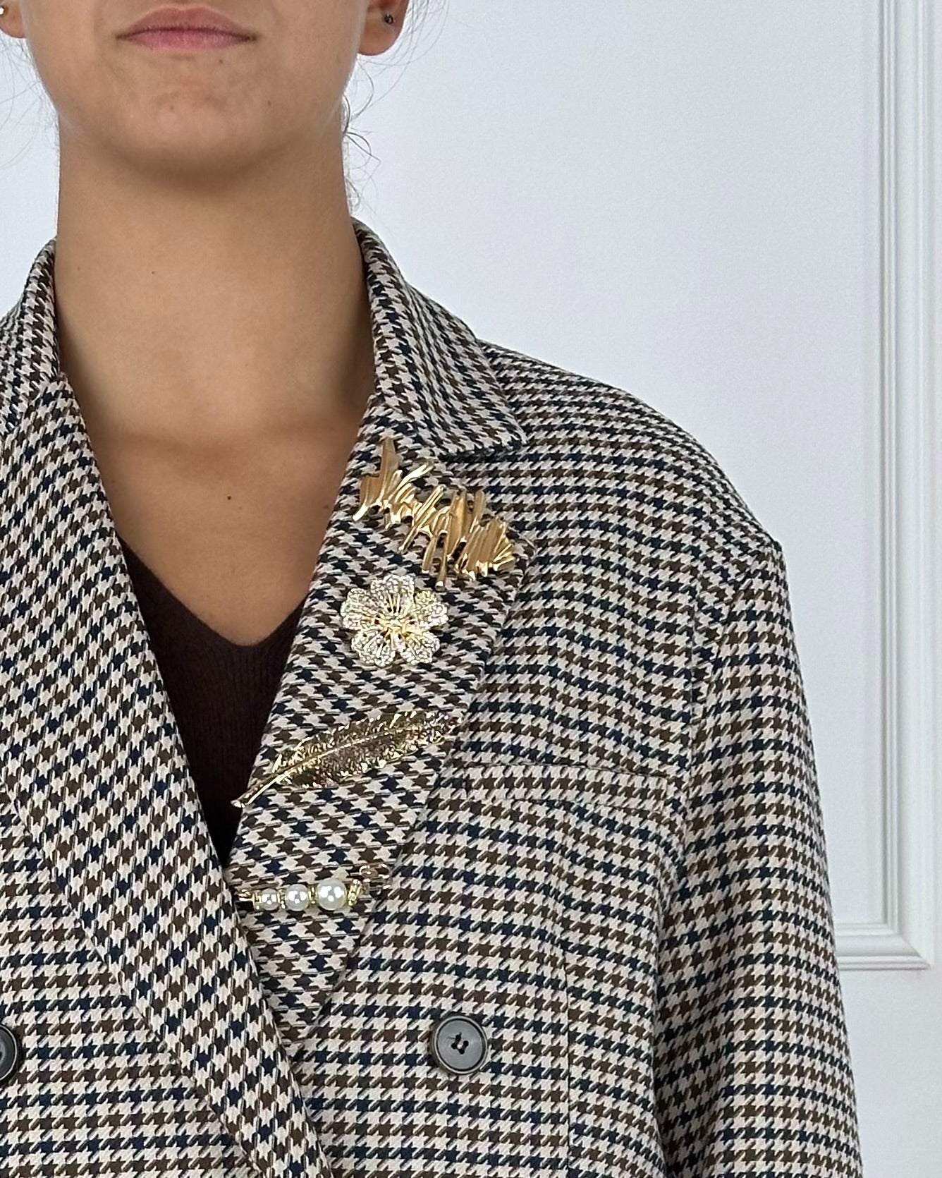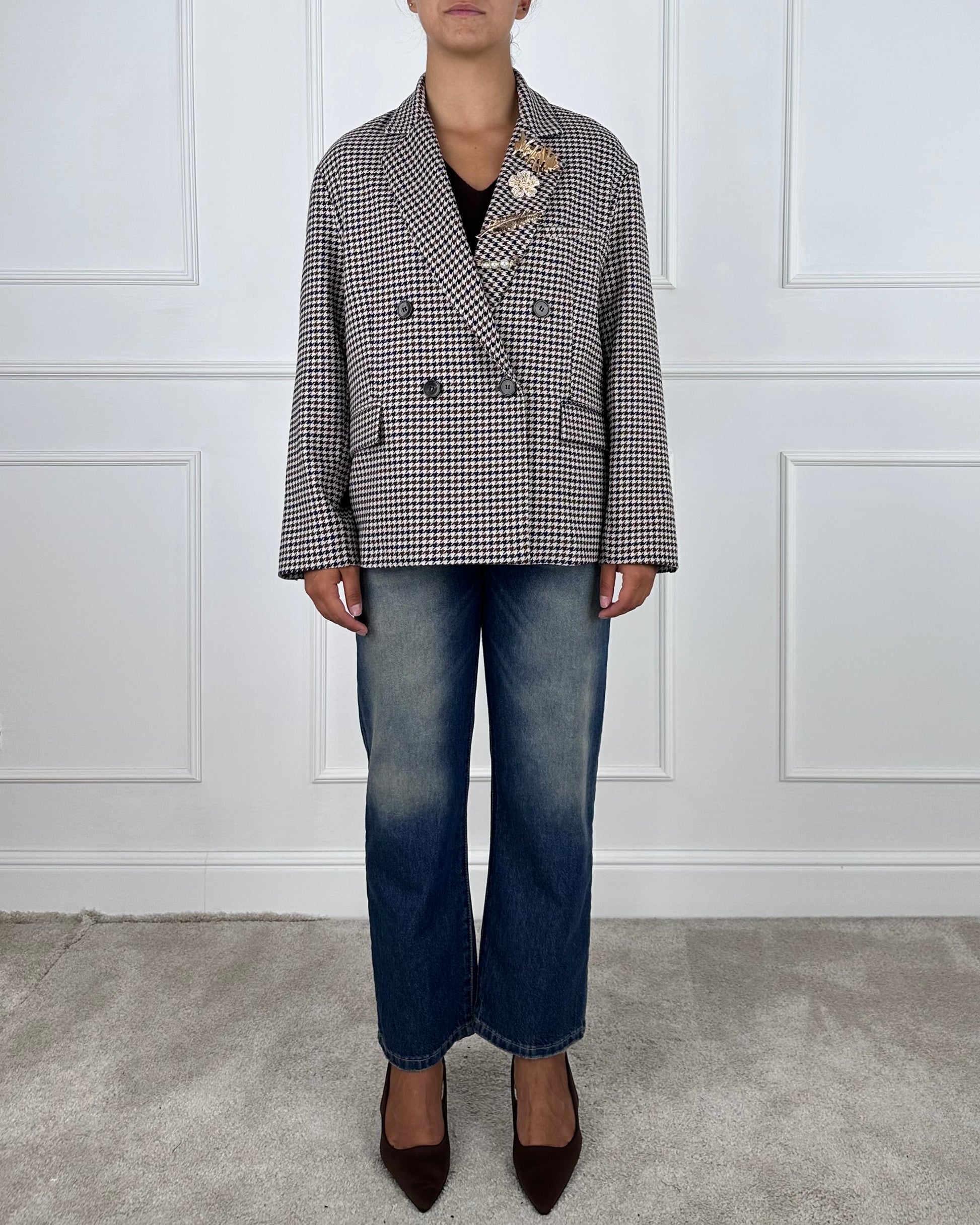 Tensione in giacca doppio petto pied de poule, spille rimovibili, tasche sul davanti con patta. Foderata. Composizione giacca: 80% Poliestere 18% Viscosa 2% Elastan Composizione fodera: 100% Poliestere
