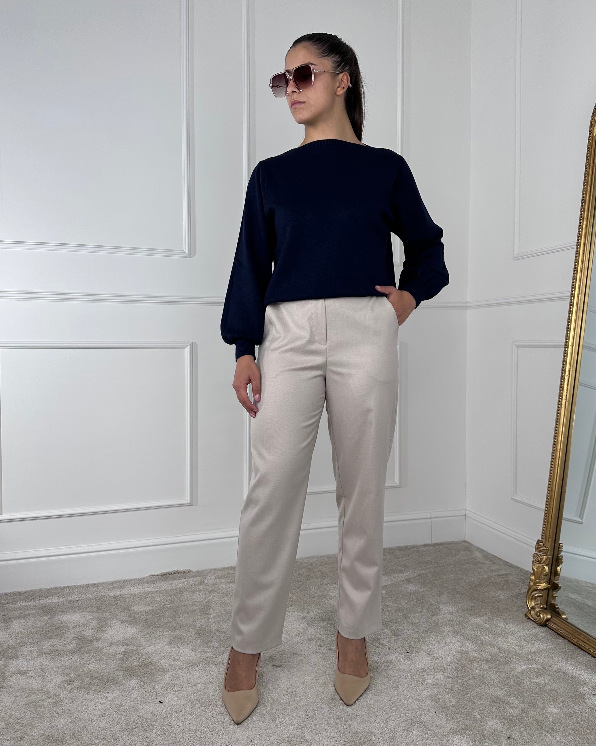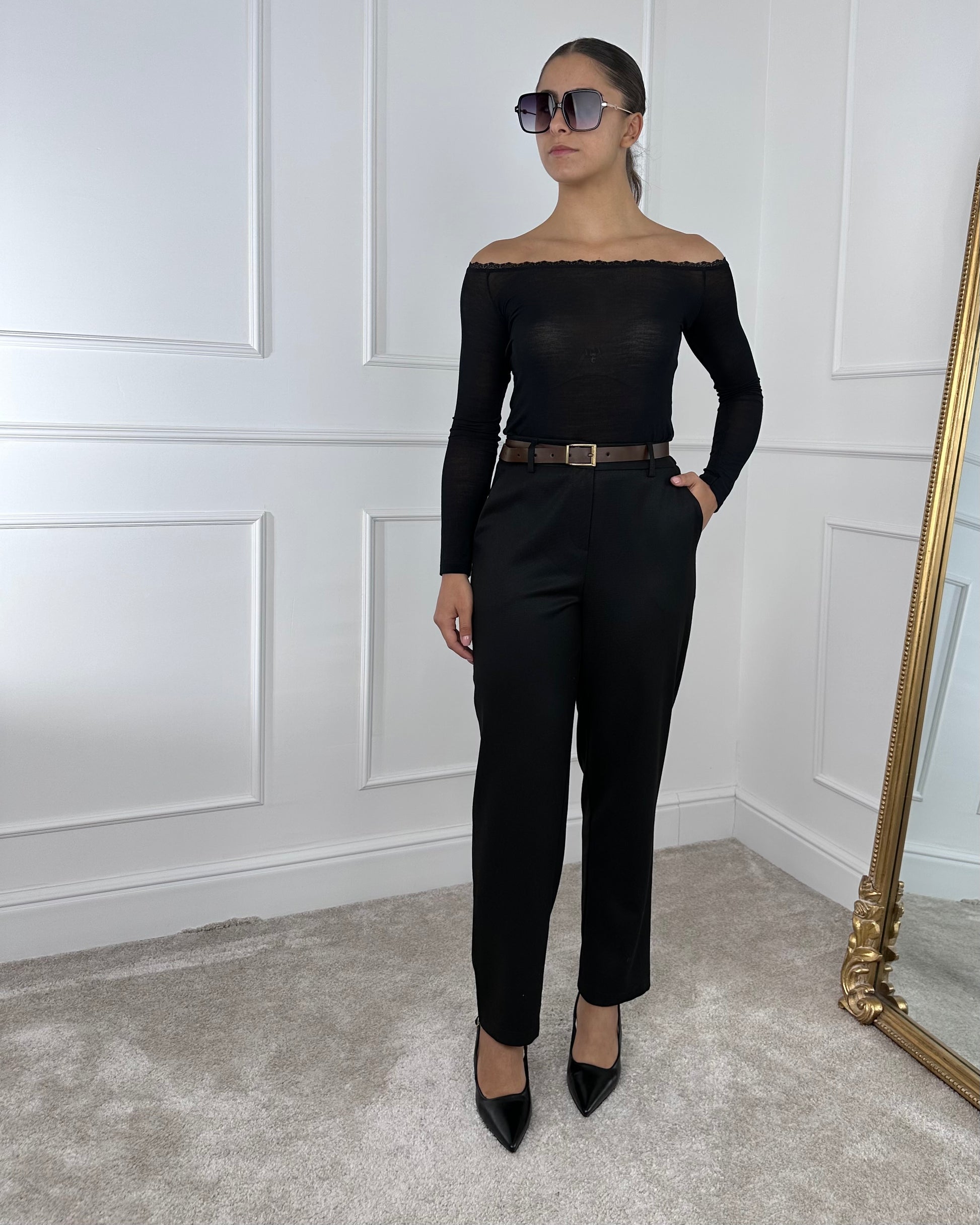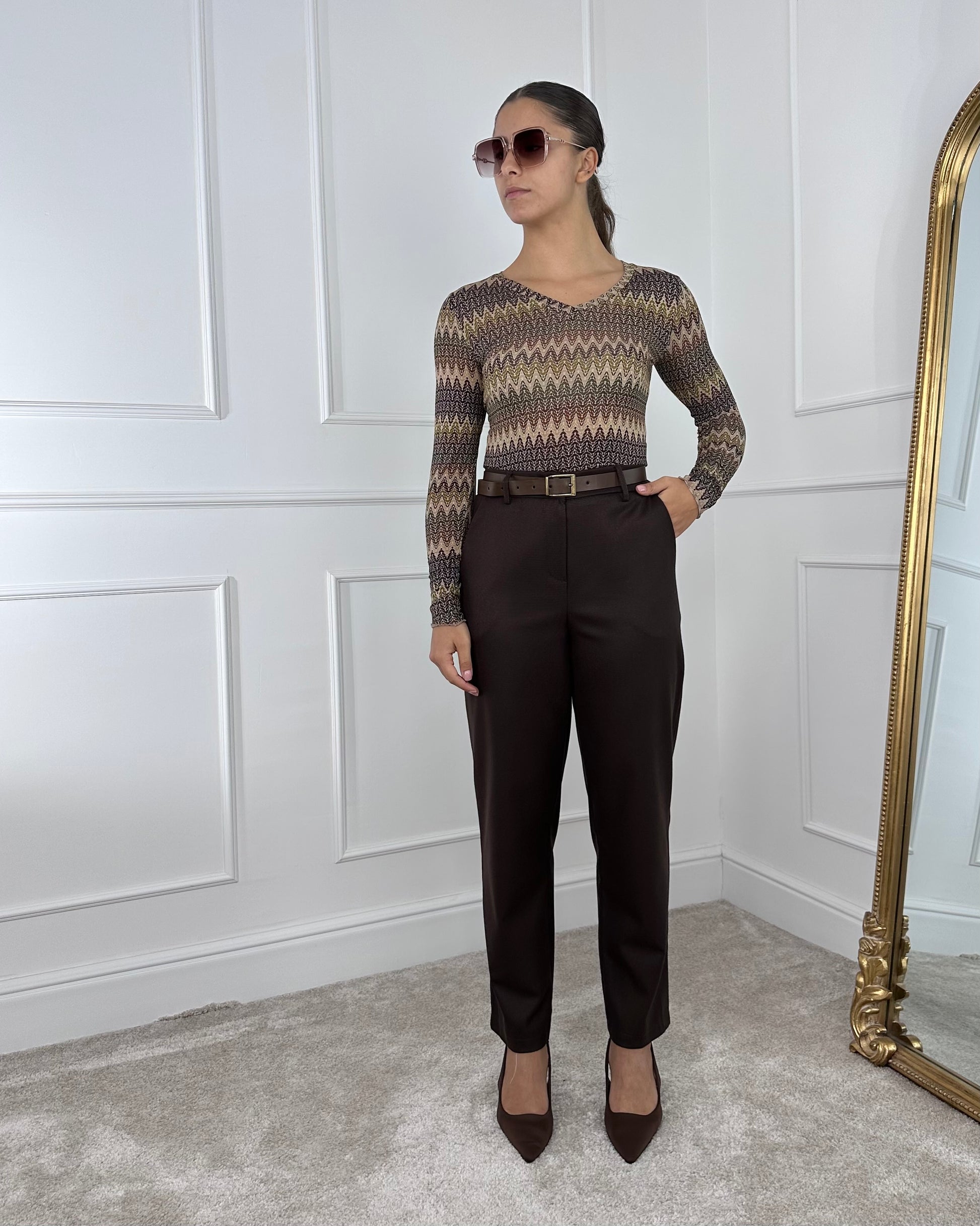Tensione in pantalone sigaretta,elastico in vita sul retro , chiusura con bottone e zip nascosta, dotato di passanti e cintura in vita,. Composizione: 65% Poliestere 32% Viscosa 3% Elastan
