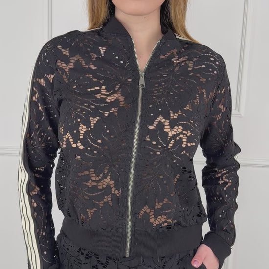 Completo bomber e pantalone in pizzo. Bomber in pizzo chiusura con zip, lavorazione a costine sul fondo, sulla manica, e sul collo. Pantalone in pizzo, elastico in vita, bande laterali. Composizione: