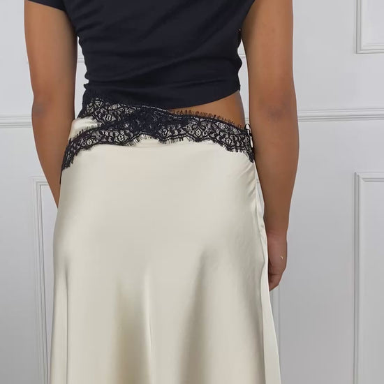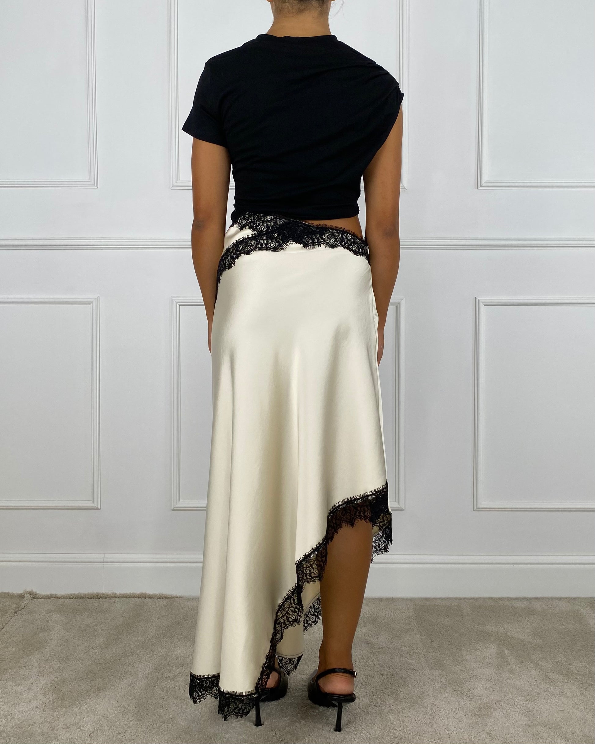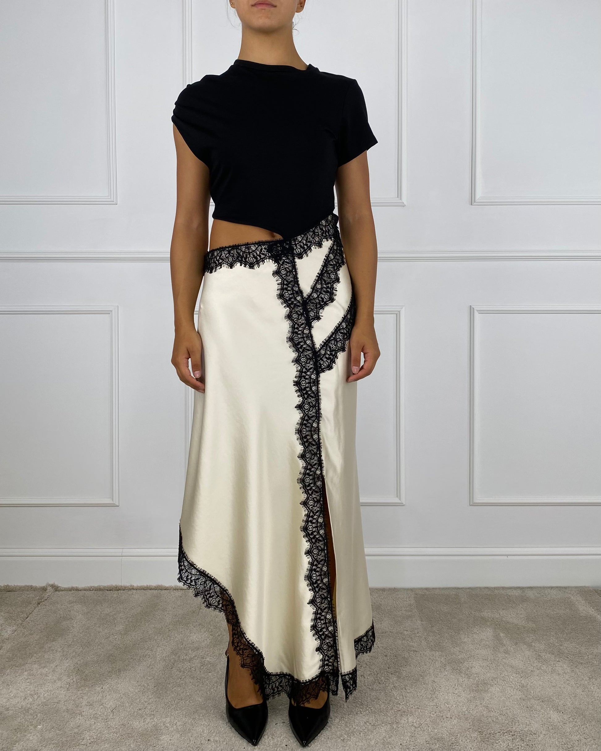 Tensione in abito cut out, doppio tessuto, inserti in pizzo, chiusura con zip laterale. Composizione maglia: 100% cotone composizione gonna 100% Poliestere