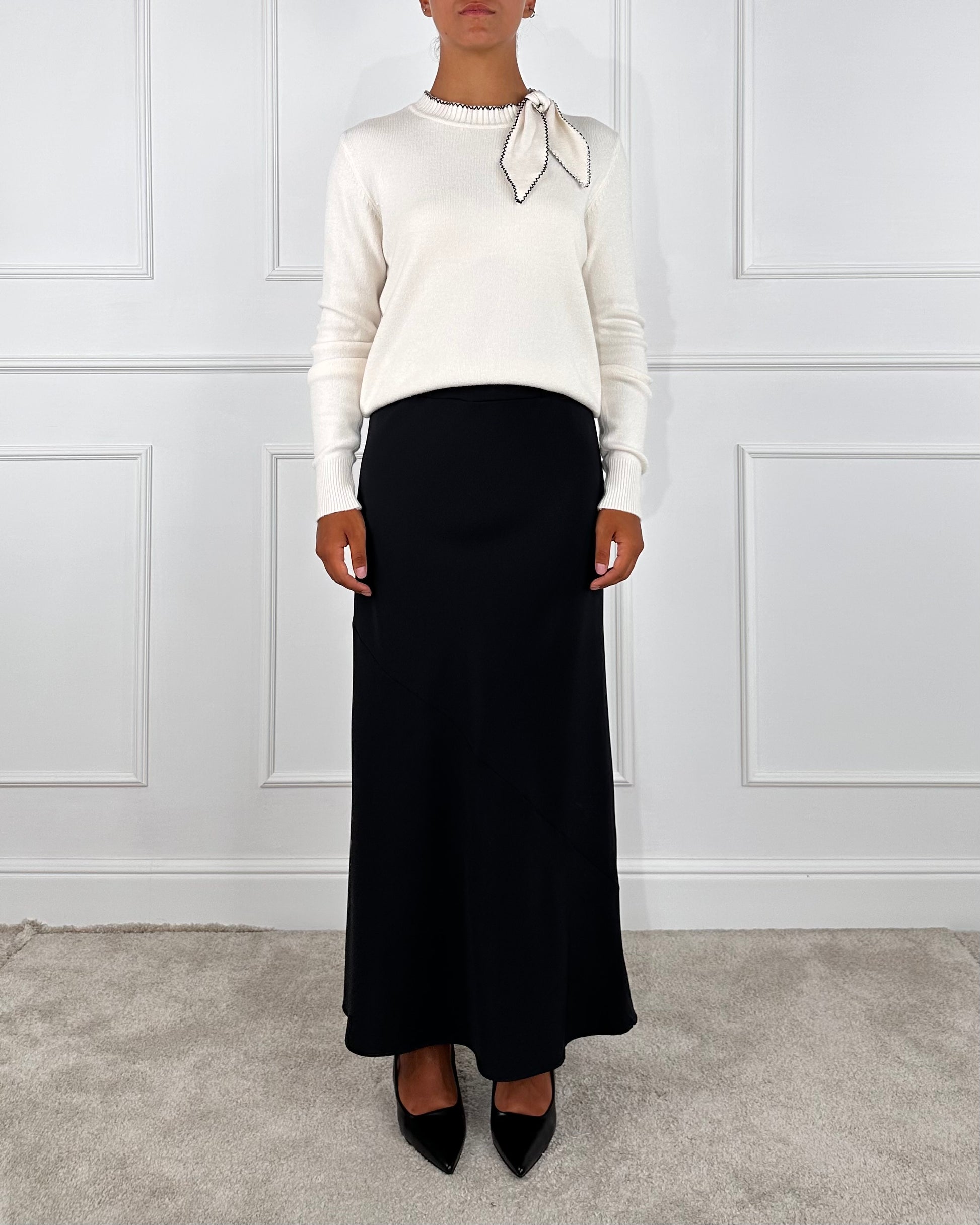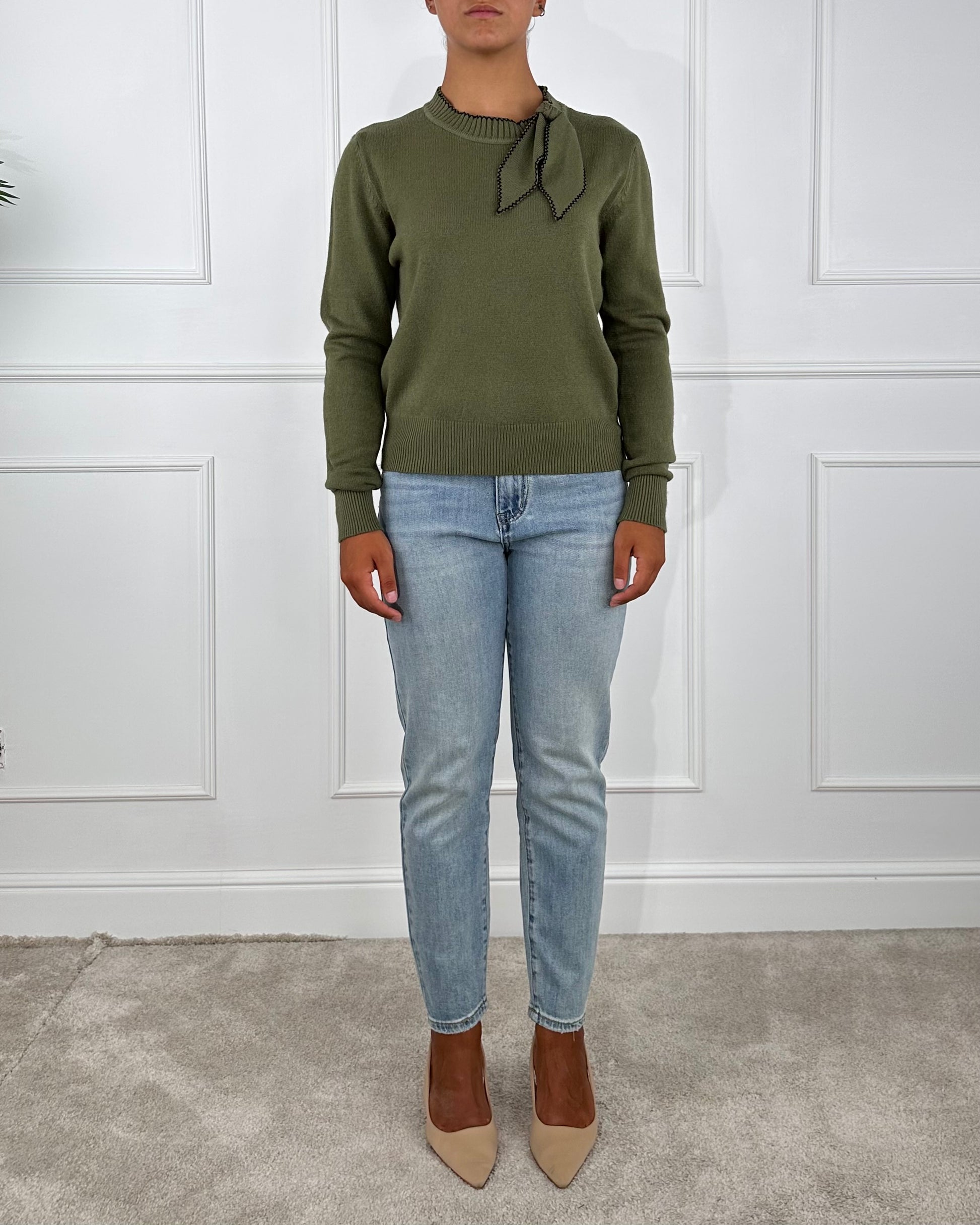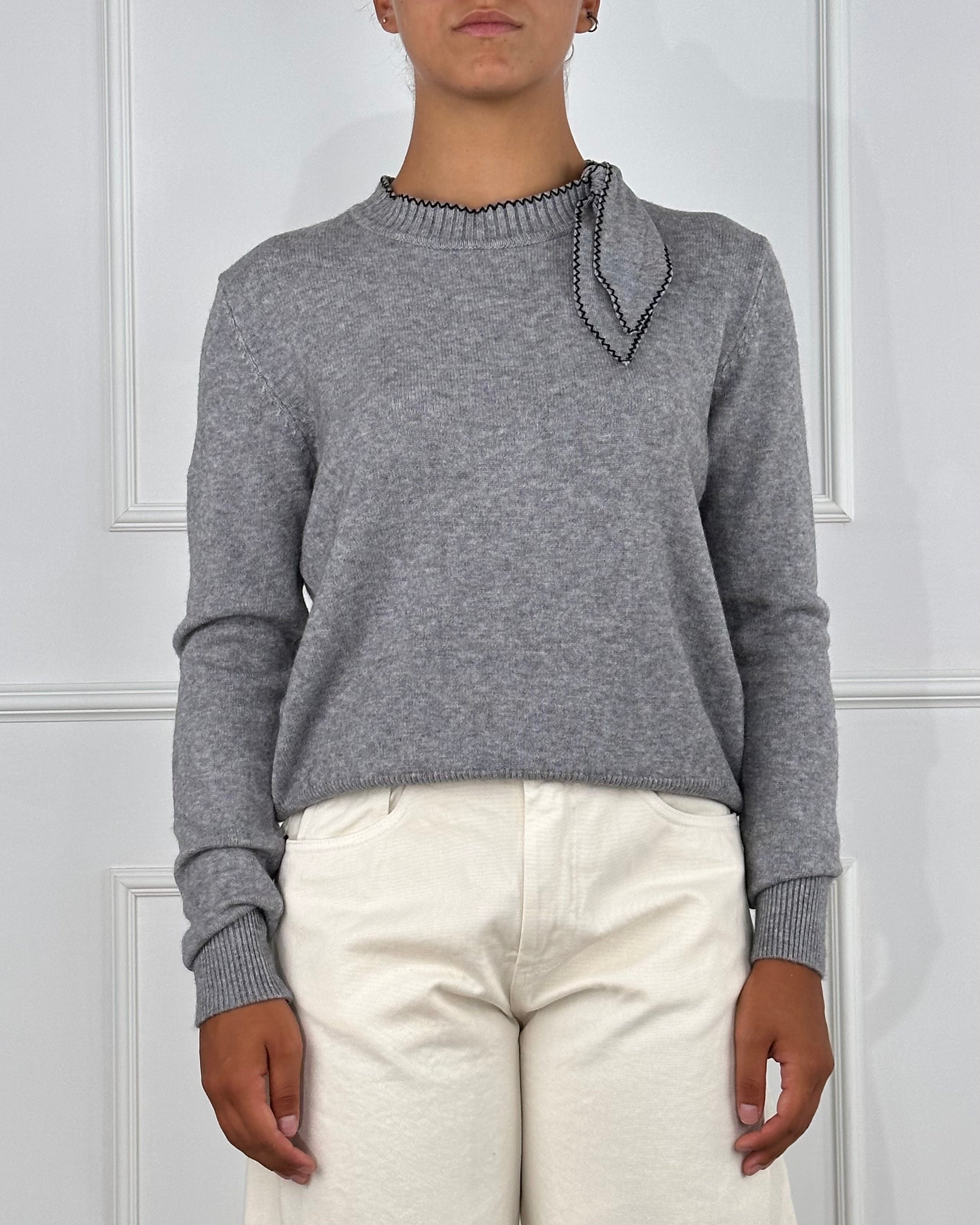 Maglia scollo giro con chiusura fiocco, impunture a contrasto. Composizione: 45% Viscosa 30% Poliamidica 25% Micro fibra