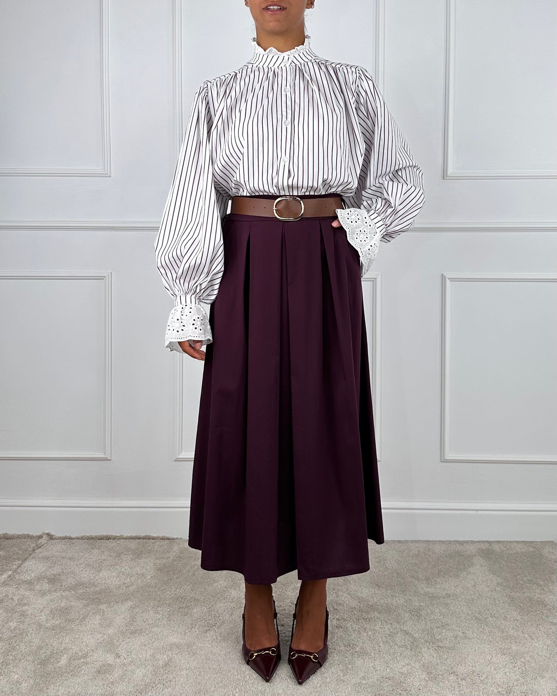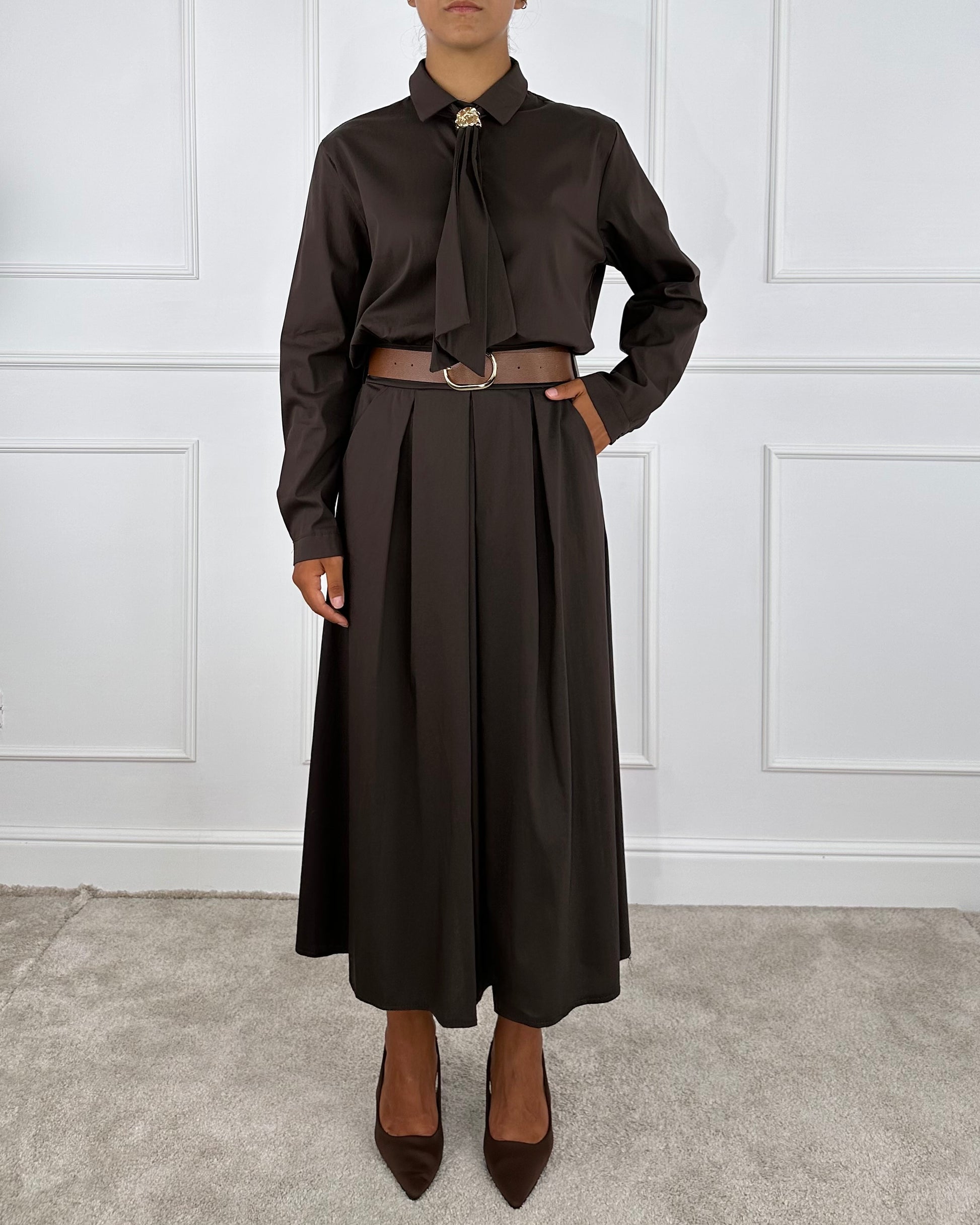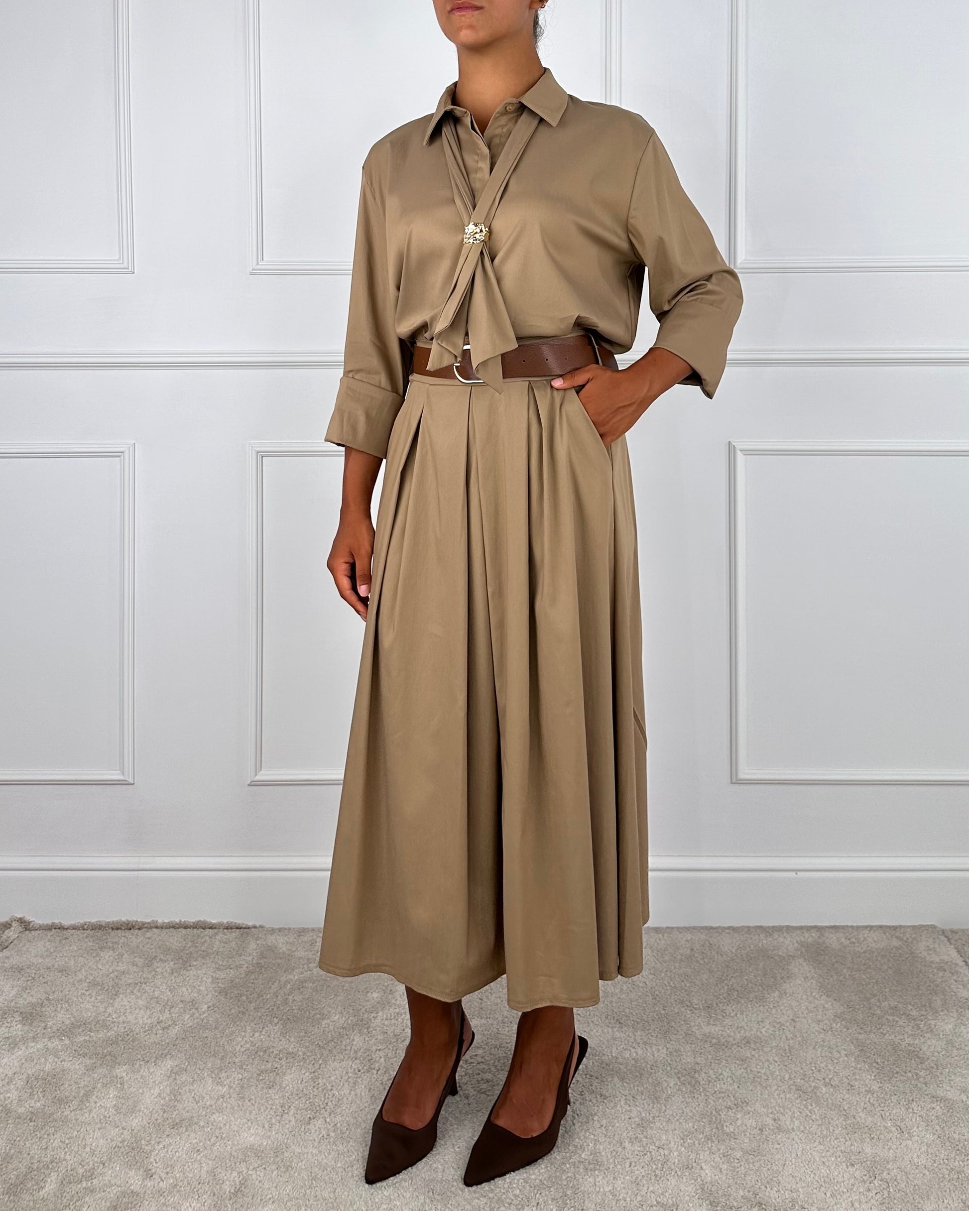 Gonna , elastico in vita sul retro, dotata di passanti e cintura, tasche a filo.