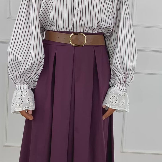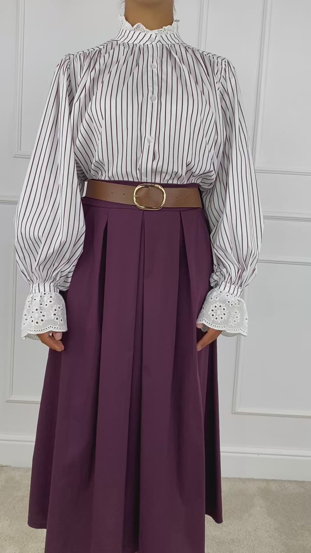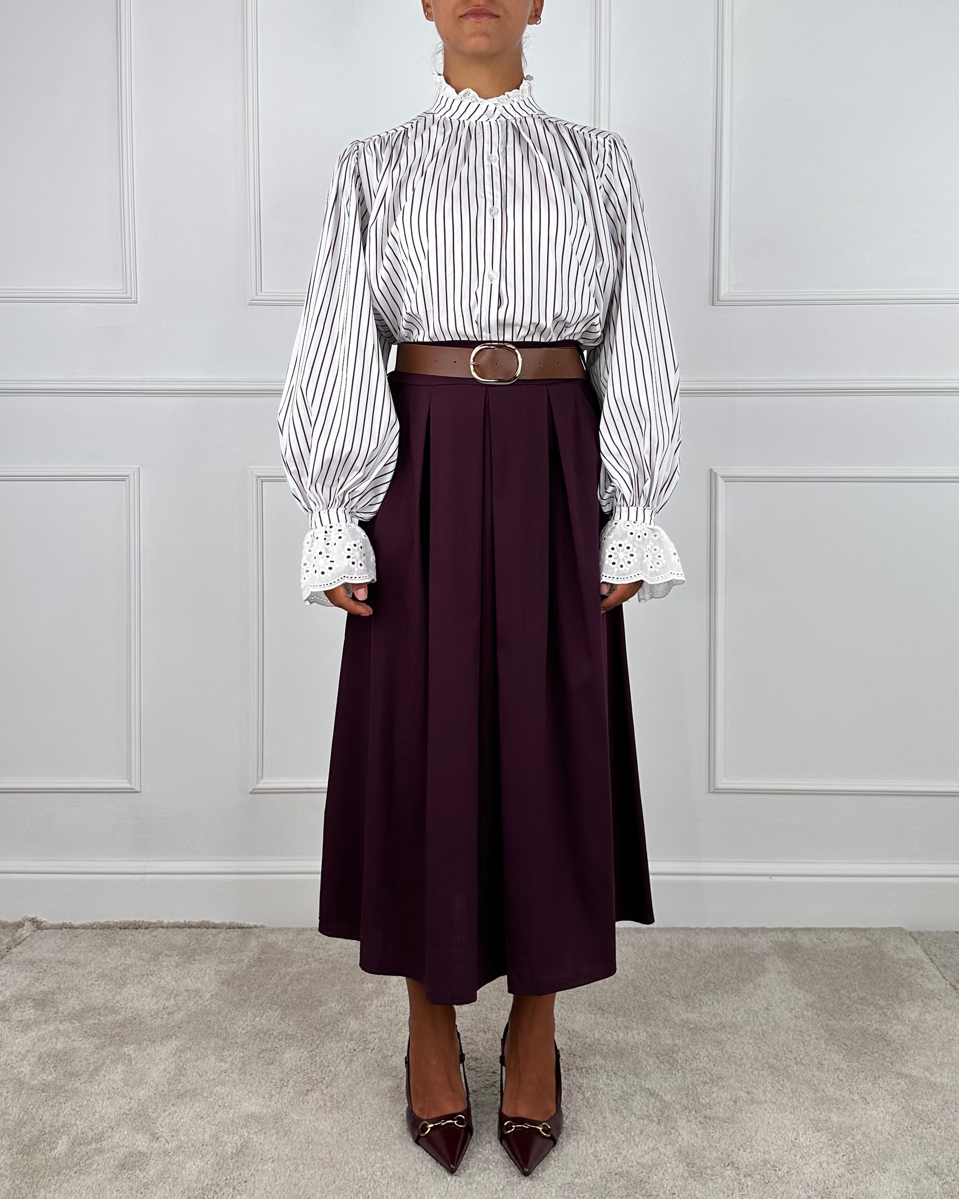 Gonna , elastico in vita sul retro, dotata di passanti e cintura, tasche a filo.