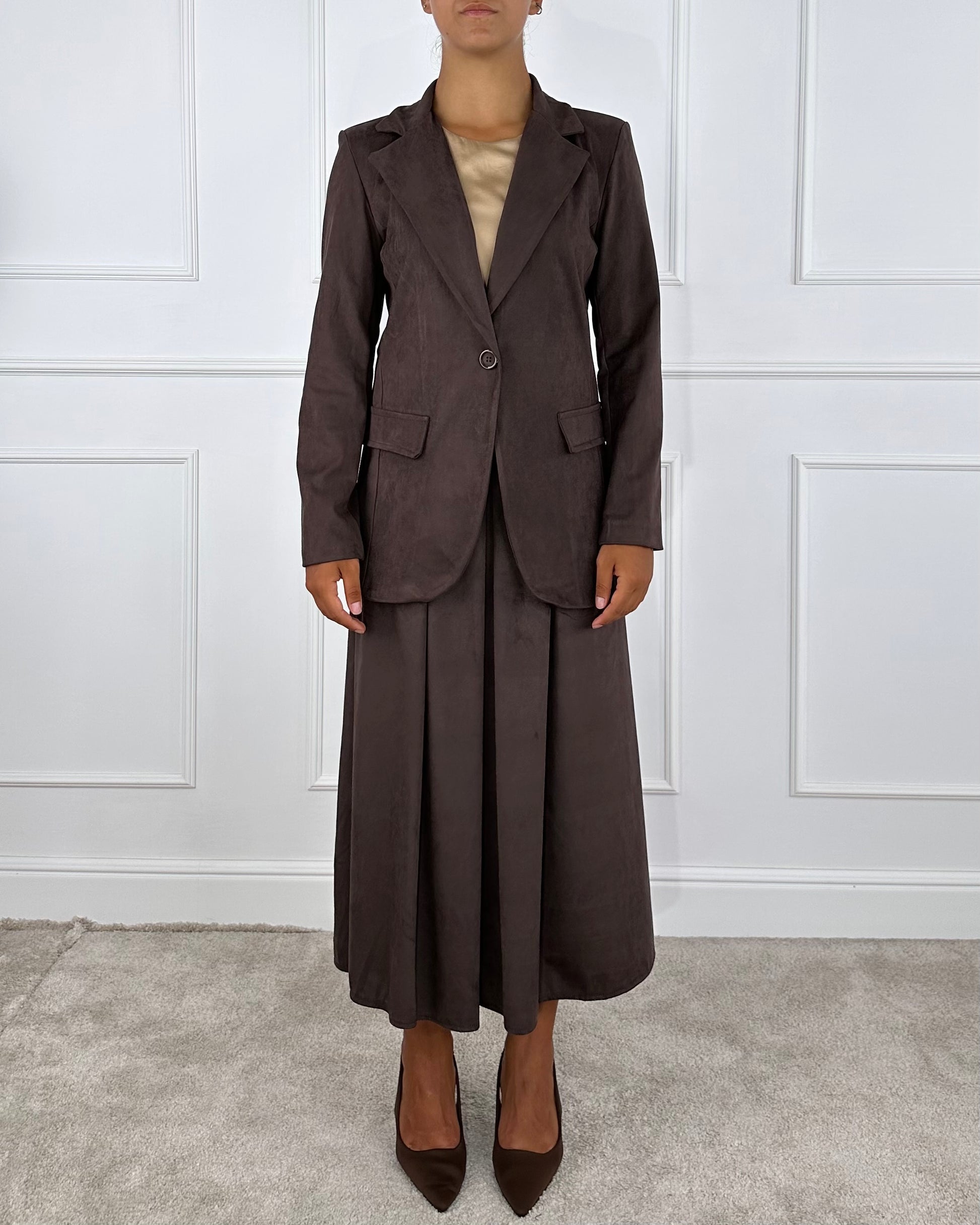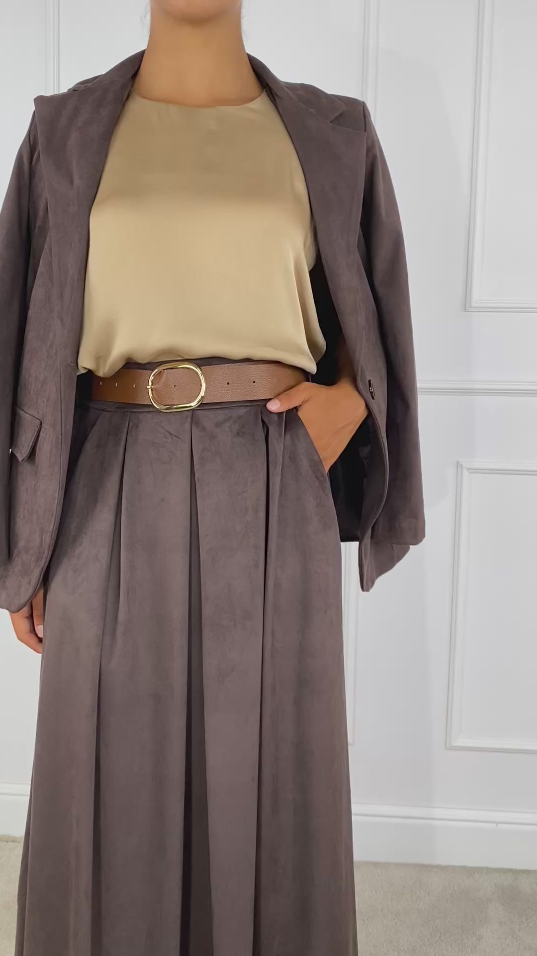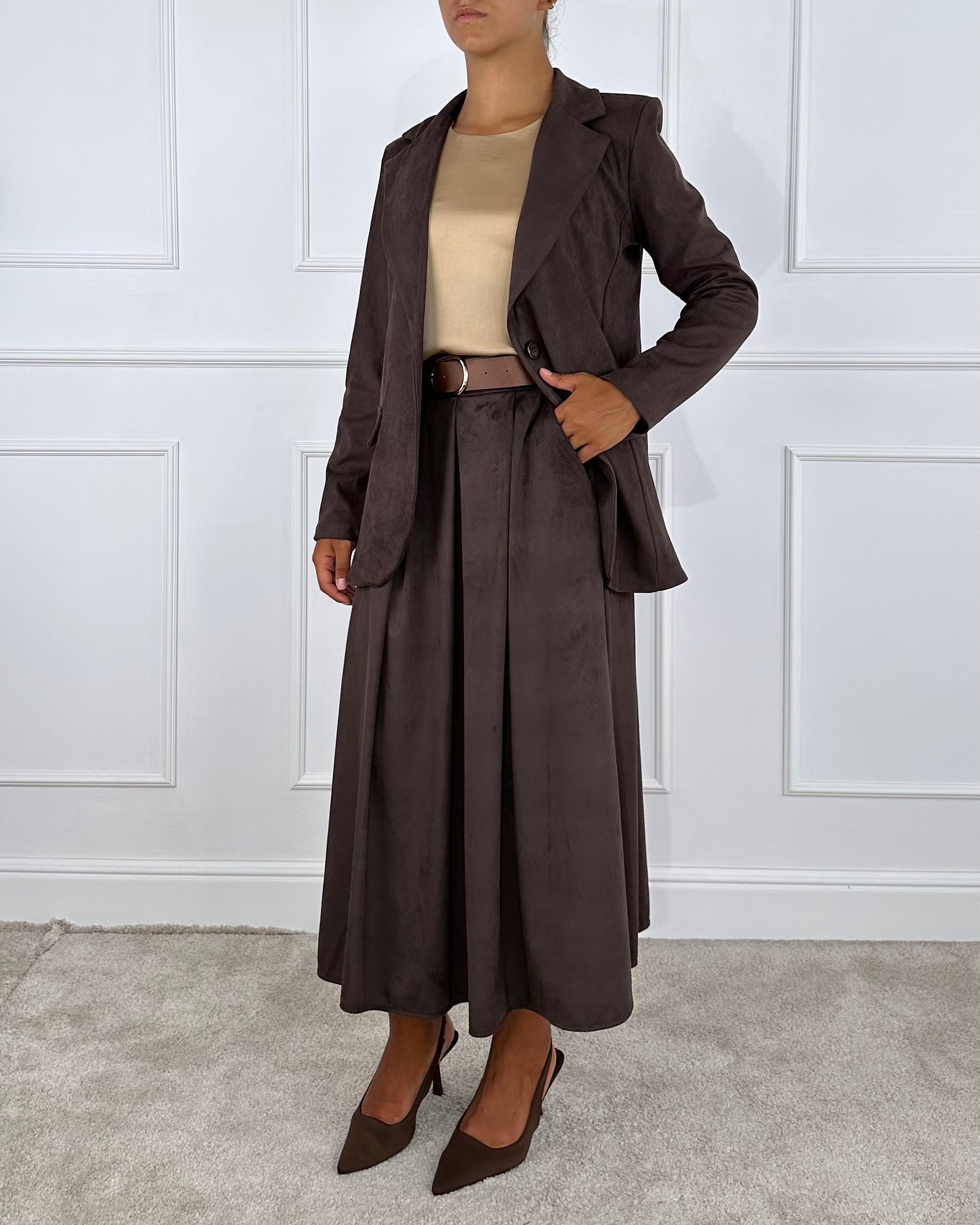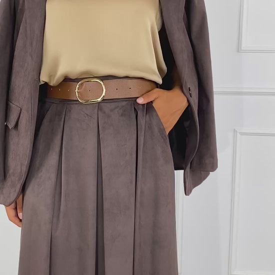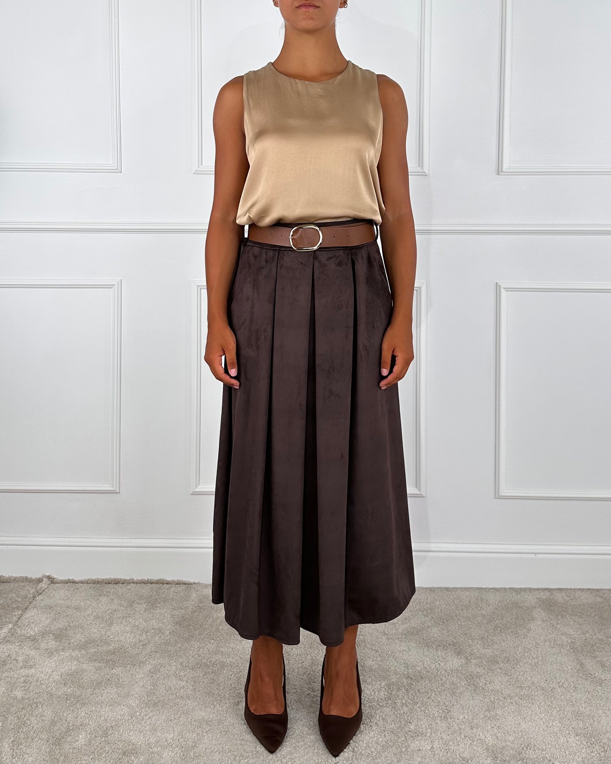 Gonna midi effetto effetto suède, elastico in vita sul retro, dotata di passanti e cintura, tasche a filo.