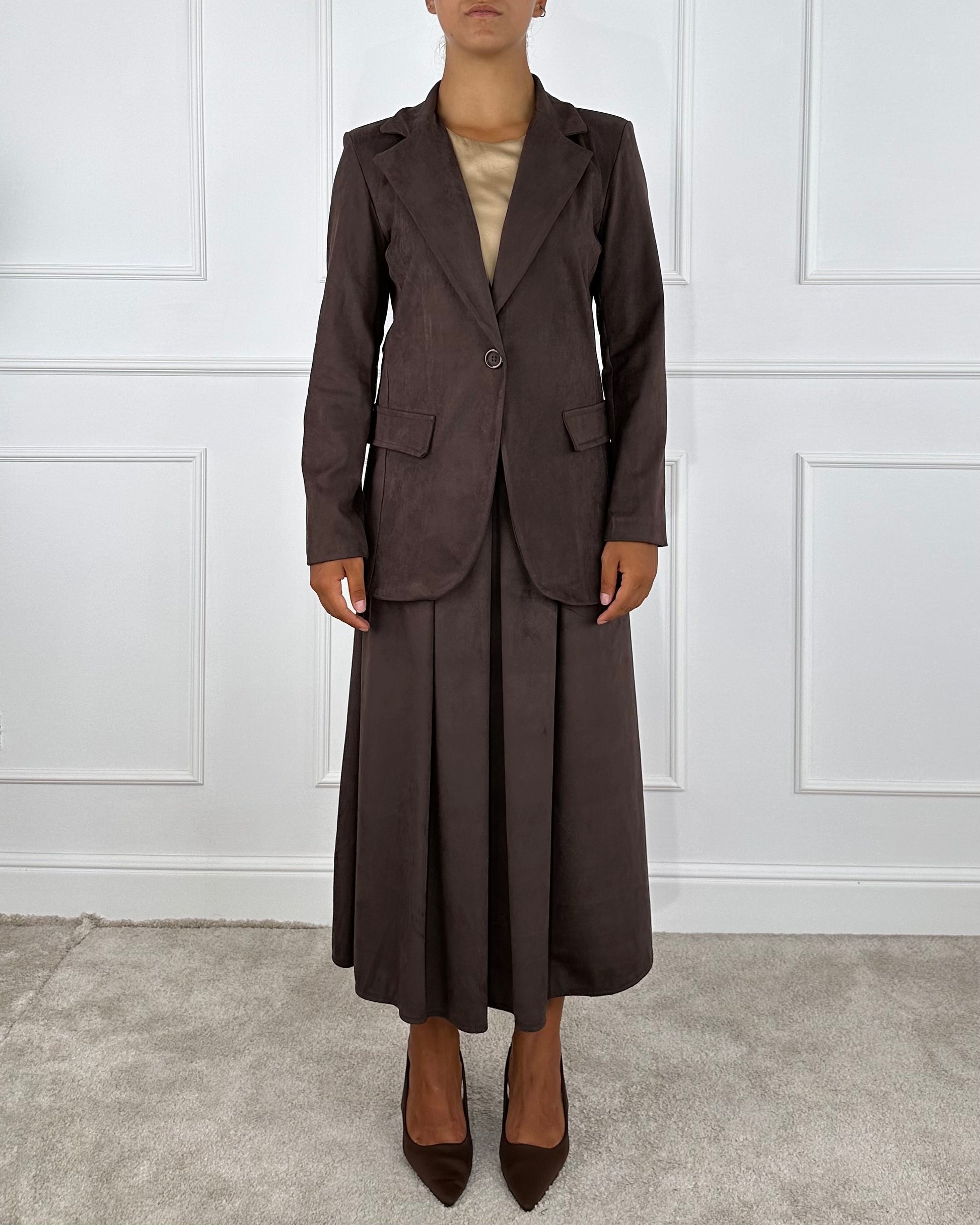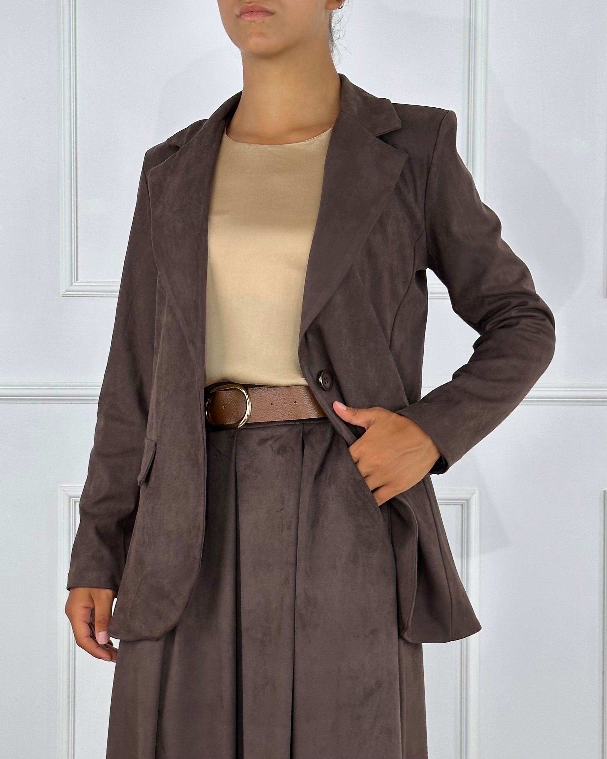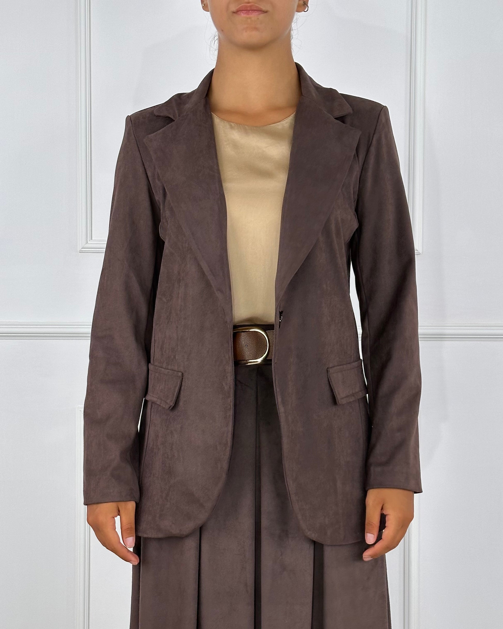 Giacca effetto suède, regular fit, chiusura con bottone, tasche finte sul davanti con patta. Foderata.