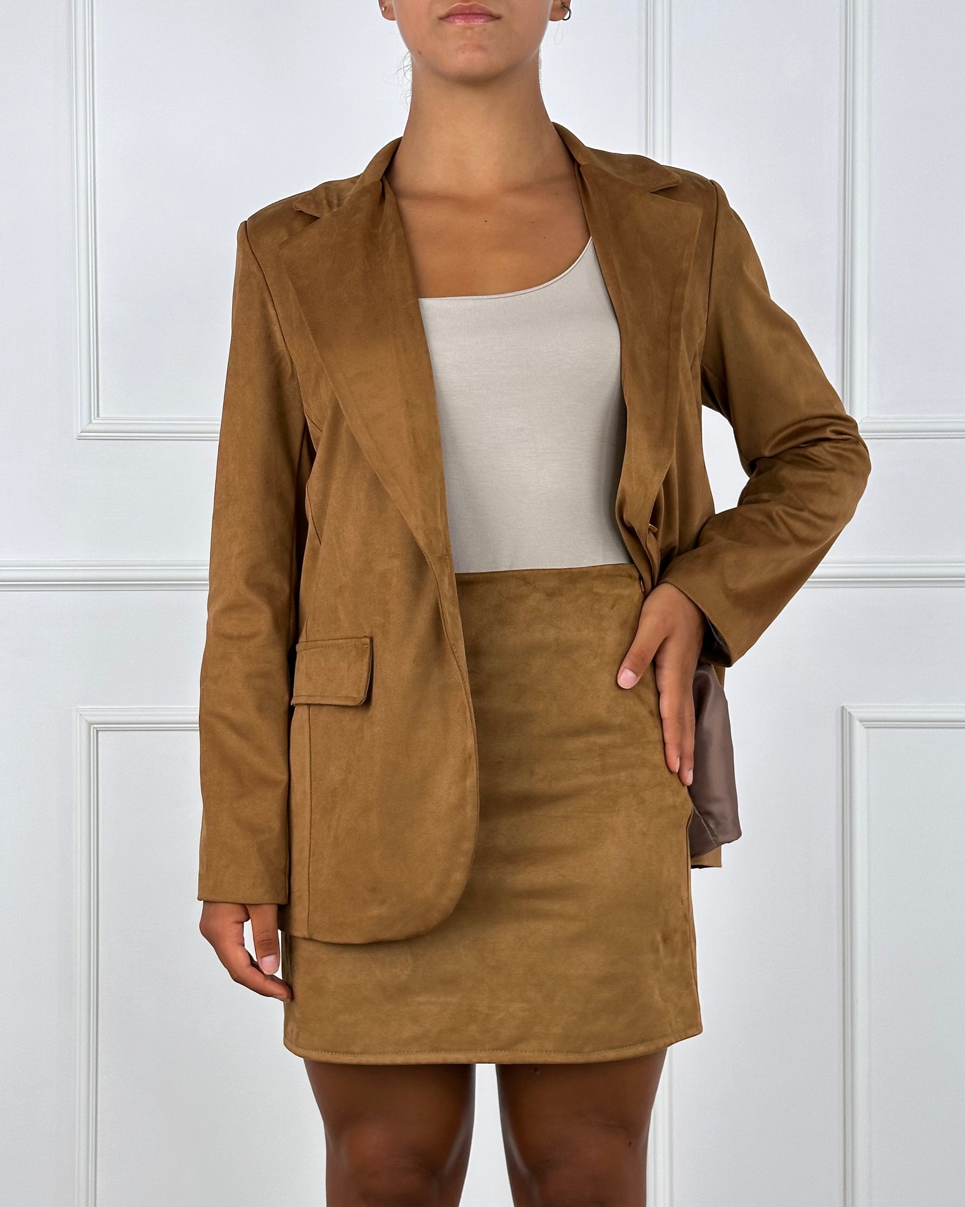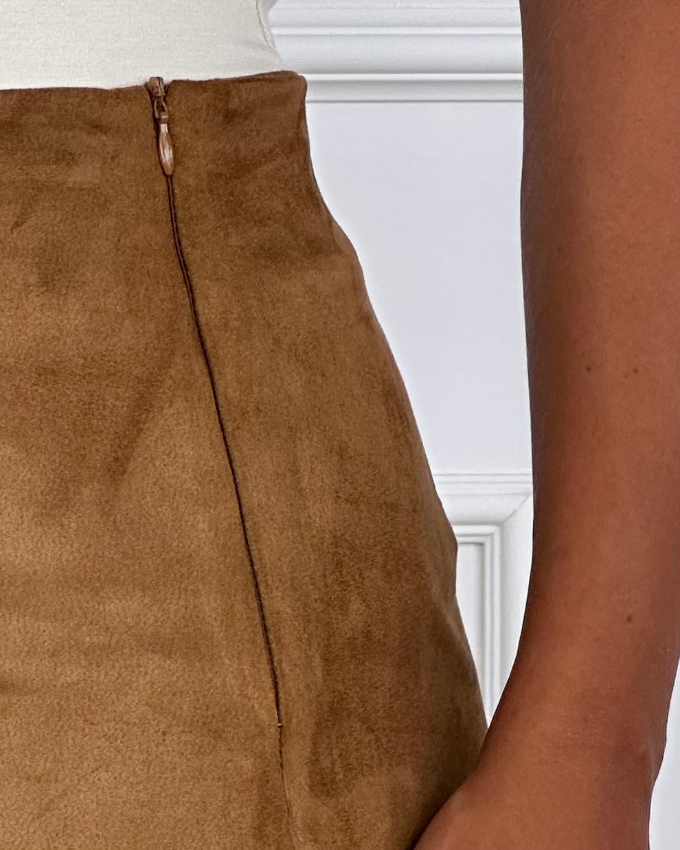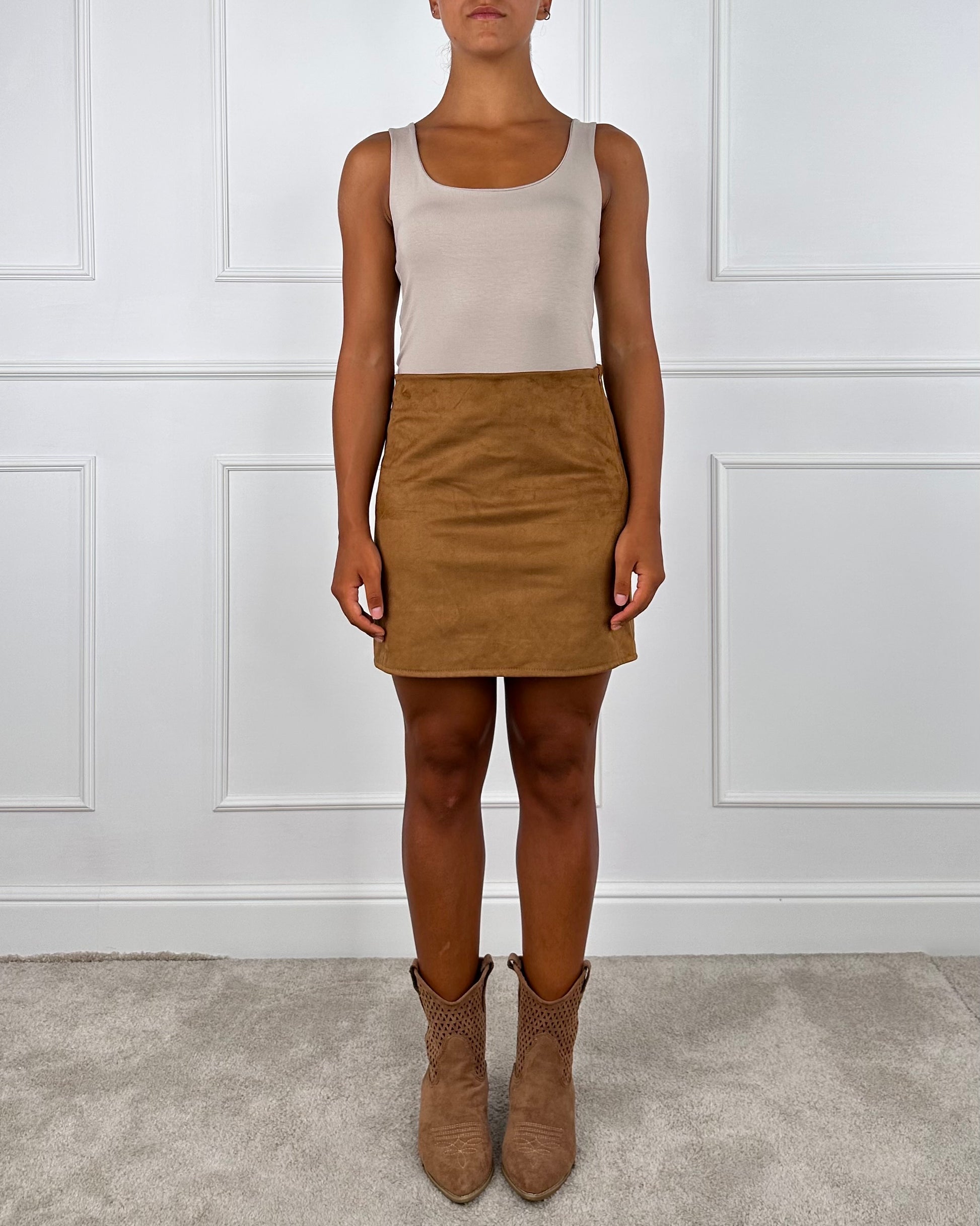 Minigonna effetto suède, chiusura laterale con zip a scomparse. Foderata.
