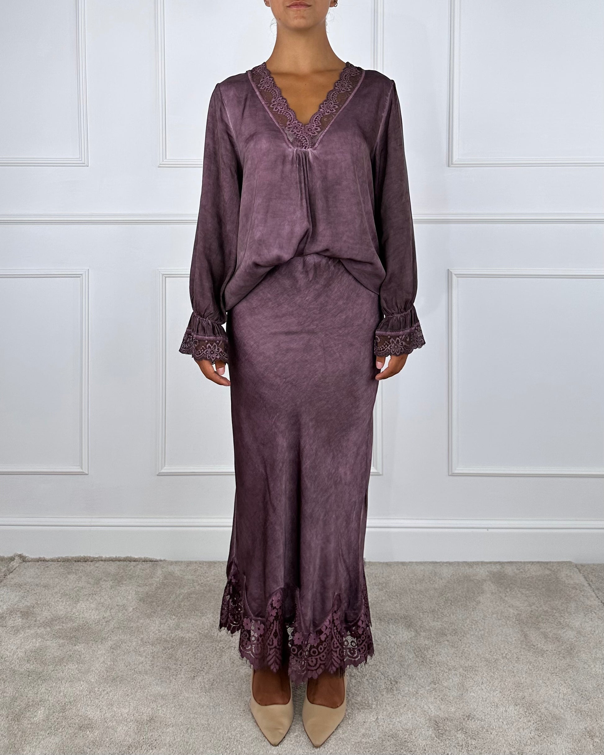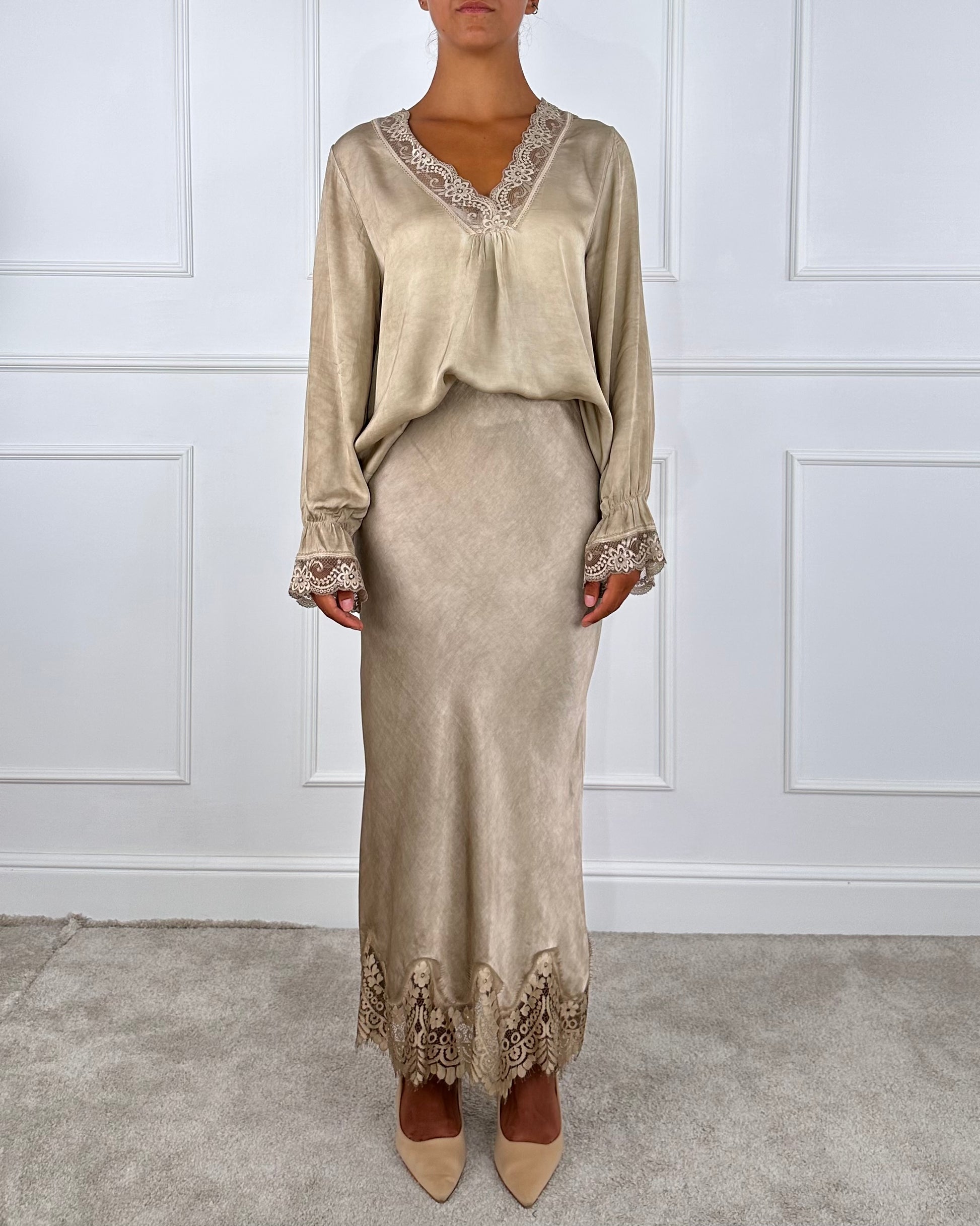 Gonna longuette in viscosa, elastico in vita, pizzo sul fondo.
