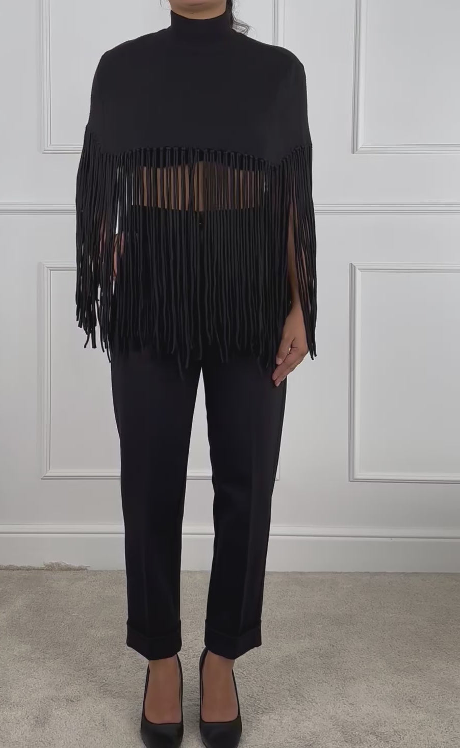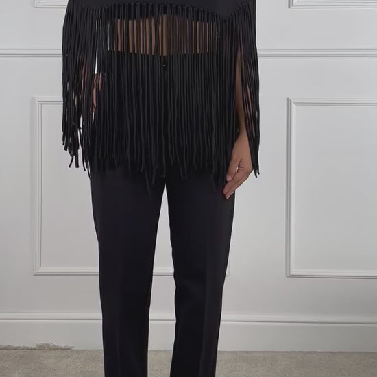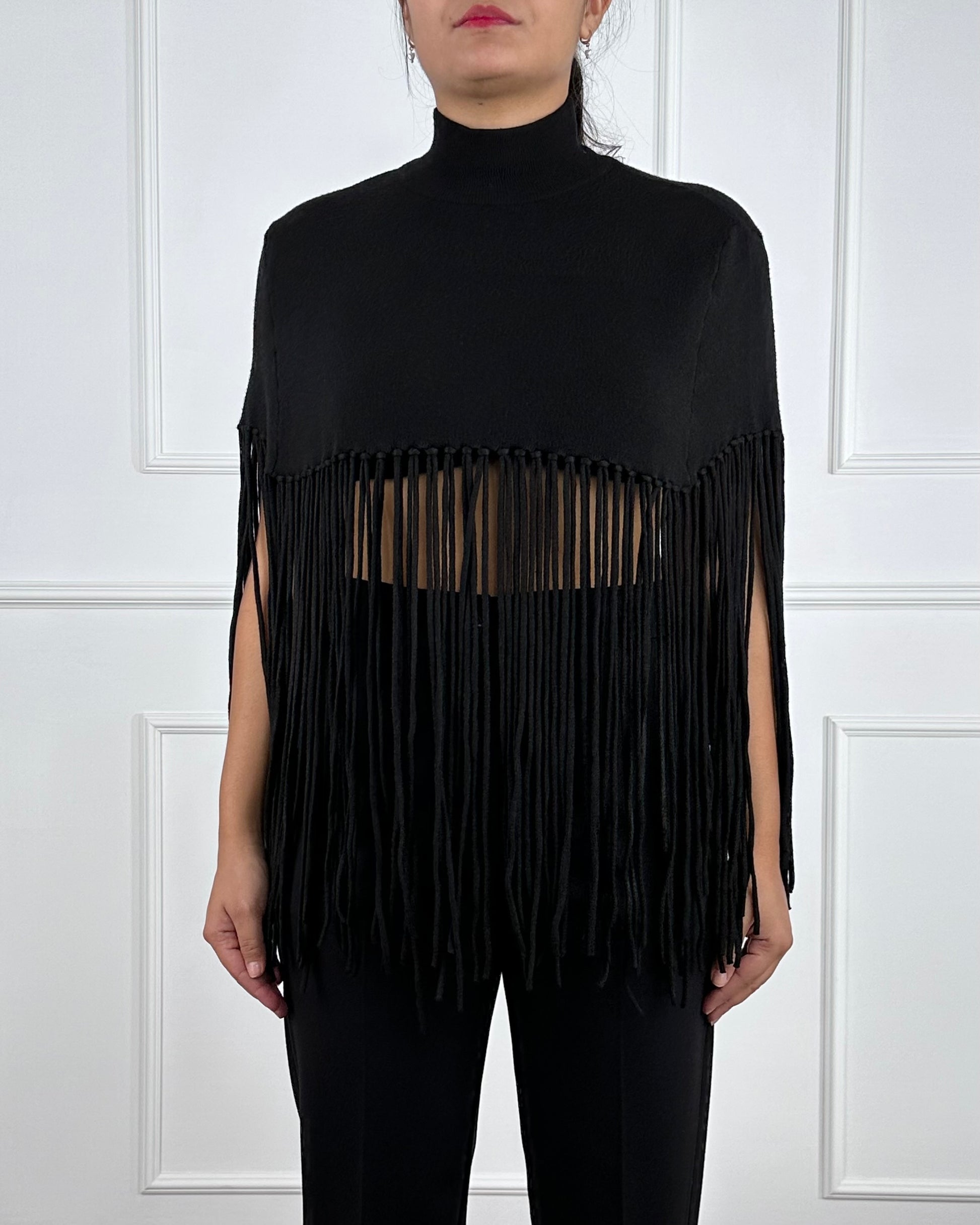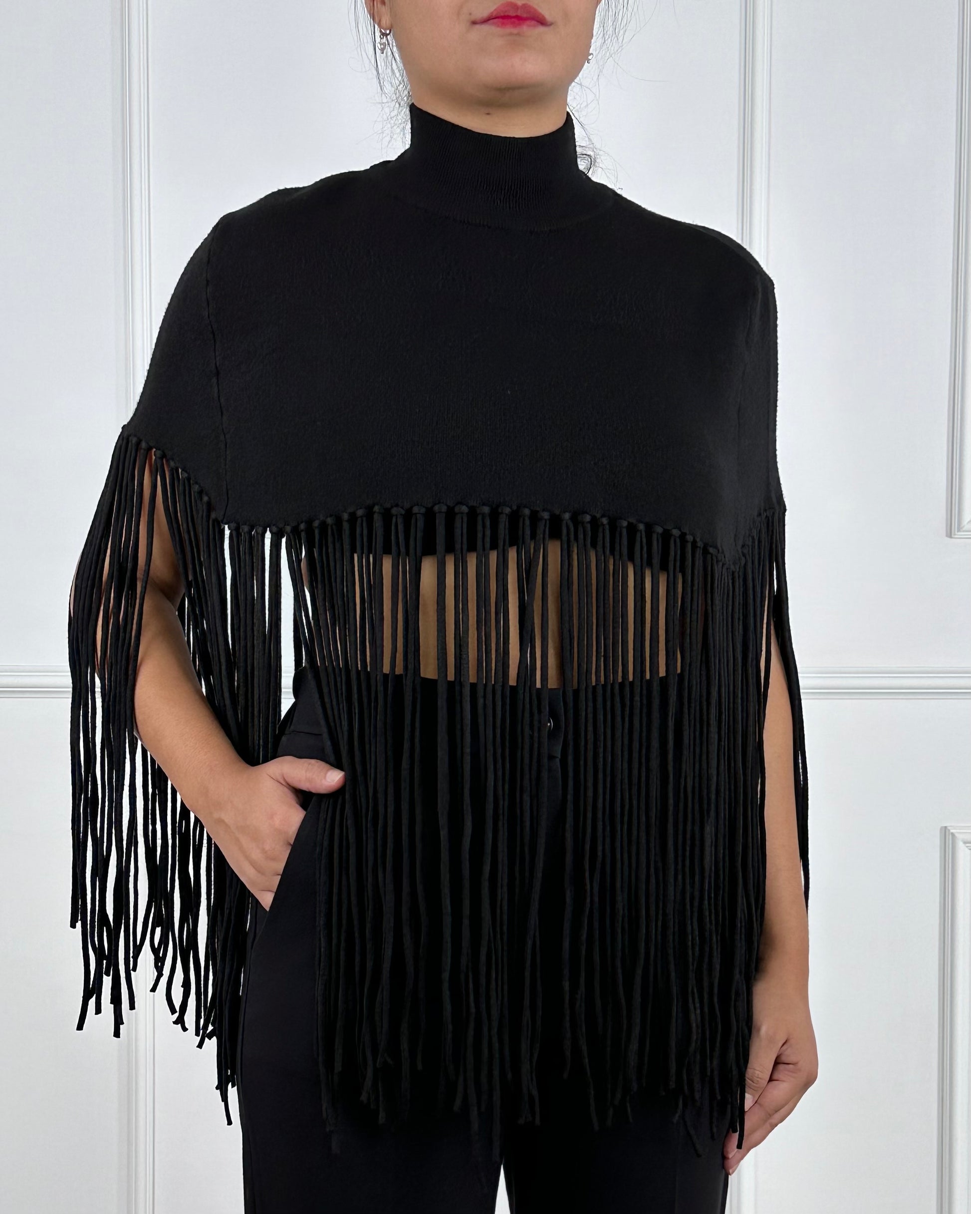 Mantella con frange, collo alto. Composizione: 56% Viscosa 28% Poliestere 16% Poliammide