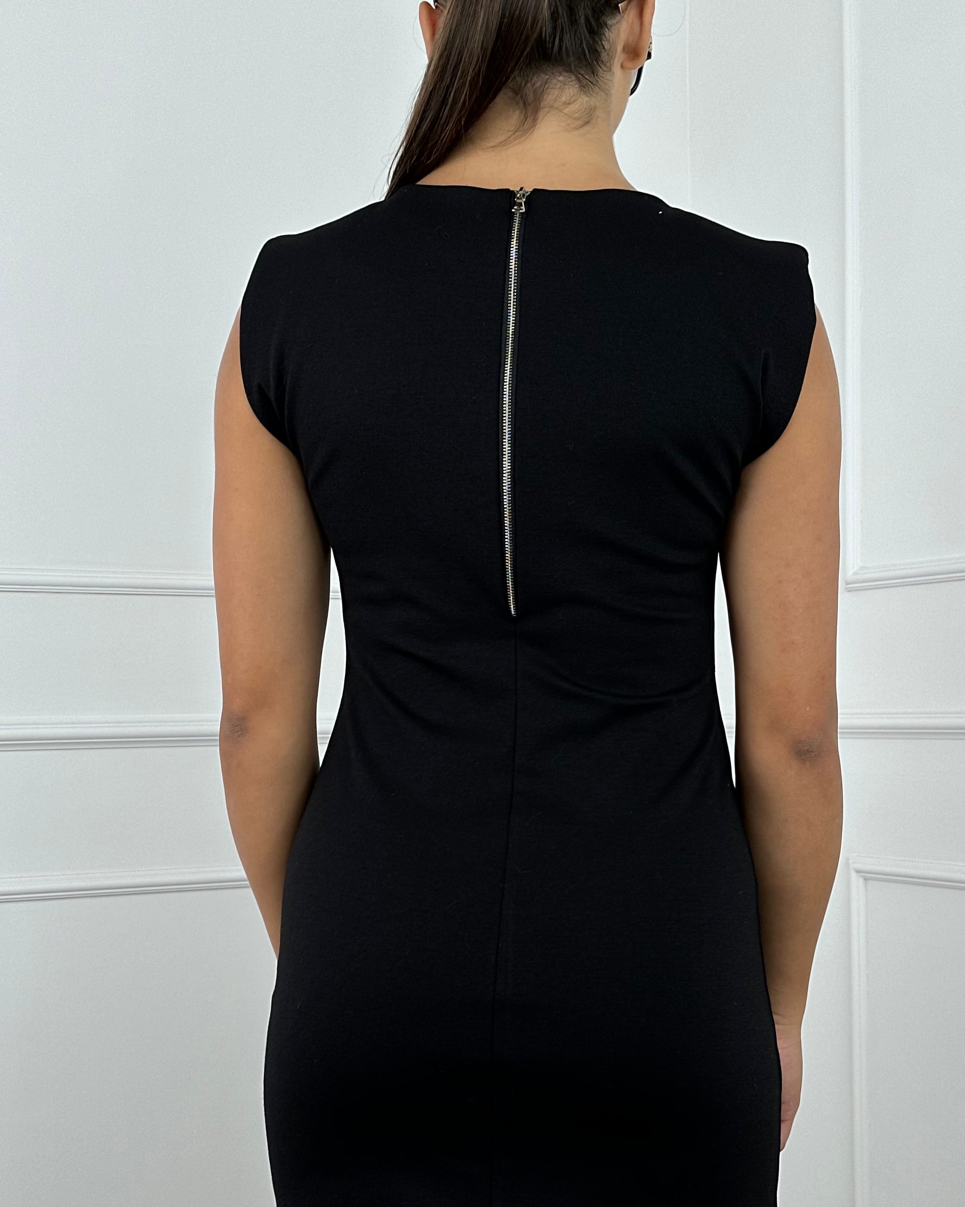 Abito tubino punto milano , scollo giro, spalla larga con spalline, chiusura con zip sul retro. Composizione: 65% Viscosa 30% Poliammide 5% Elastan