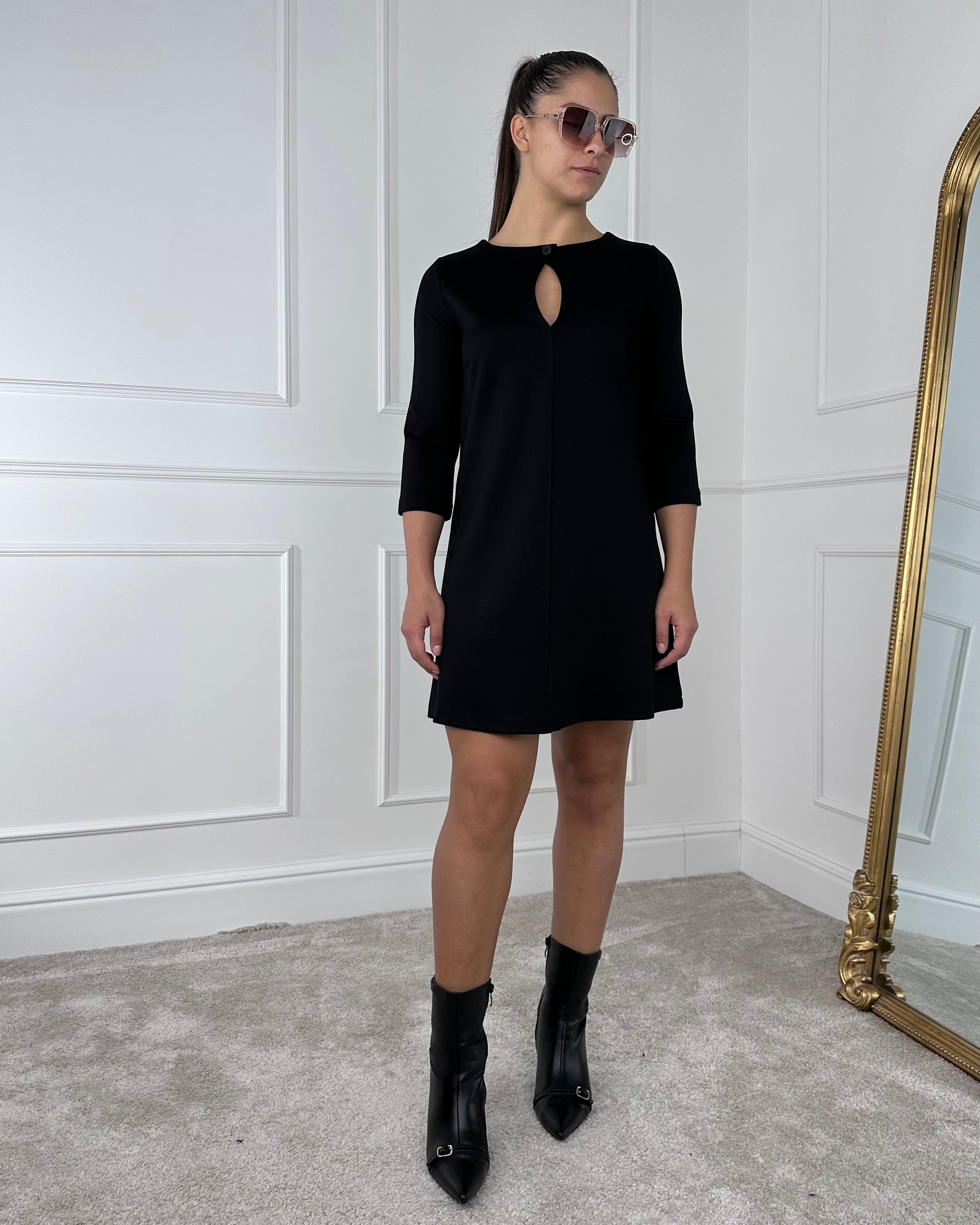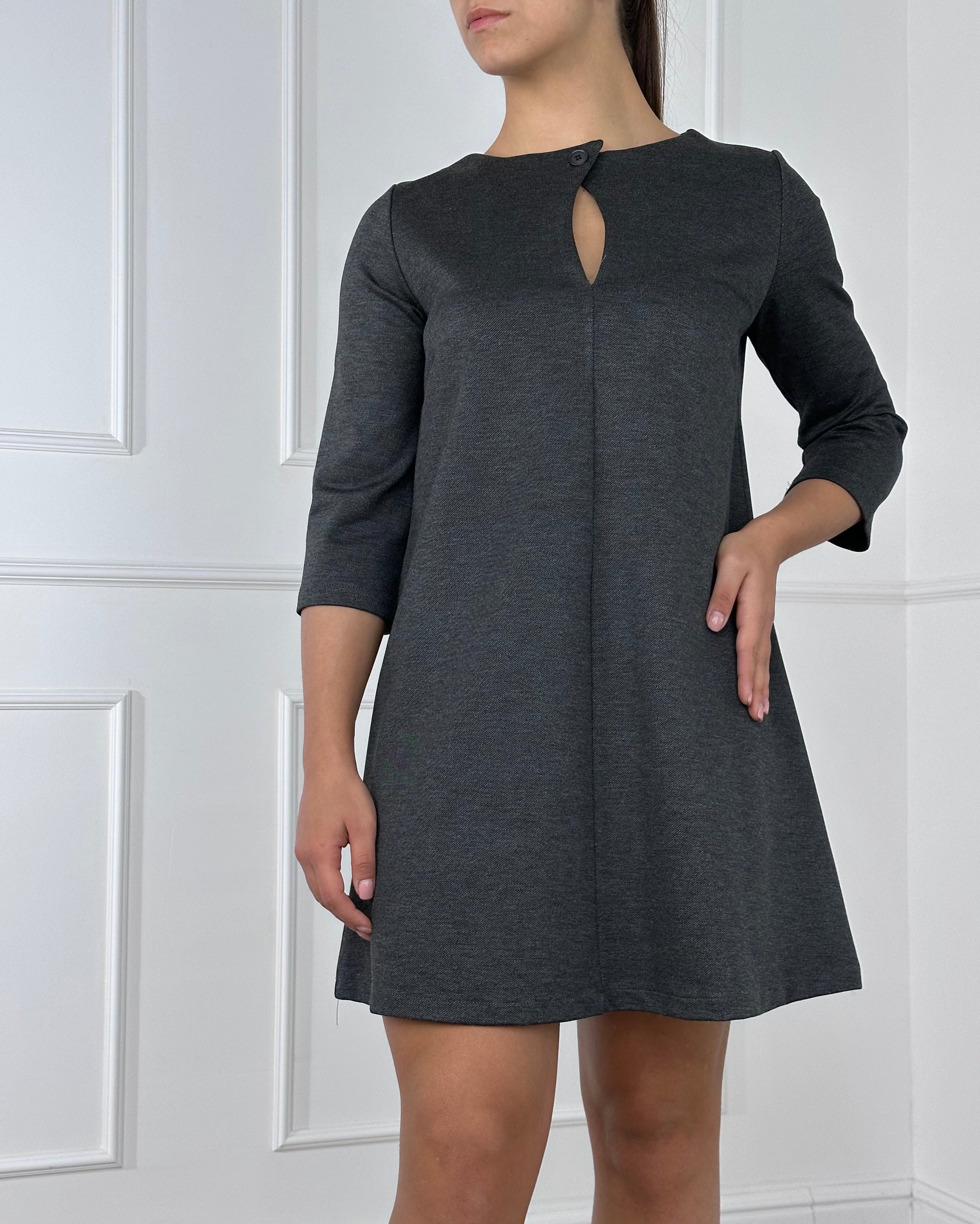 Brend abito trapezio, scollo a goccia con chiusura cottone, manica tre quarti. Composizione: 65% Viscosa 30% Poliammide 5% Elastan