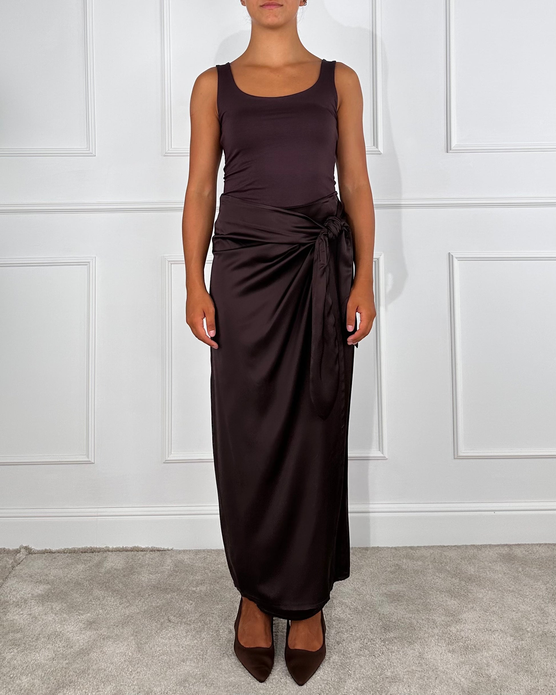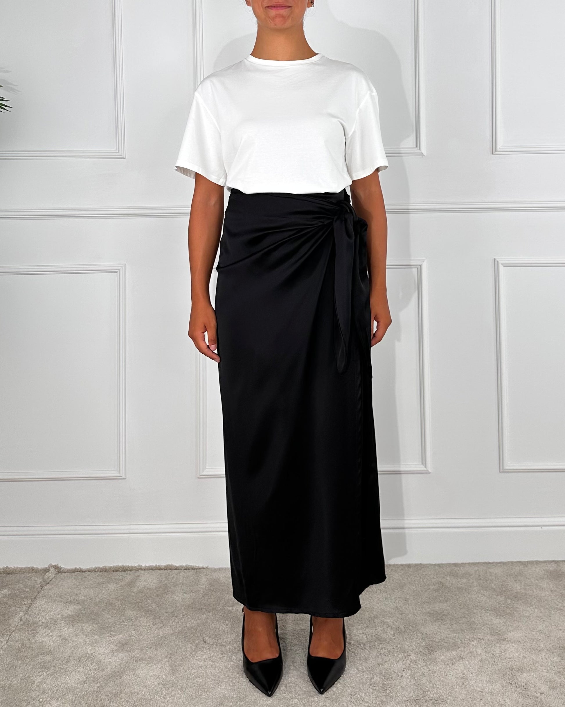 Gonna pareo in viscosa, chiusura con bottone e fiocco da annodare laterale. Composizione: 100% Viscosa