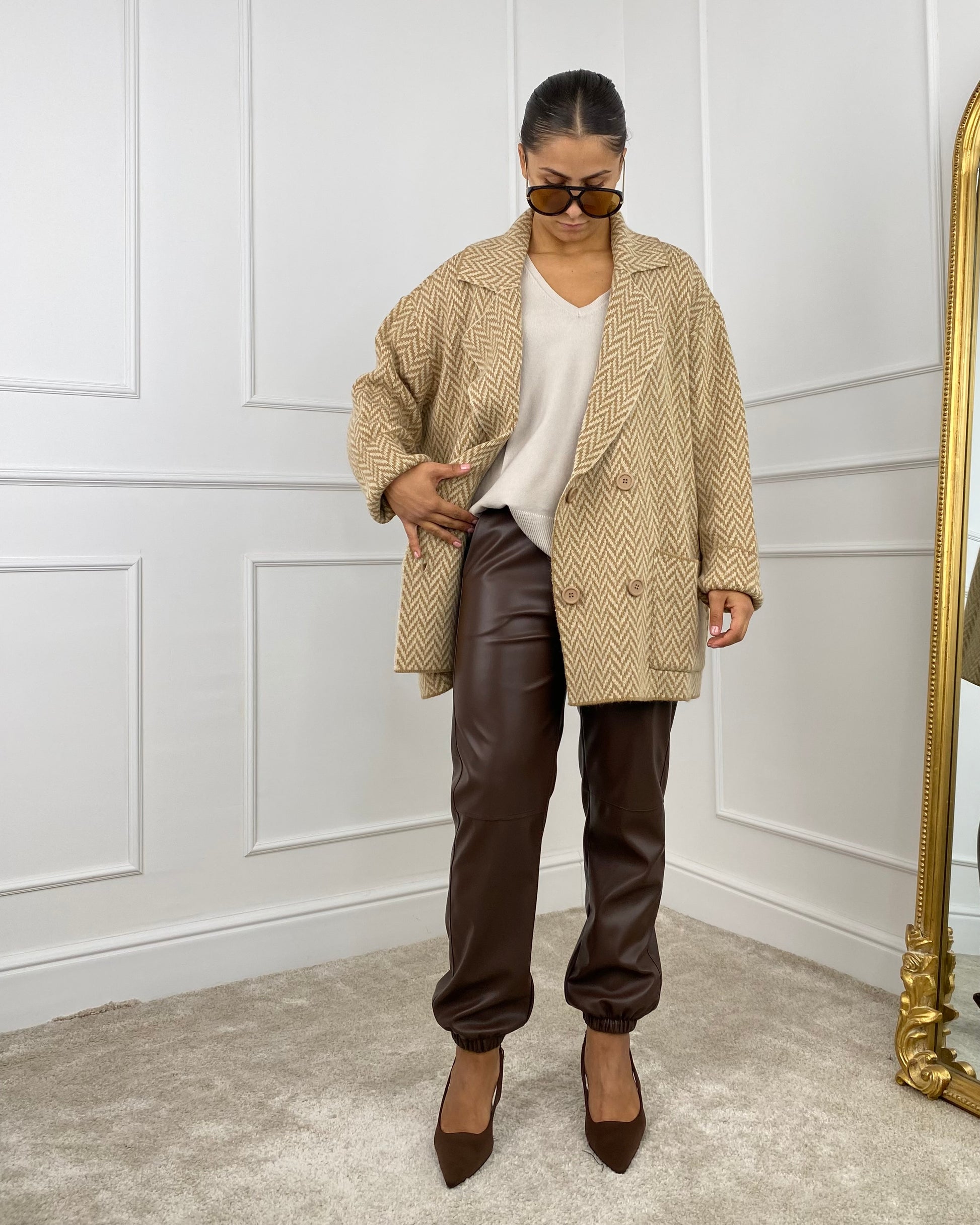 Caban mano lana, spina di pesce, doppio petto, tasche sul davanti. Composizione: 50% Acrilico 30% lana 20% Viscosa