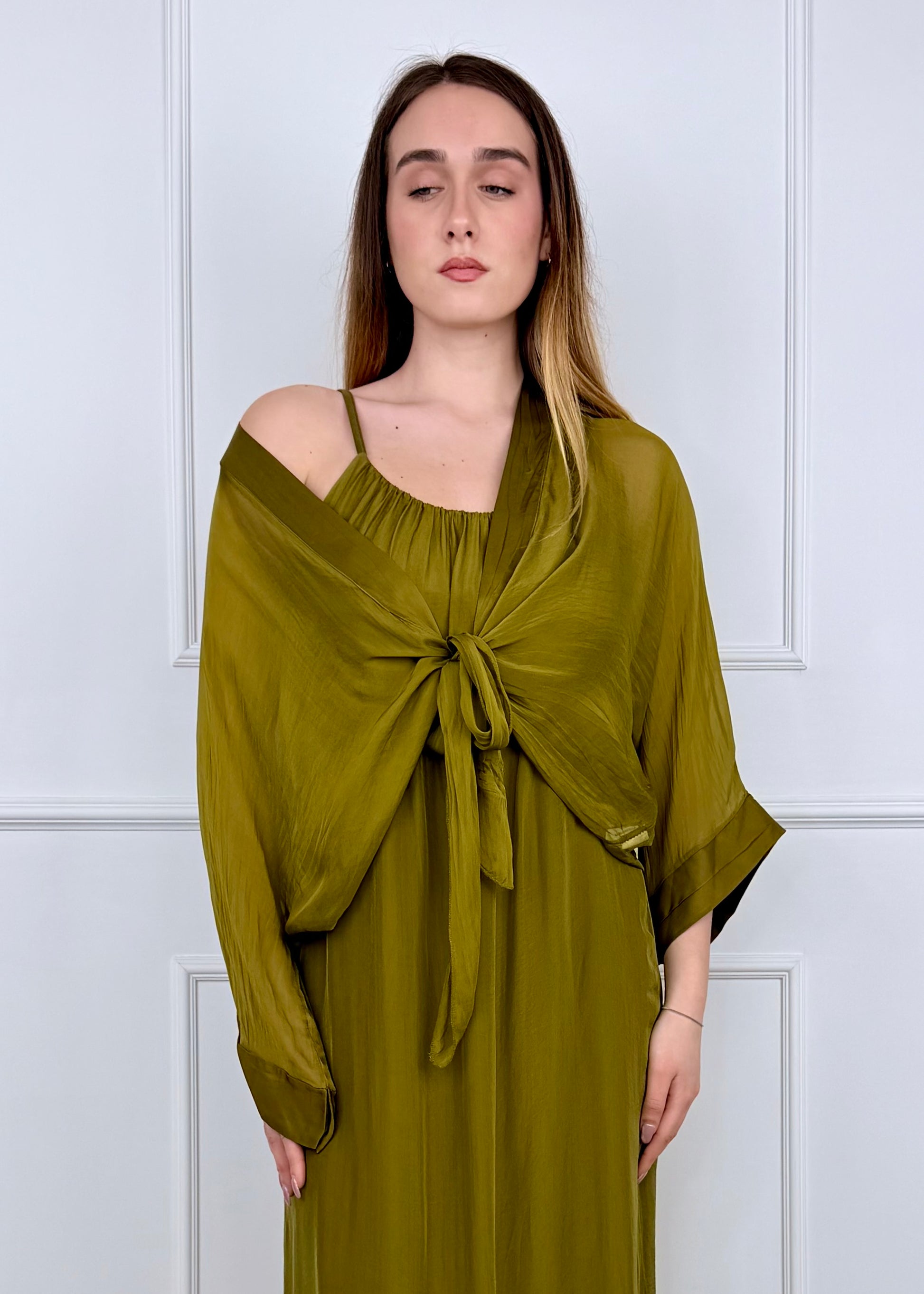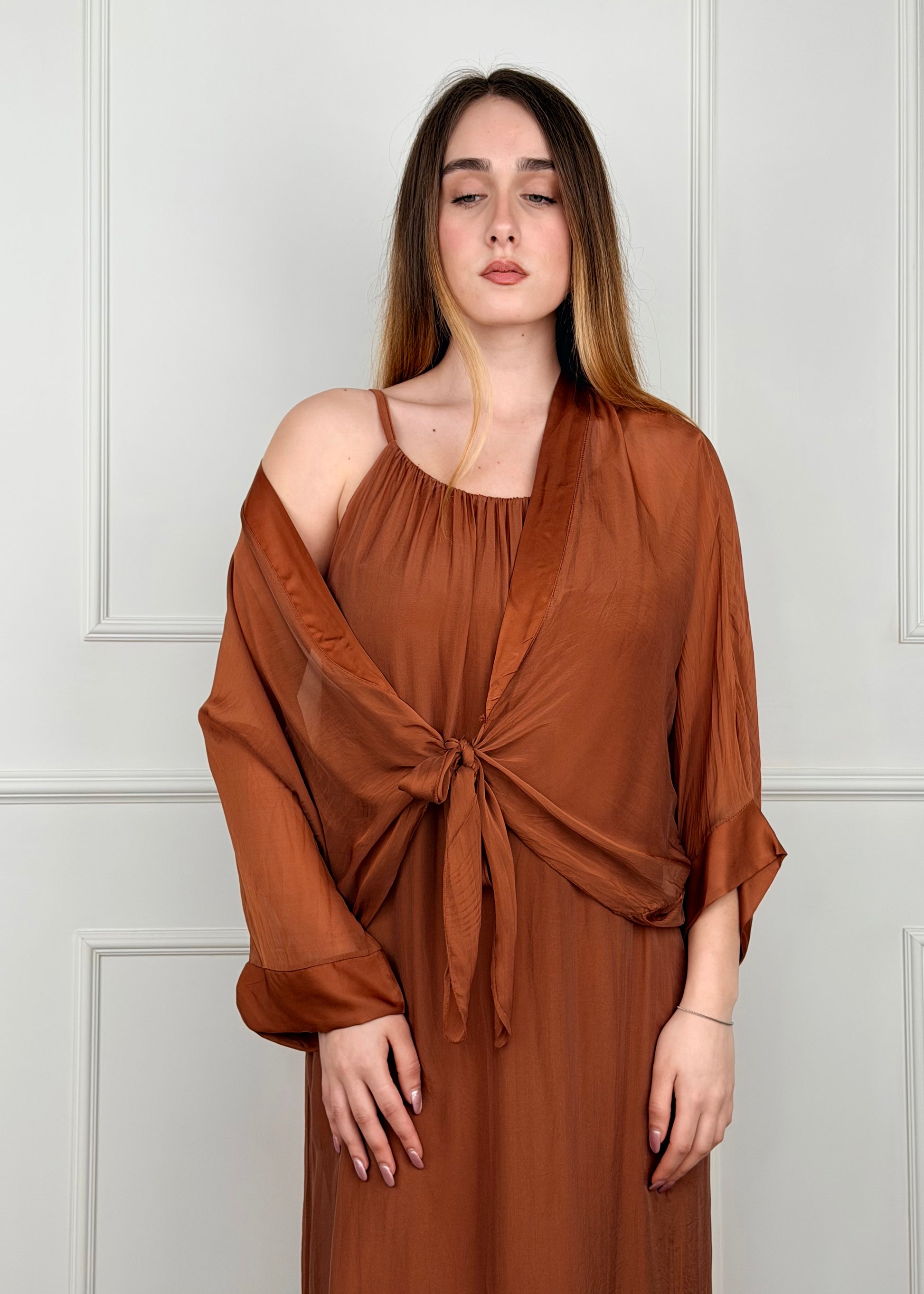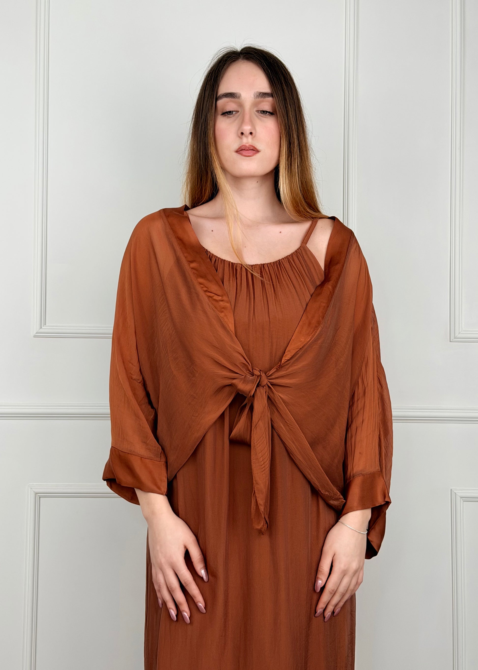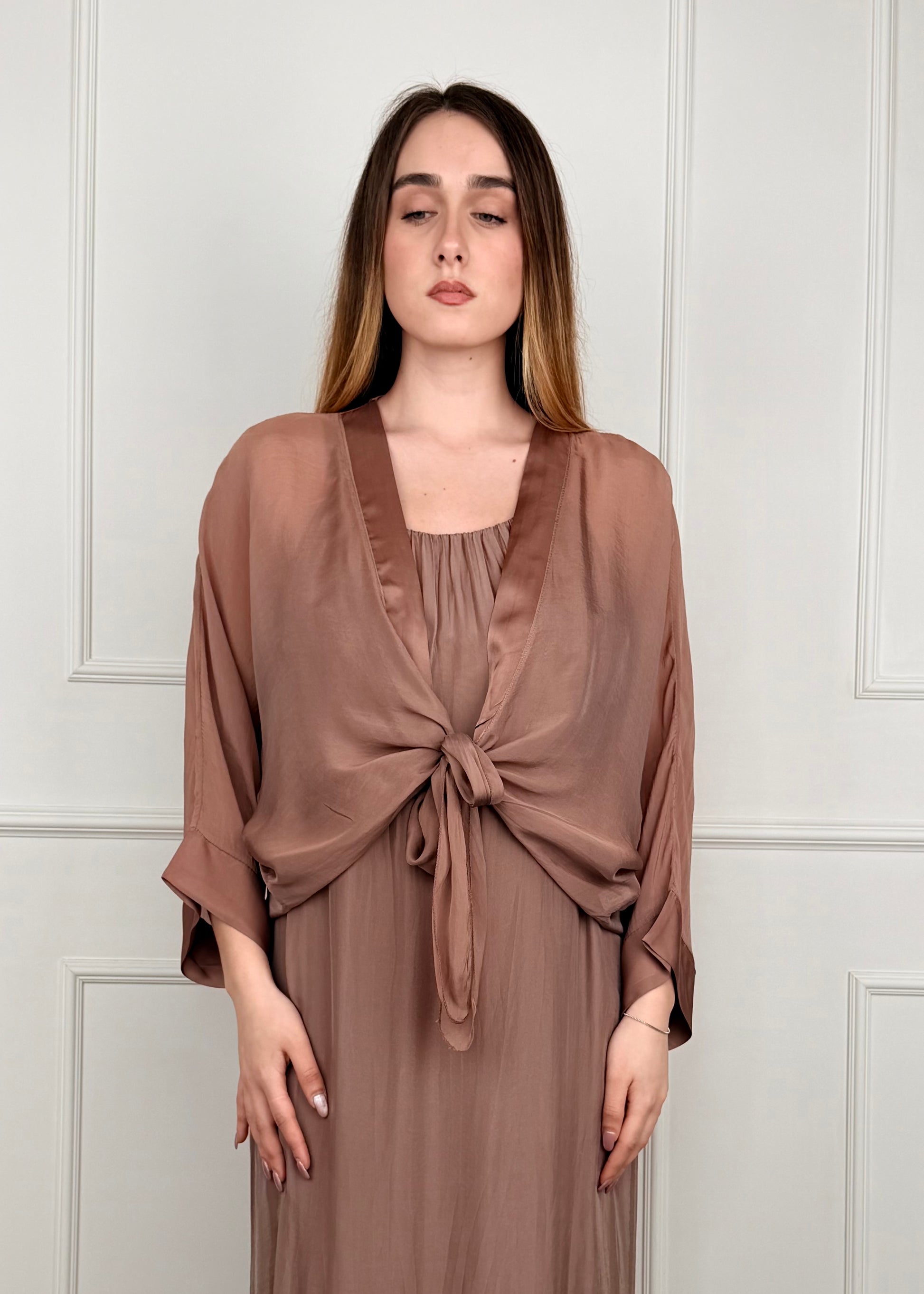Bolerino in misto seta e viscosa, chiusura con nodo sul davanti, manica tre quarti. Composizione: 70% viscosa 30% Seta