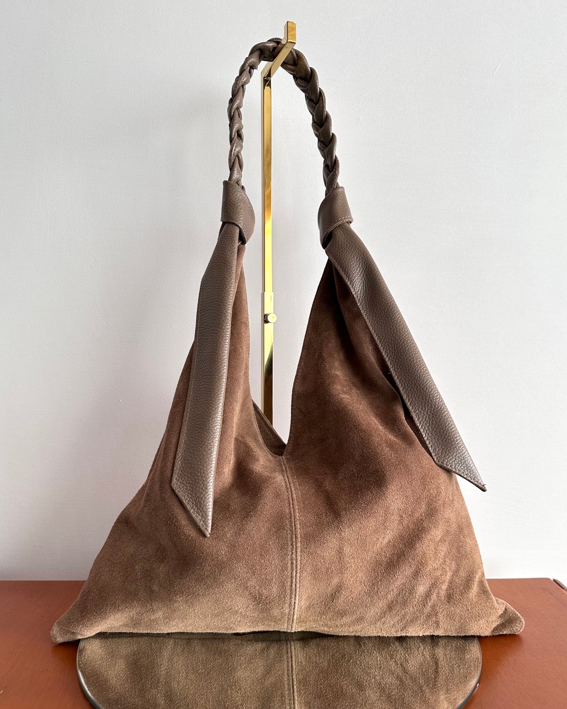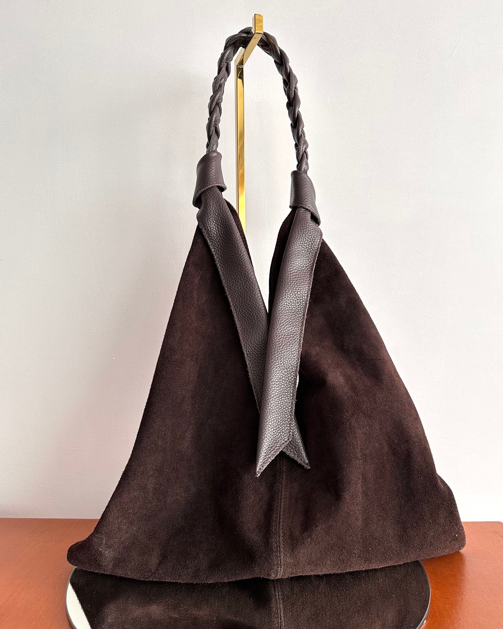 Borsa vera pelle, può essere indossata a mano o a spalla, manico intrecciato. Chiusura magnetica.