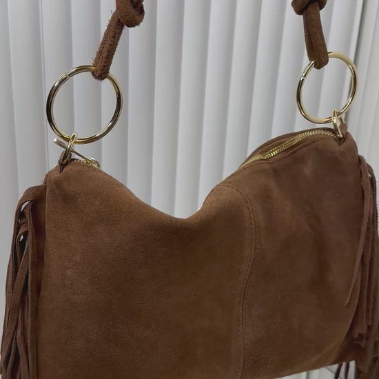 Borsa vera pelle scamosciata, può essere indossata a spalla, a mano e a tracolla, frange laterali
