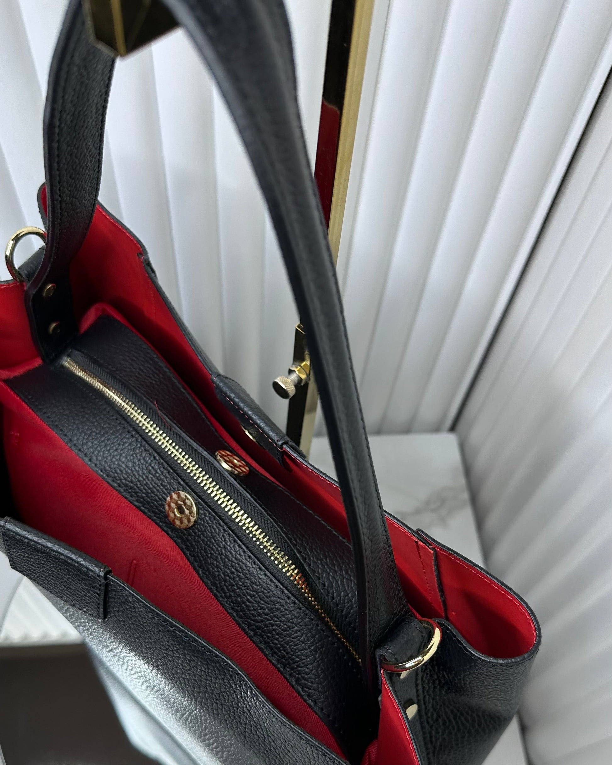 Borsa vera pelle, chiusura con clip, due scomparti interni e un ampio scomparto centrale con chiusura zip, può essere indossata a mano, a spalla o a tracolla mediante l`utilizzo della propia tracolla. Dimensioni borsa.