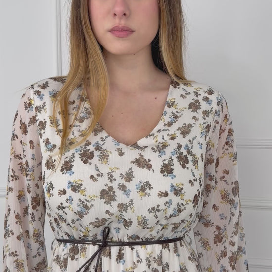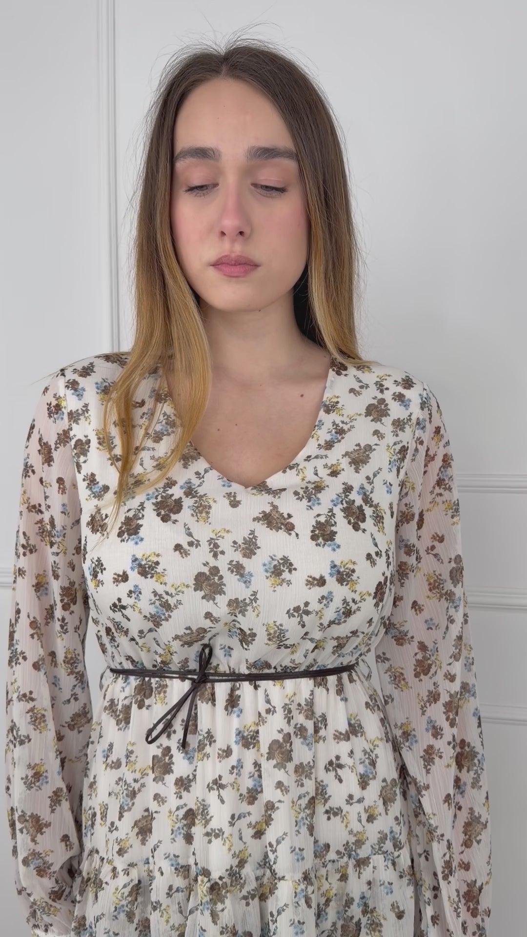 Brend abito in tessuto crepon, fantasia floreale, scollo a v,volant sul fondo, elastico in vita, passanti in vita con cintura. Dotato di sottogonna. Composizione: 100% Poliestere Composizione interna: 95% Viscosa 5% Elastan