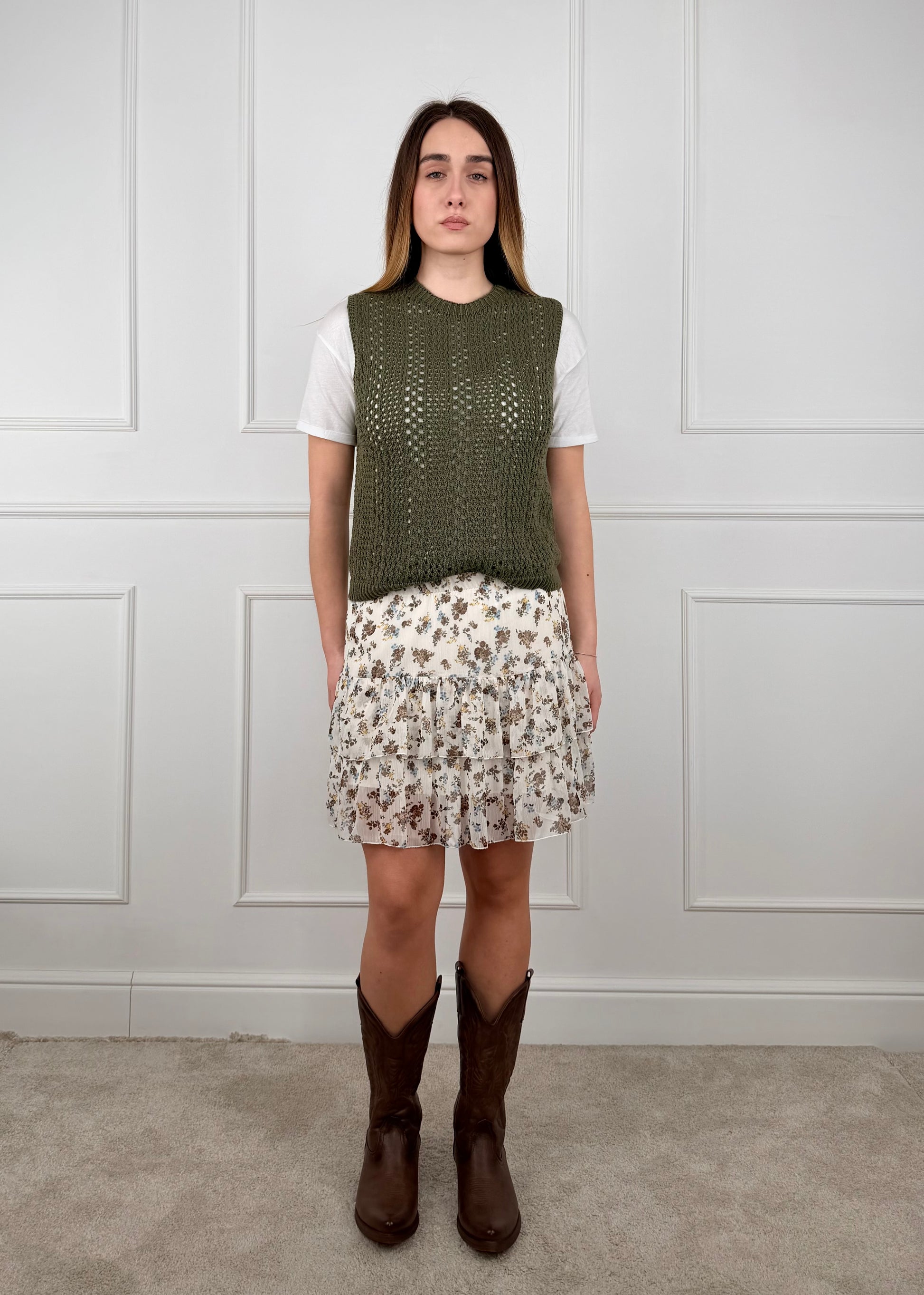 Brend gonna in tessuto crepon con volant, fantasia floreale, elastico in vita, dotata di sottogonna. Composizione: 100% Poliestere Composizione fodera: 95% Viscosa 5% Elastan
