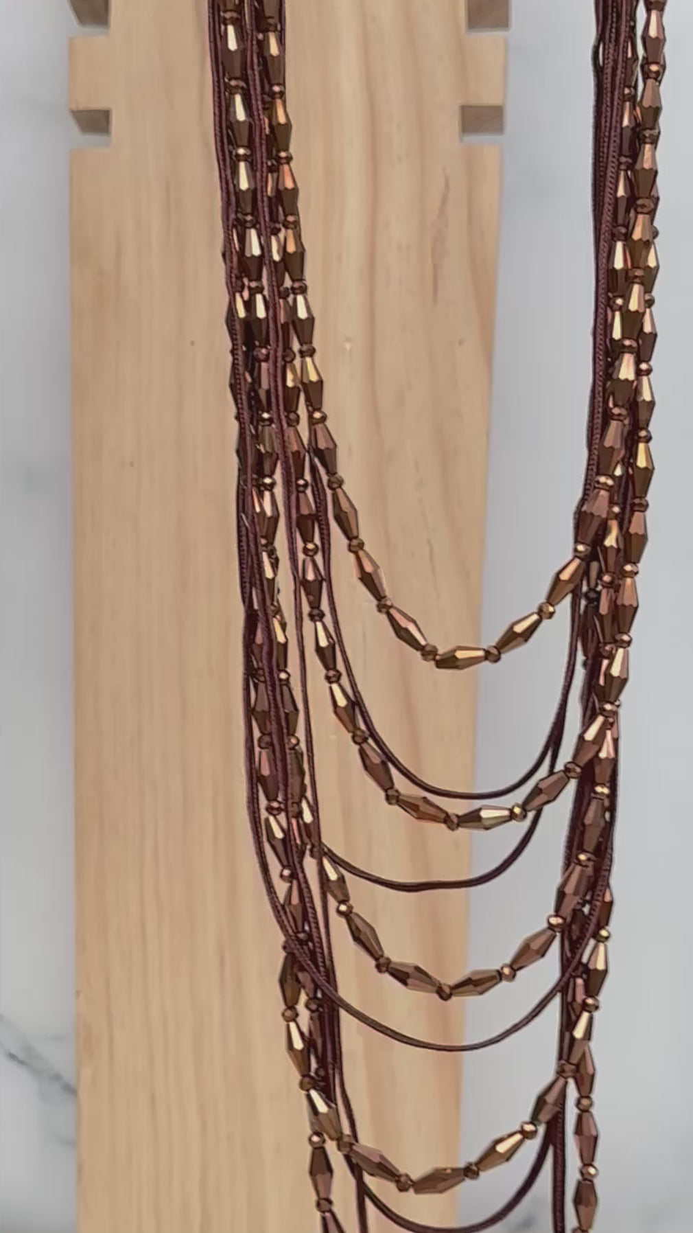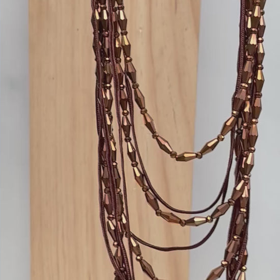 collana a più fili in tessuto e perline , chiusura regolabile con gancio.