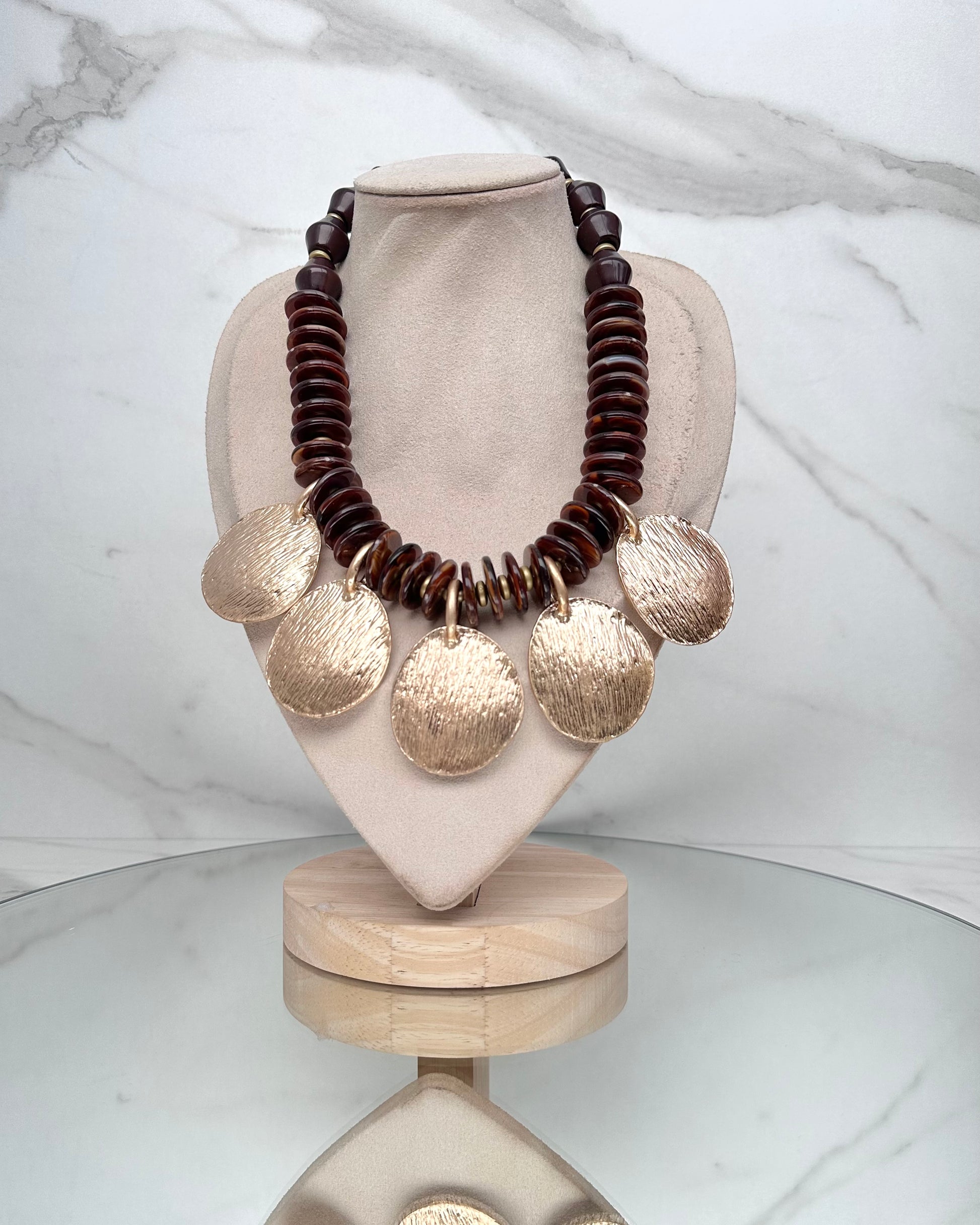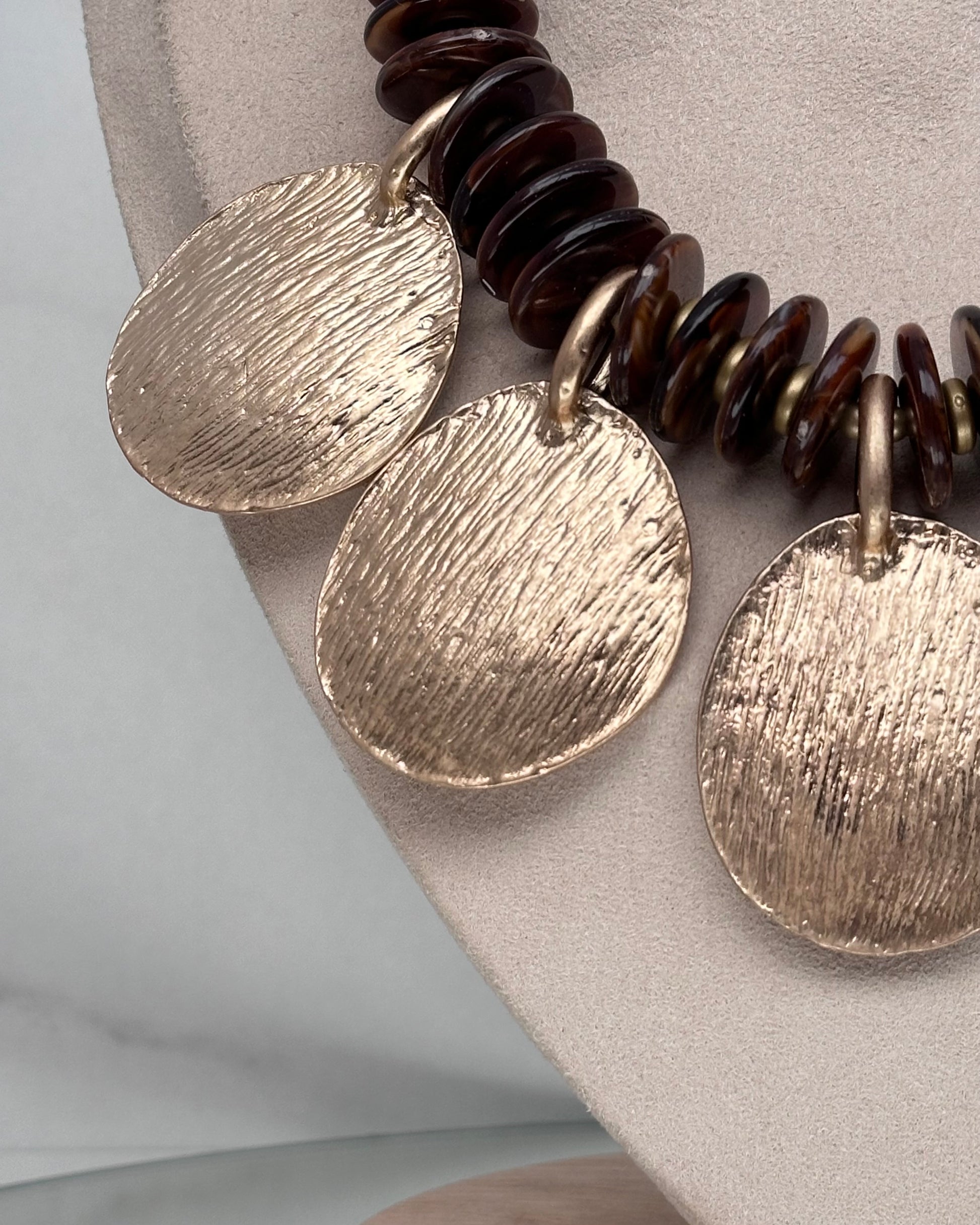 Collana etnica con pendenti cerchio, chiusura con gancio regolabile.
