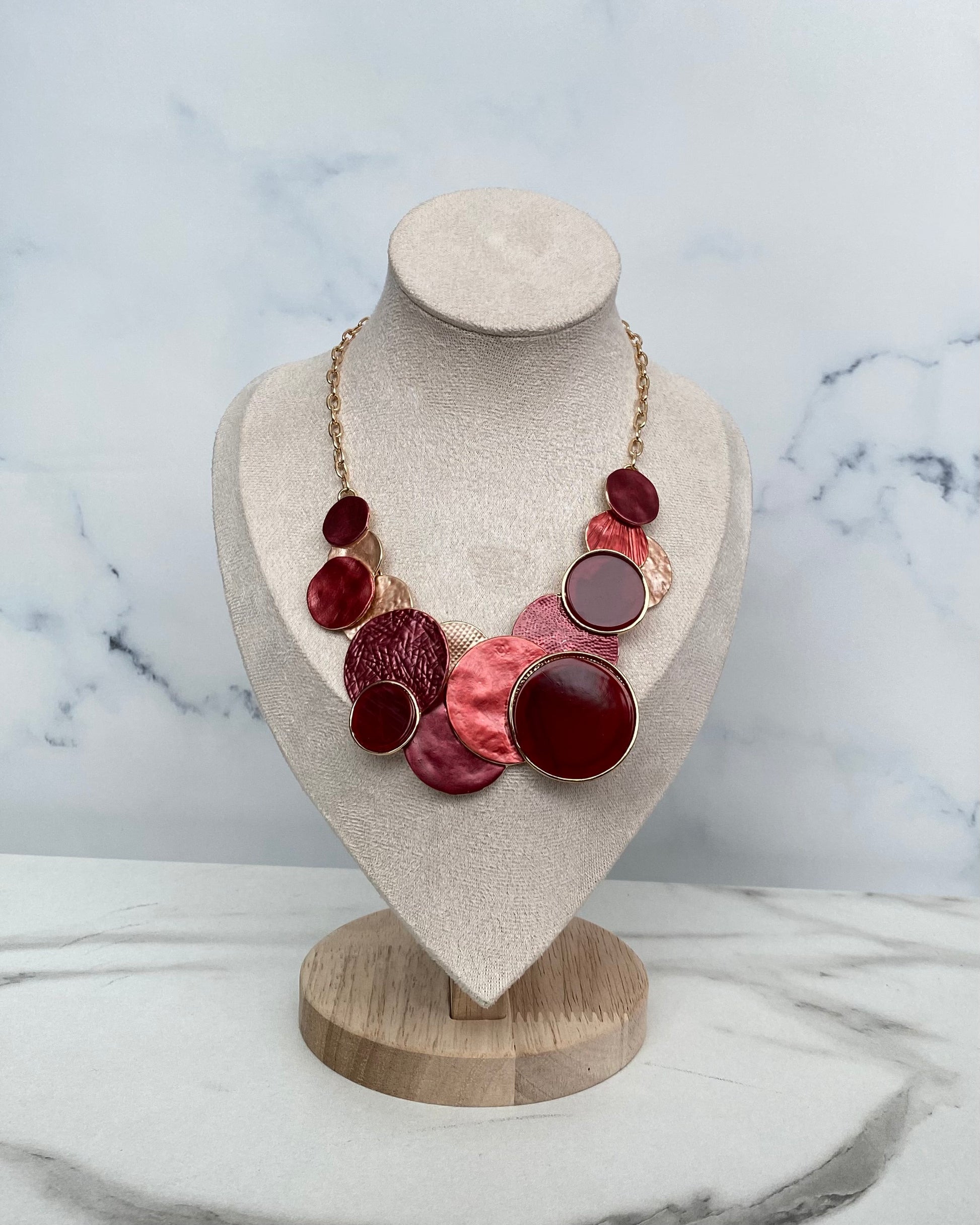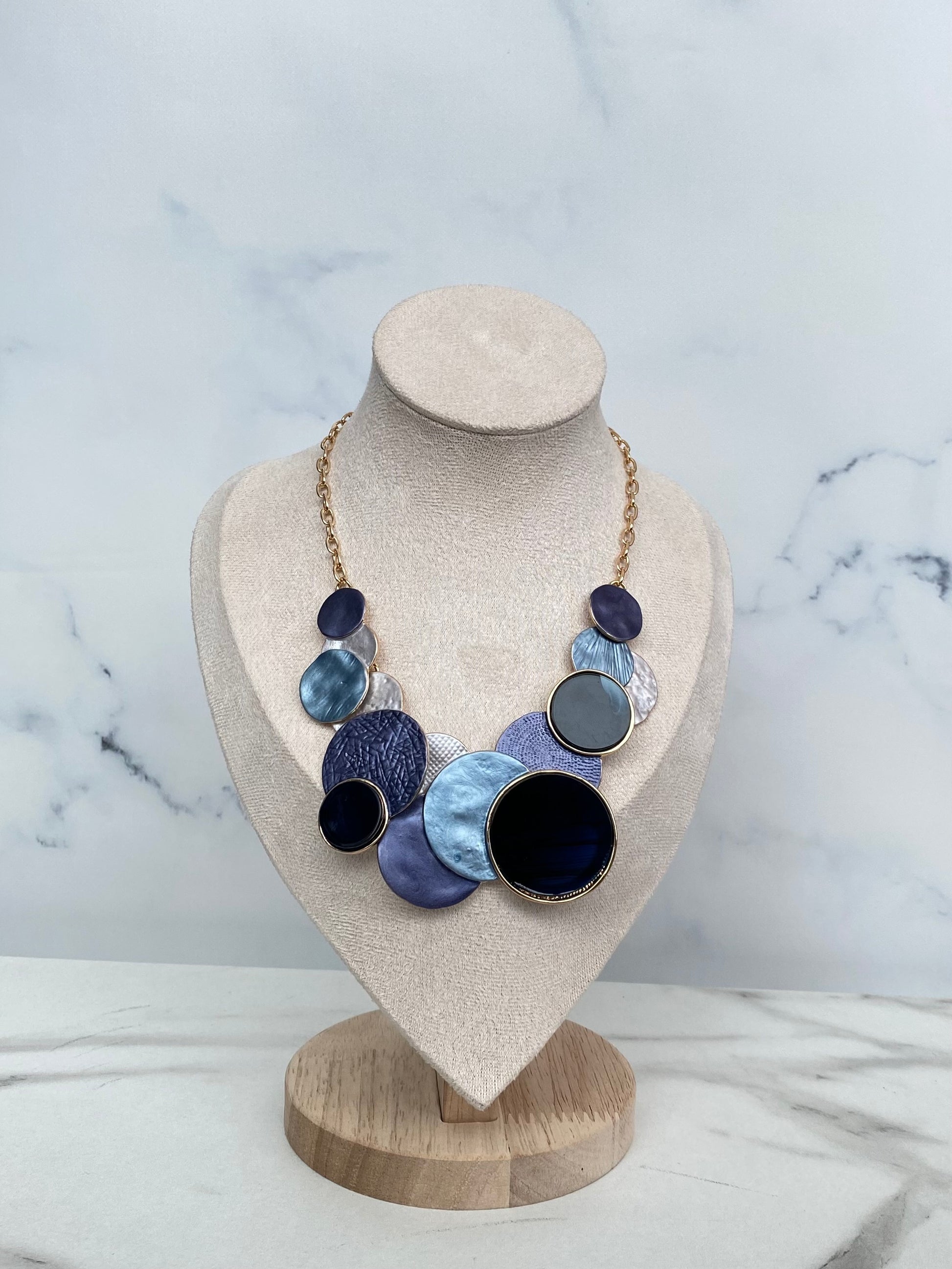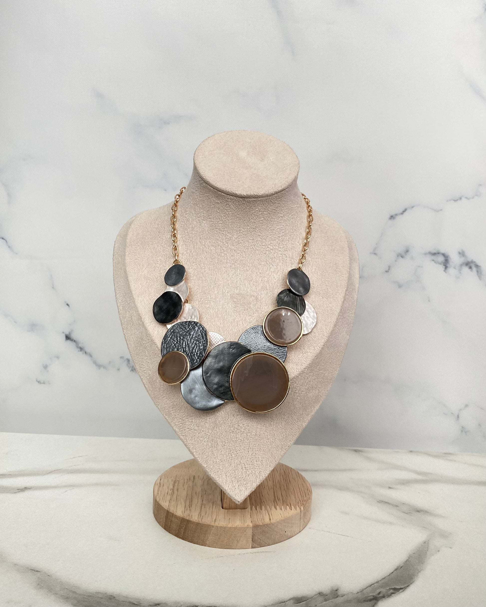 Collana con sfere piatte di varie dimensioni, chiusura regolabile.