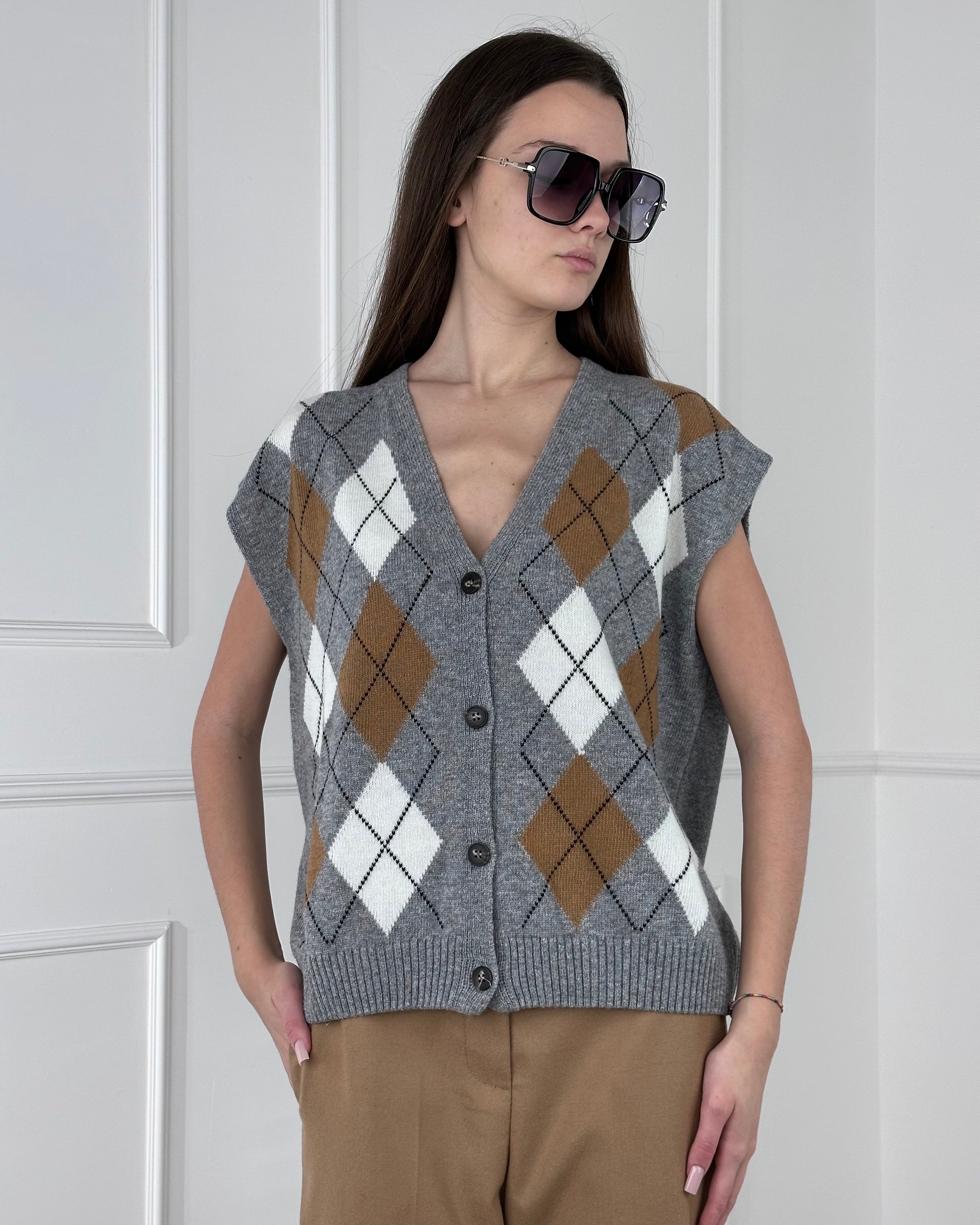 Tensione in gilet rombi, chiusura con bottoni, scollo a v. Composizione: 40% Viscosa 30% poliammide 25% lana 5% cashmere