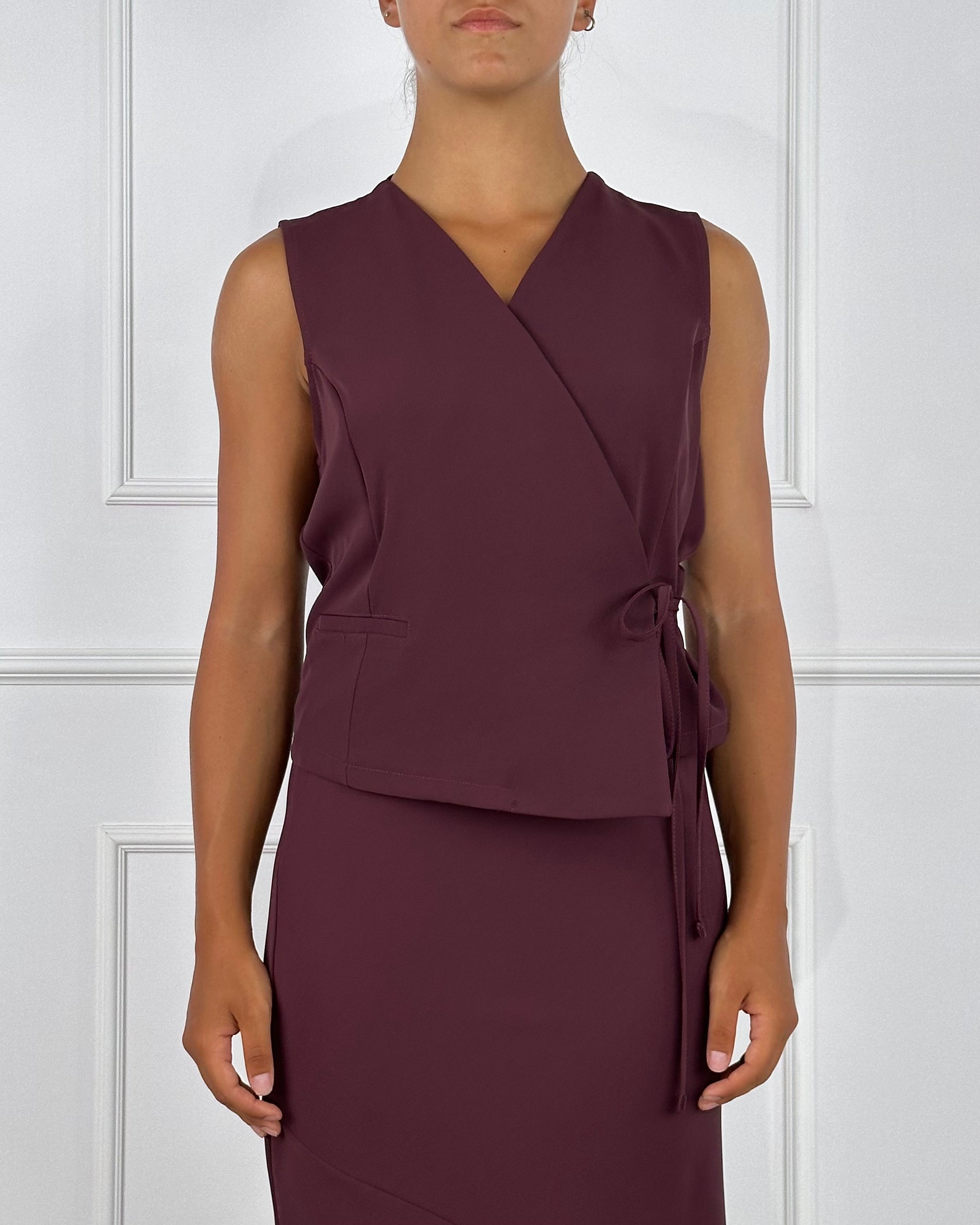 Myastreet gilet, tessuto fluido, scollo a V, chiusura laterale con laccetti e bottone a scomparsa, tasca finta sul davanti.