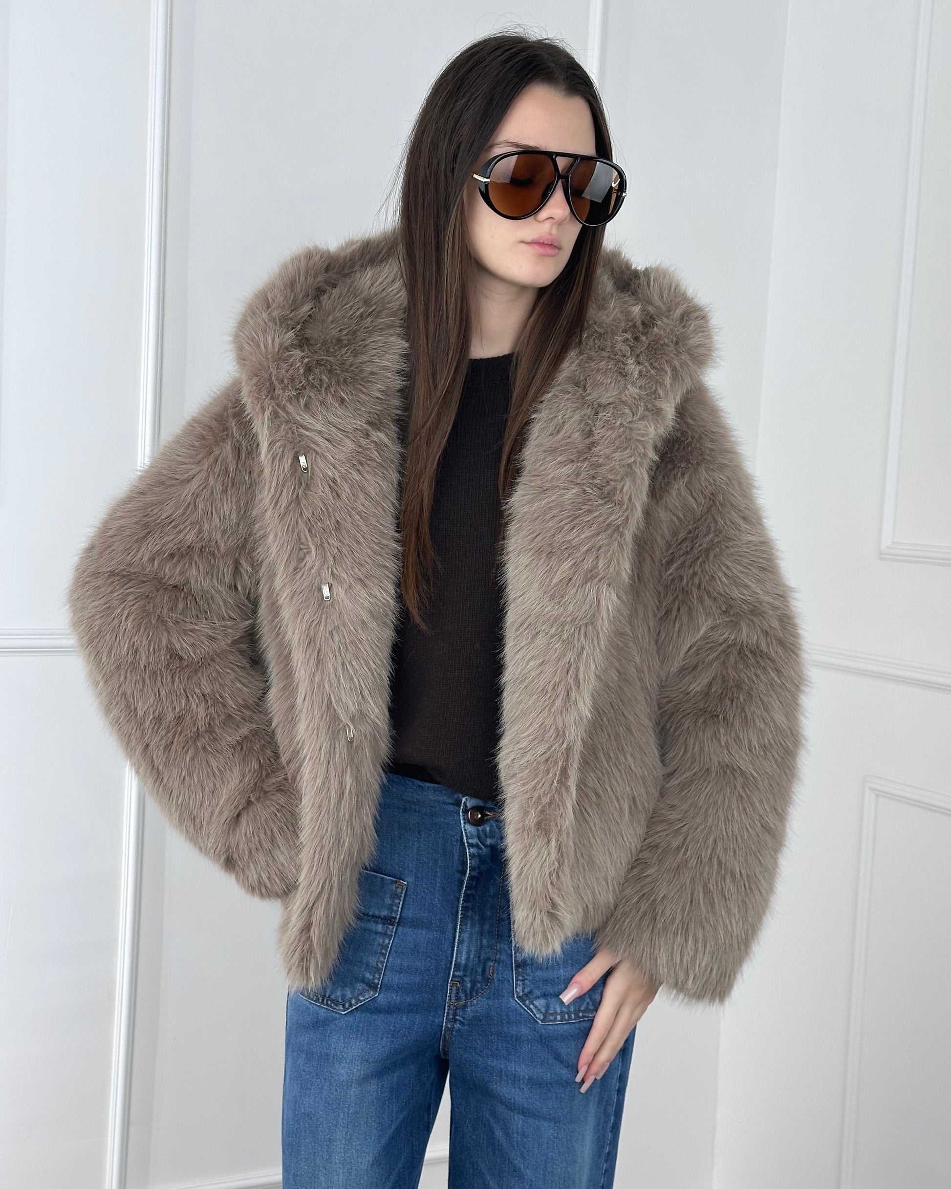 Ecofur con cappuccio, chiusura con gancio, tasche sul davanti. Composizione: 100% Poliestere