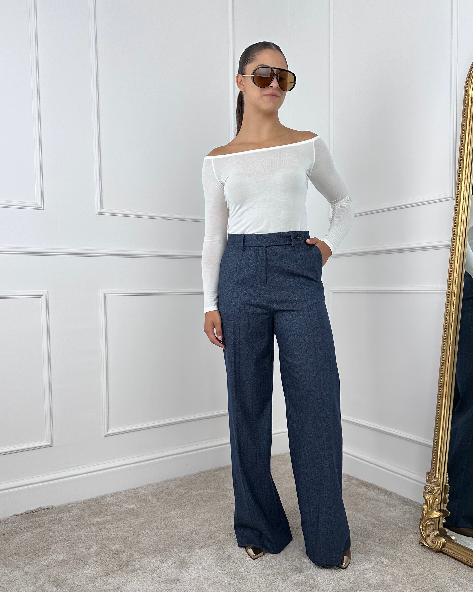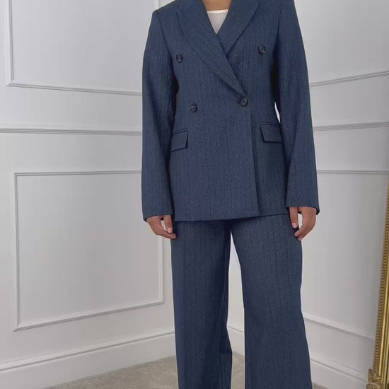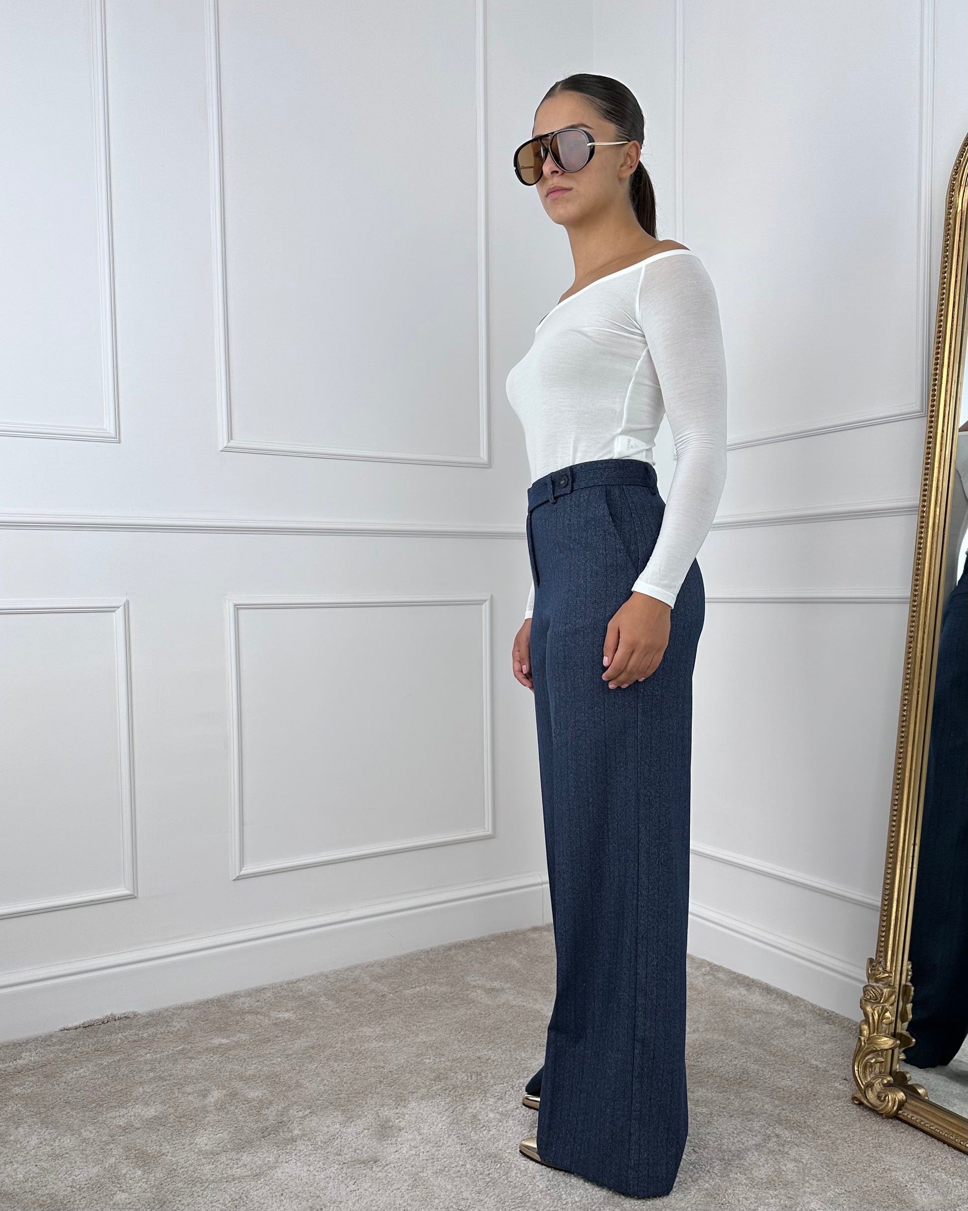 My-d pantalone gessato, modello palazzo, chiusura con patta, e zip nascosta, dotato di passanti. Tasche a filo.
