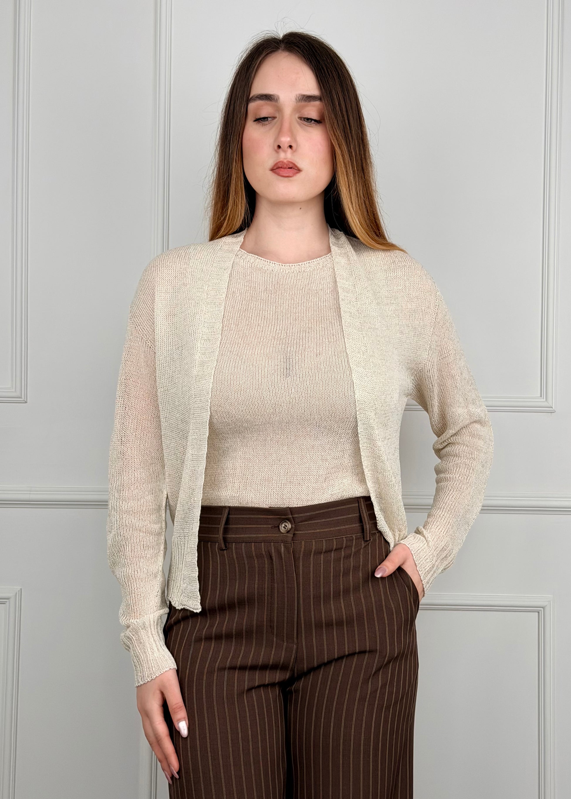 Brend top in filo di lurex, scollo giro, spalla larga. Se vuoi creare un twinset è disponibile il cardigan con il codice: I93079. Composizione: 40% Poliestere 38% Cotone 18% Nylon 4% Fibra metallica