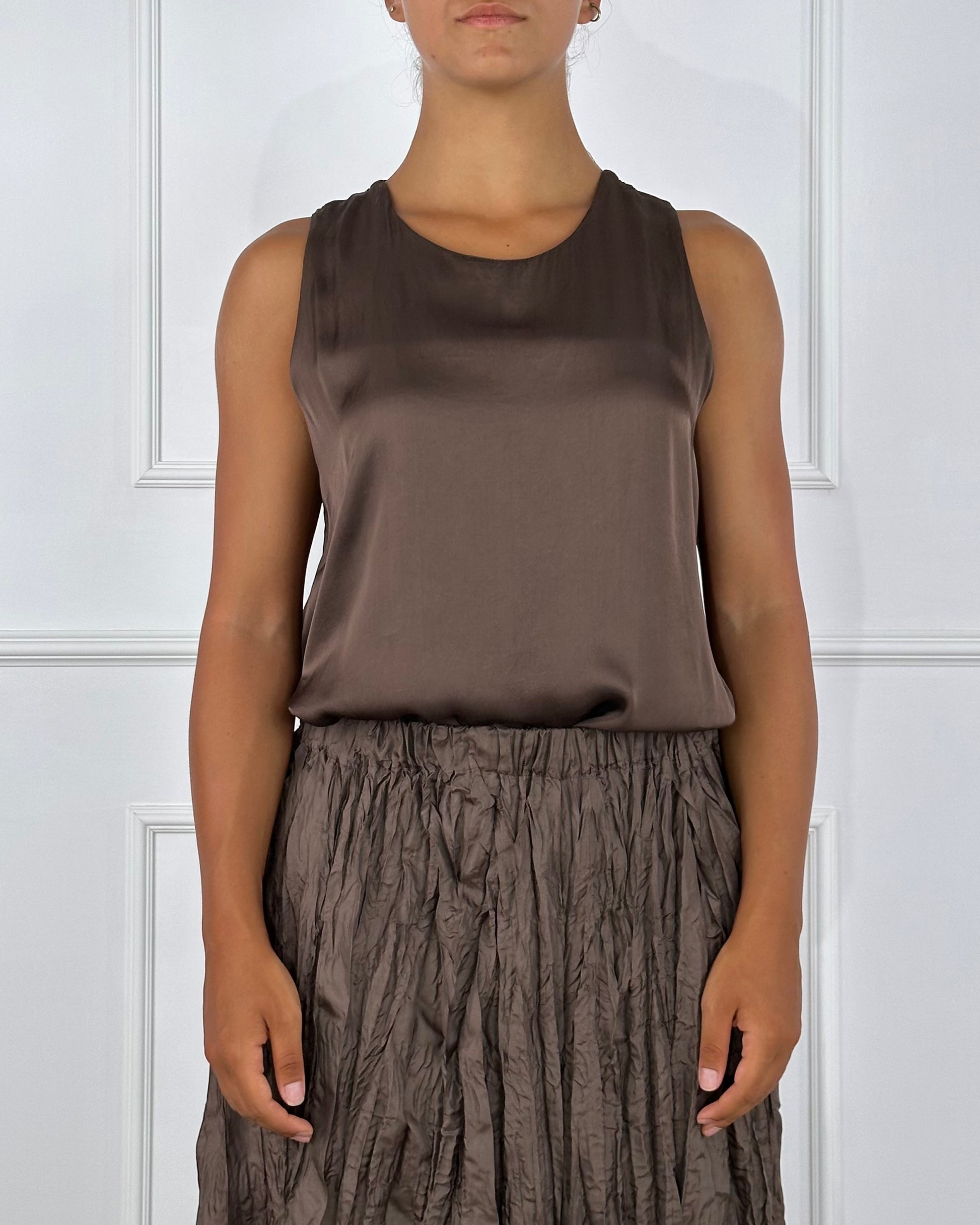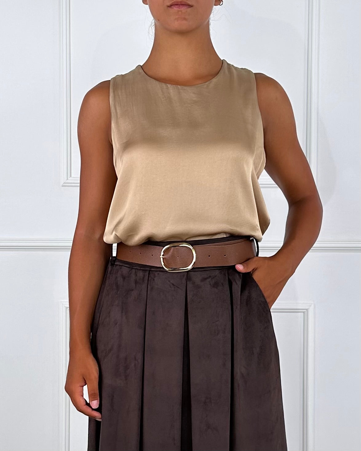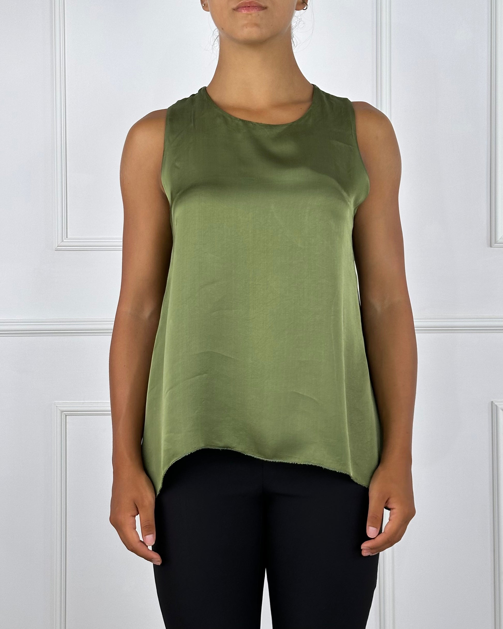 Top in viscosa, spalla larga, scollo giro, chiusura con bottone sul reto.