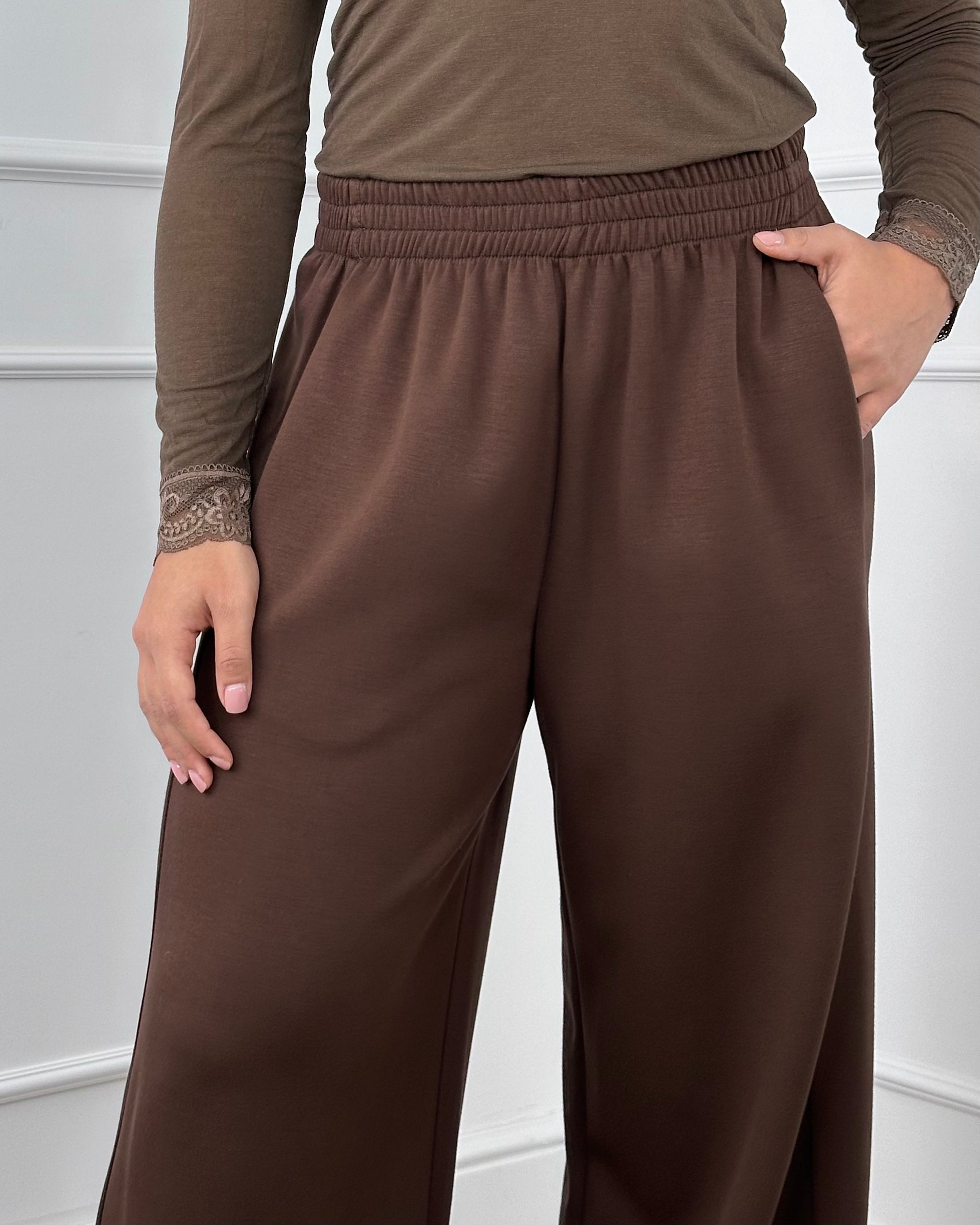 My-d pantalone palazzo morbidone, elastico in vita, tasche a filo. Se vuoi creare un completo è disponibile sul nostro sito il cardigan cod art: MR11795 Composizione: 49% Poliestere 44% Viscosa 7% Elastan