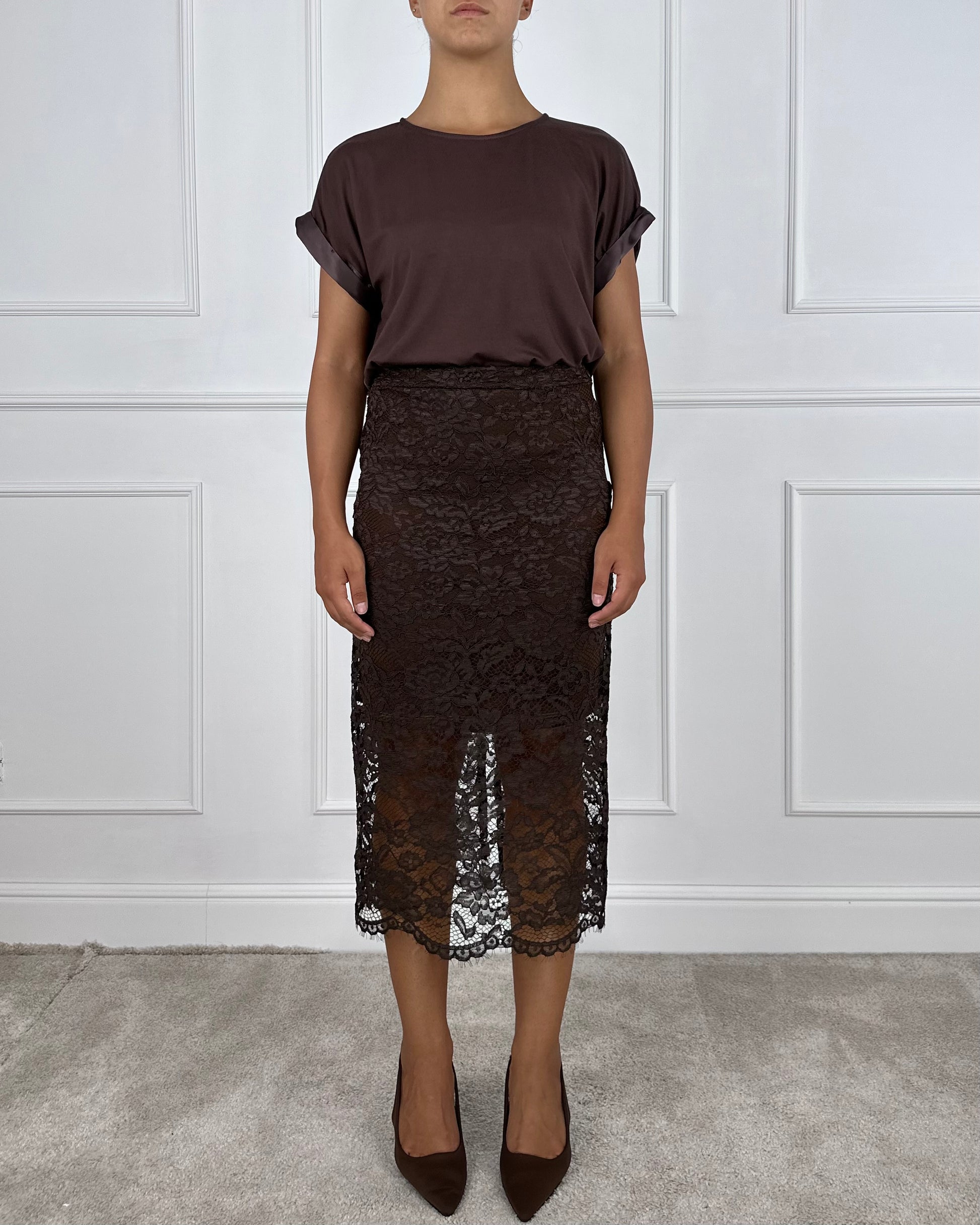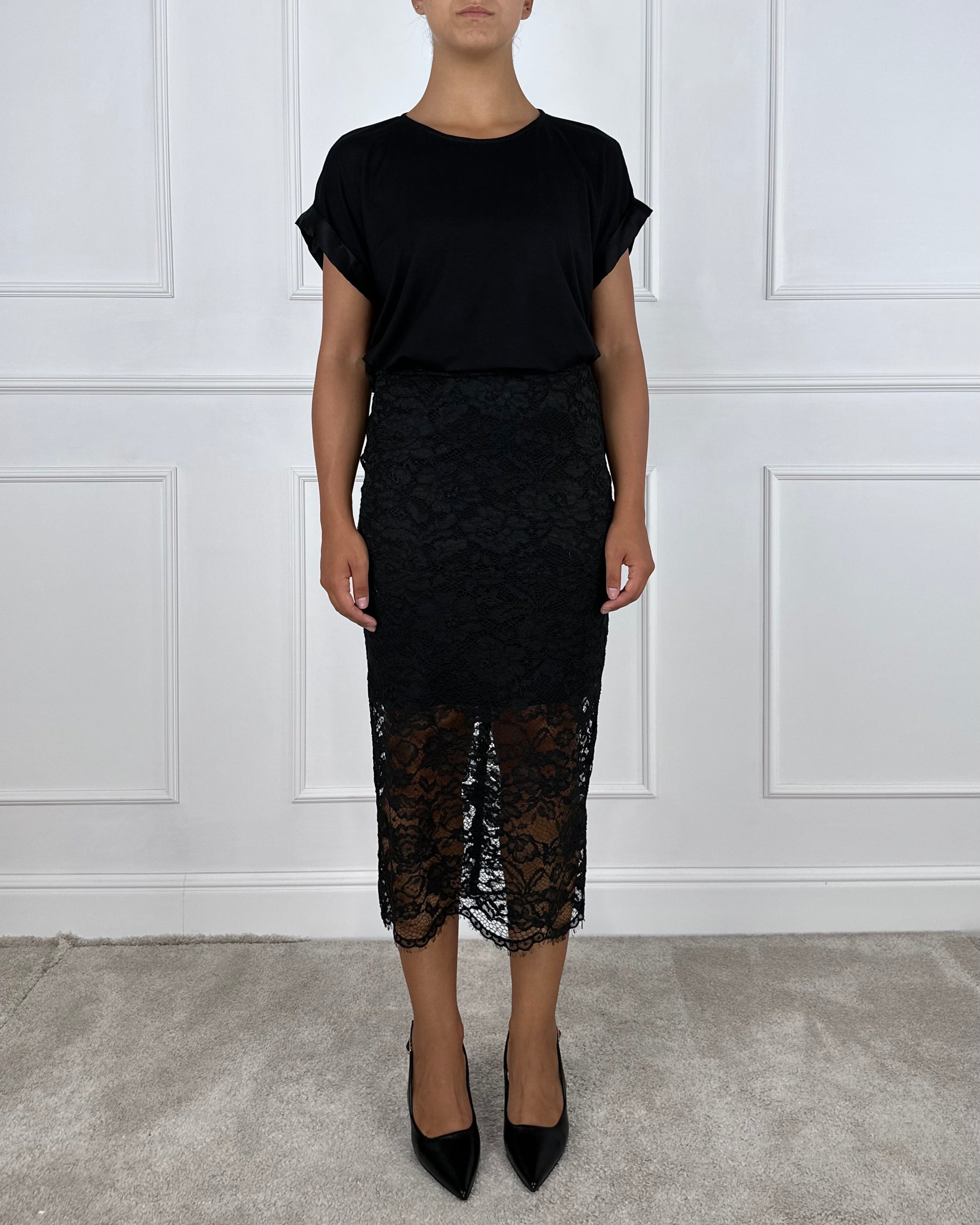 Tensione in gonna in pizzo con sottogonna. Composizione gonna: 100% Poliestere Composizione sottogonna: 95% Poliestere 5% Elastan