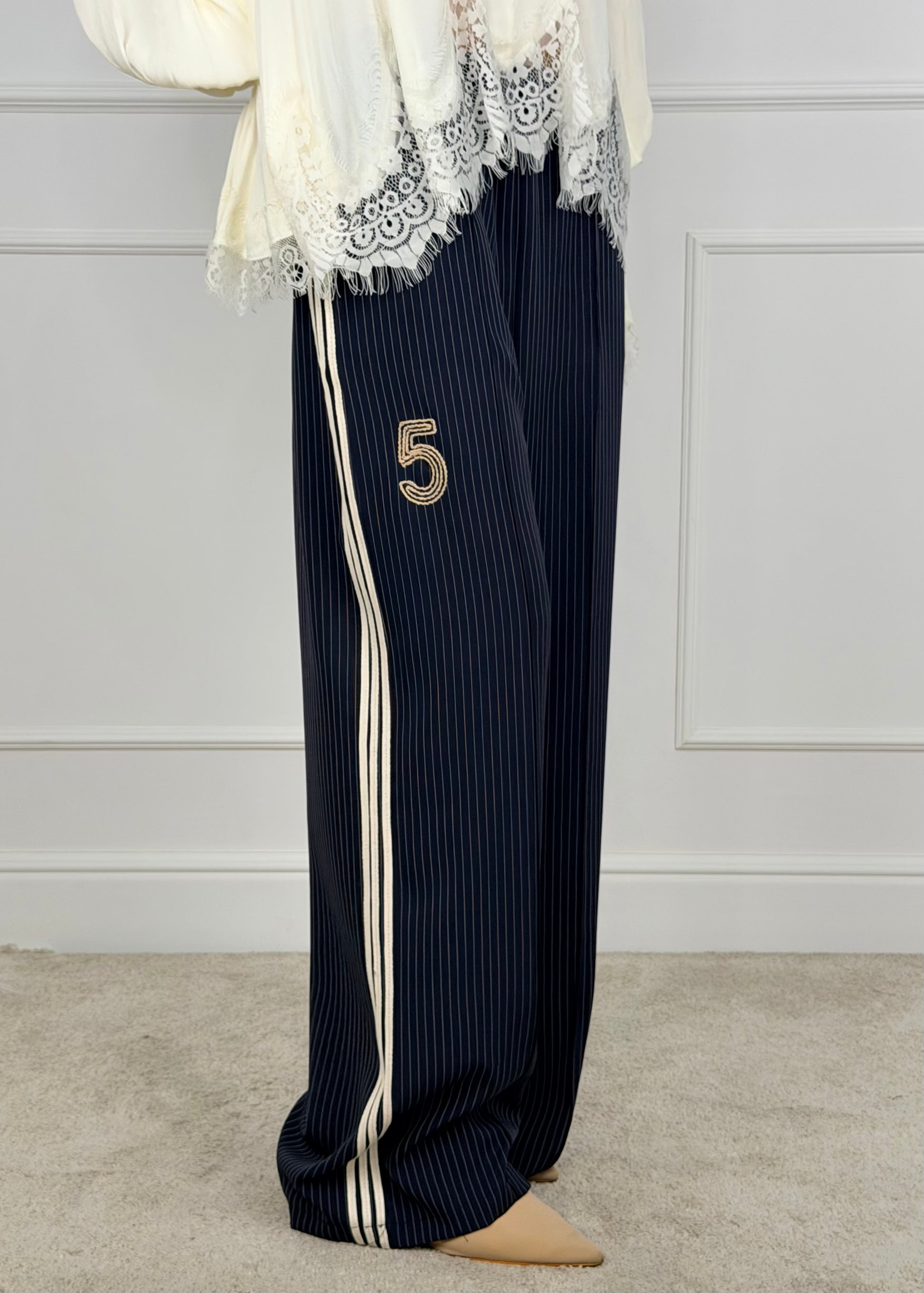 Tensione in pantalone palazzo gessato, bande laterali, elastico in vita, numero 5 ricamato sul davanti. Composizione: 96% Poliestere 4% Elastan