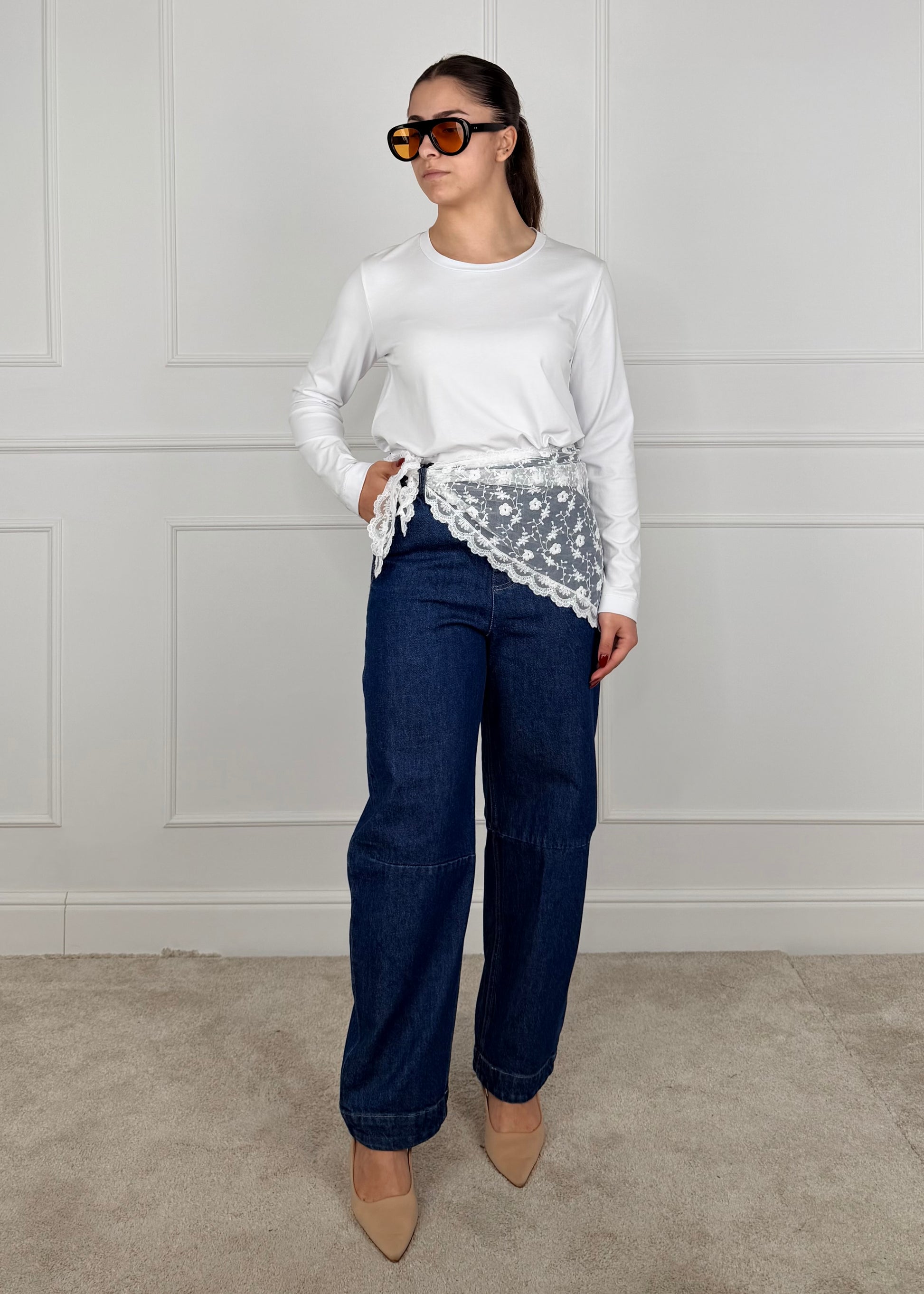 Tensione in denim balloon con bandana ricamata in vita, chiusura con bottone e zip nascosta. Composizione: 99% Cotone 1% Elastan