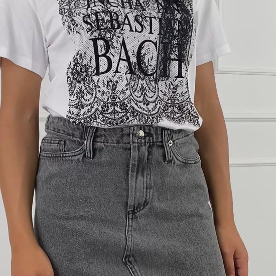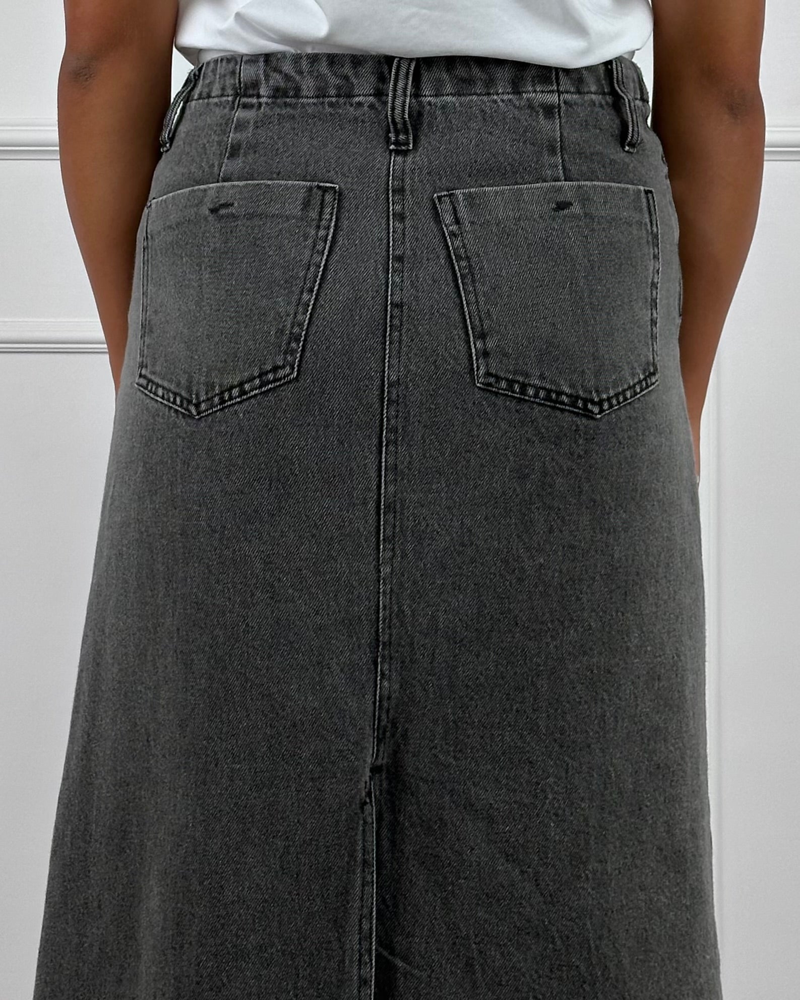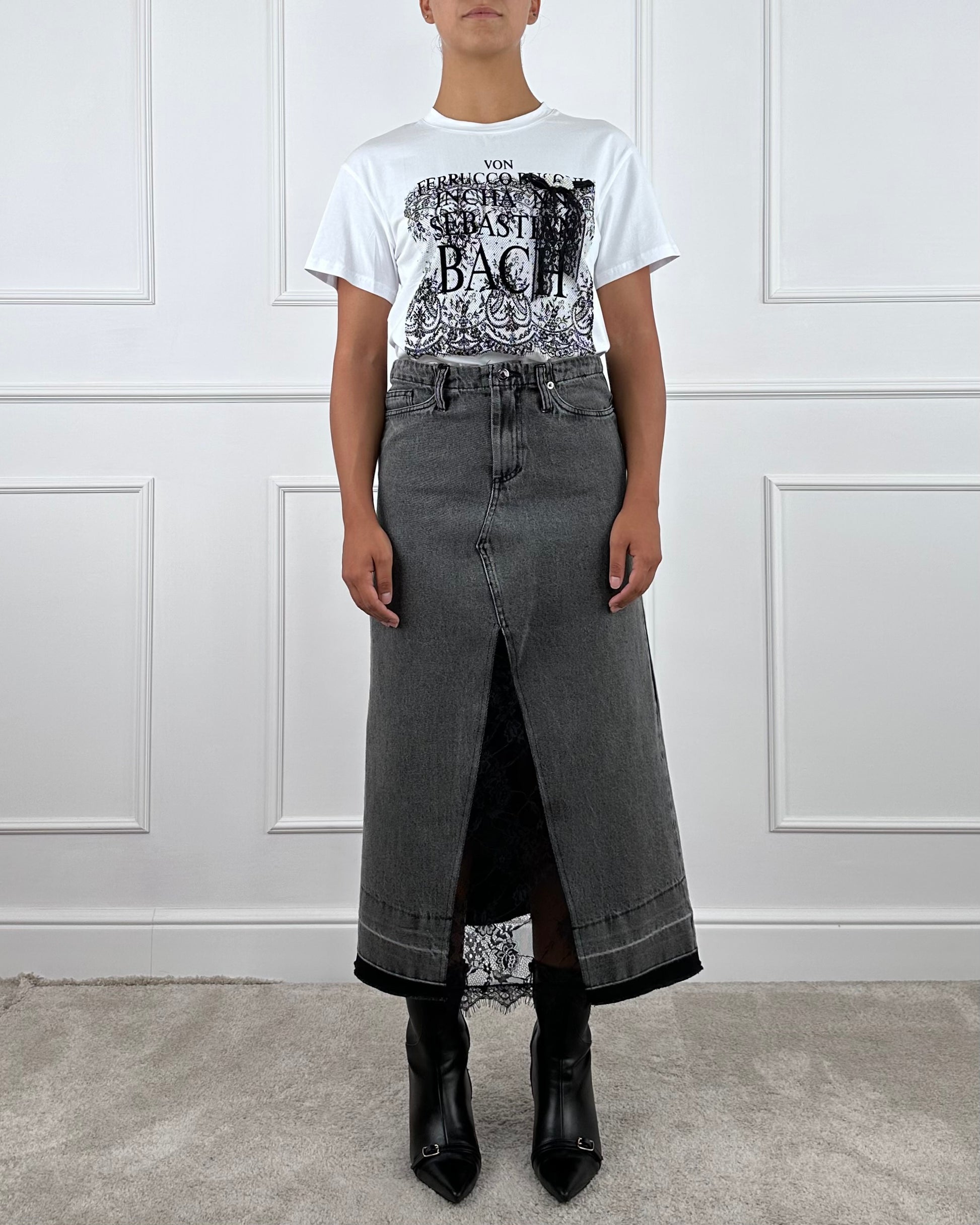 Tensione in gonna in denim, spacco sul davanti con inserto in pizzo, spacco sul retro, chiusura con bottone e zip nascosta. Composizione: 100% Cotone
