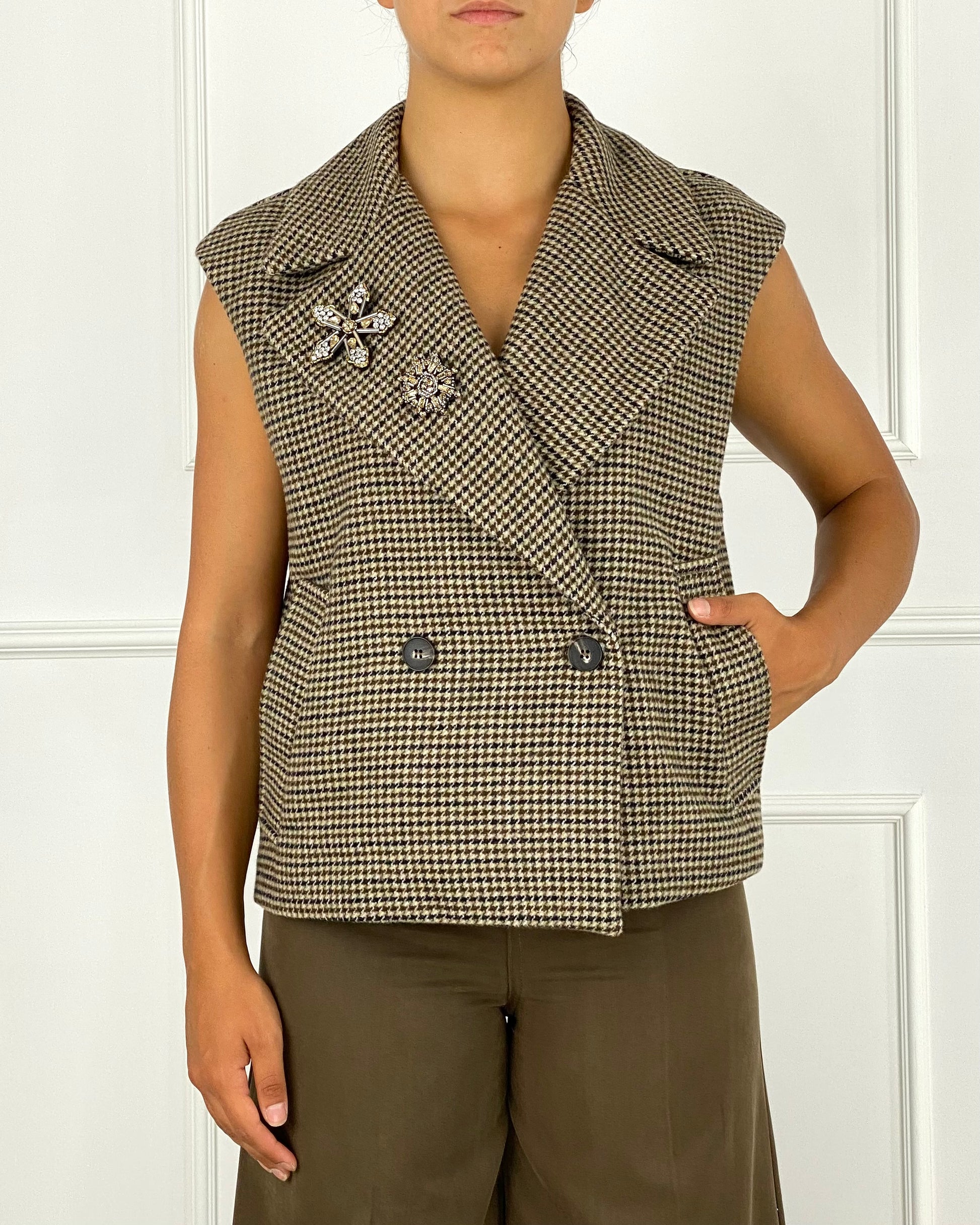 Tensione in gilet pied de poule, doppio petto, chiusura con bottoni, spille rimovibili, tasche sul davanti. Foderato Composizione: 75% Poliestere 15% Lana 10% Altre fibre Composizione fodera: 60% Acetato 40% Viscosa