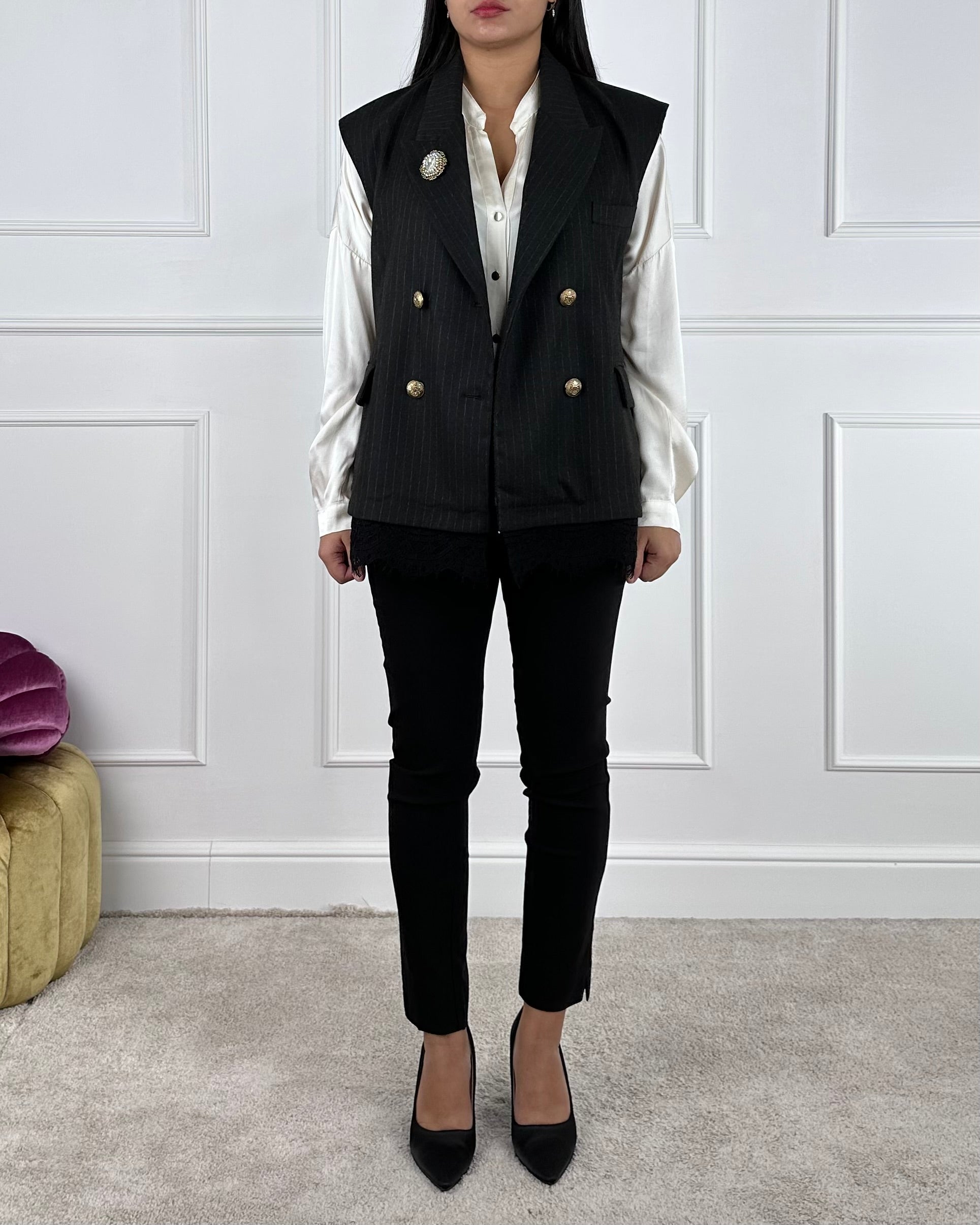 Tensione in gilet doppio petto, chiusura con bottoni oro, spilla rimovibile, tasche finte sul davanti con patta. Pizzo sul fondo.