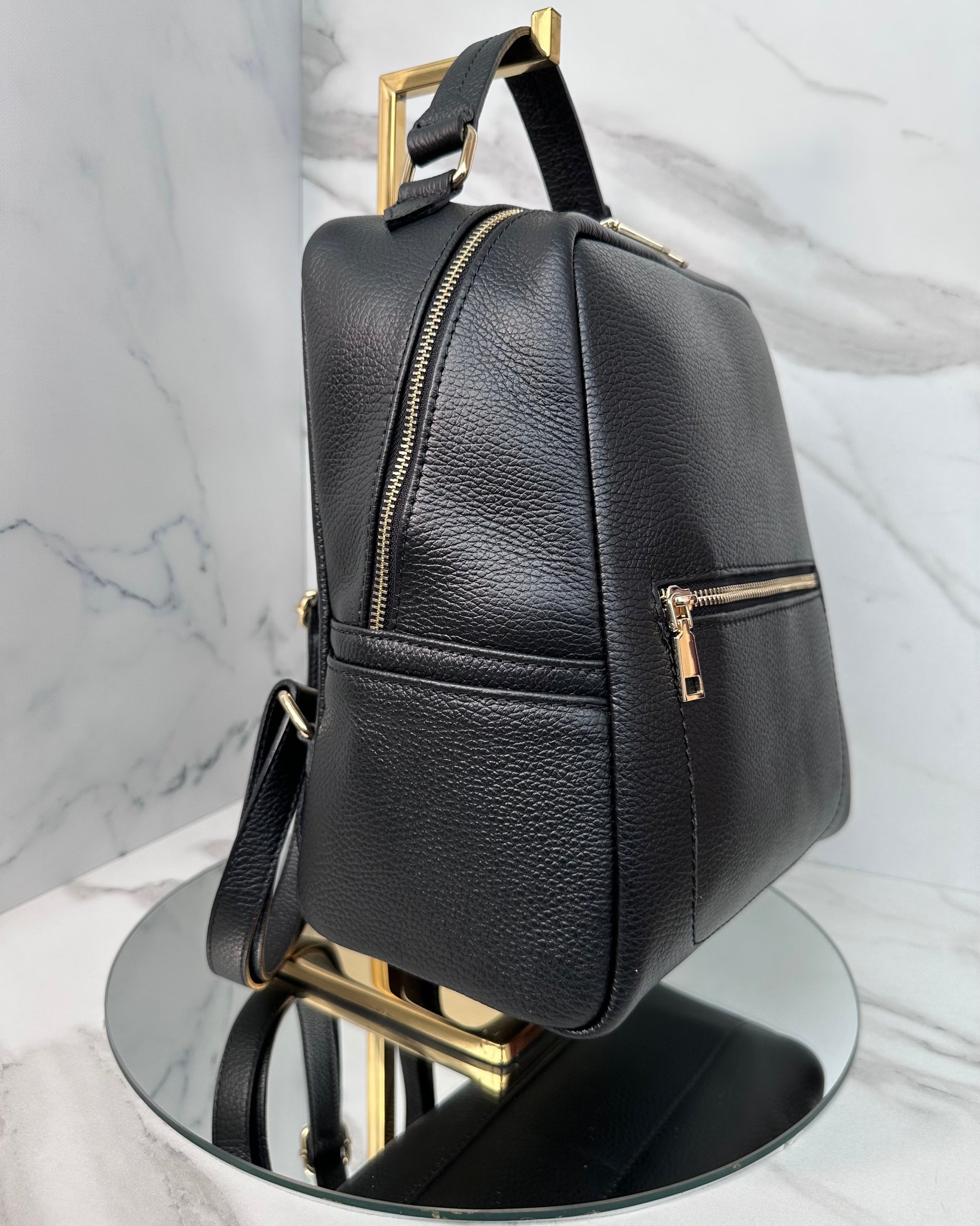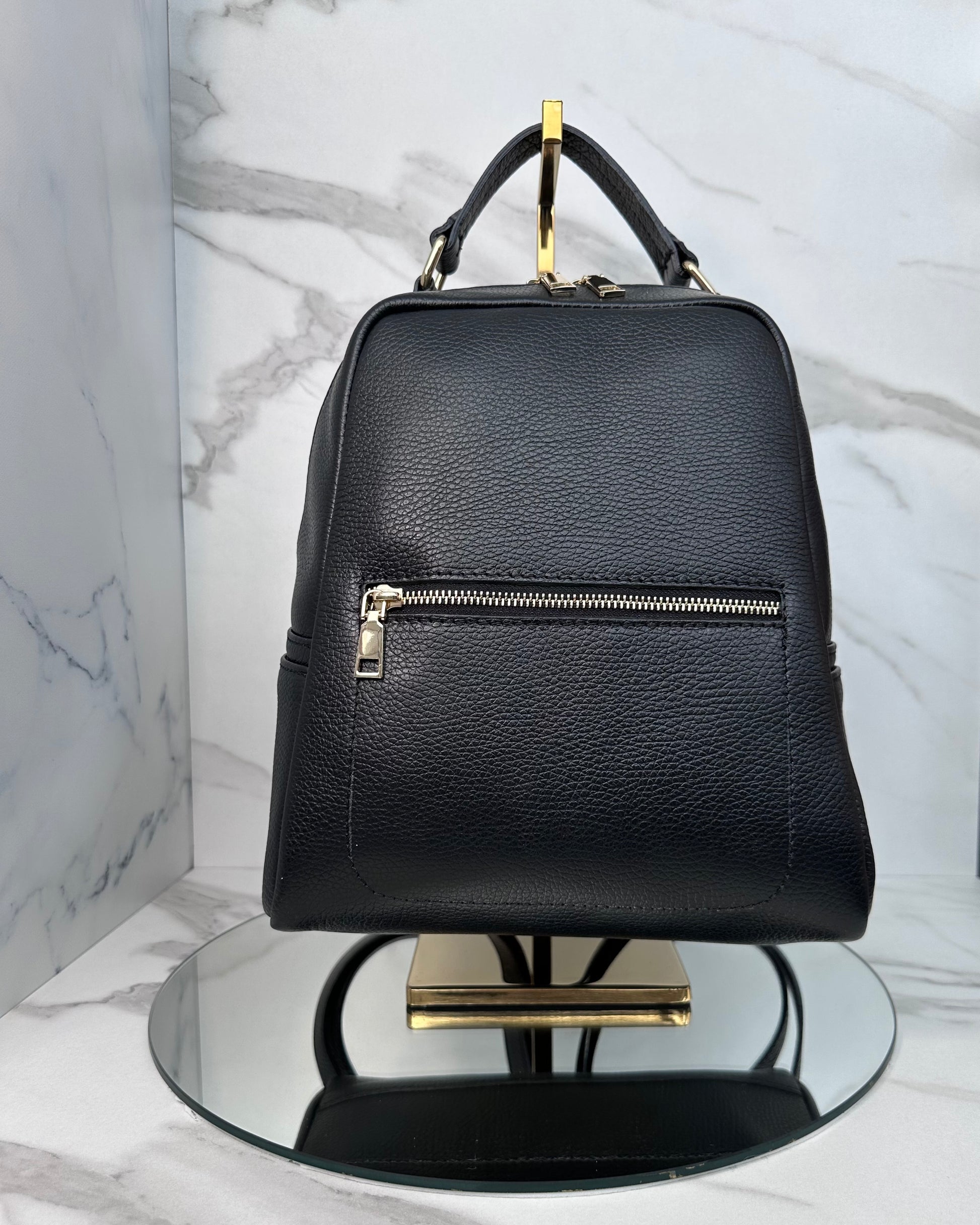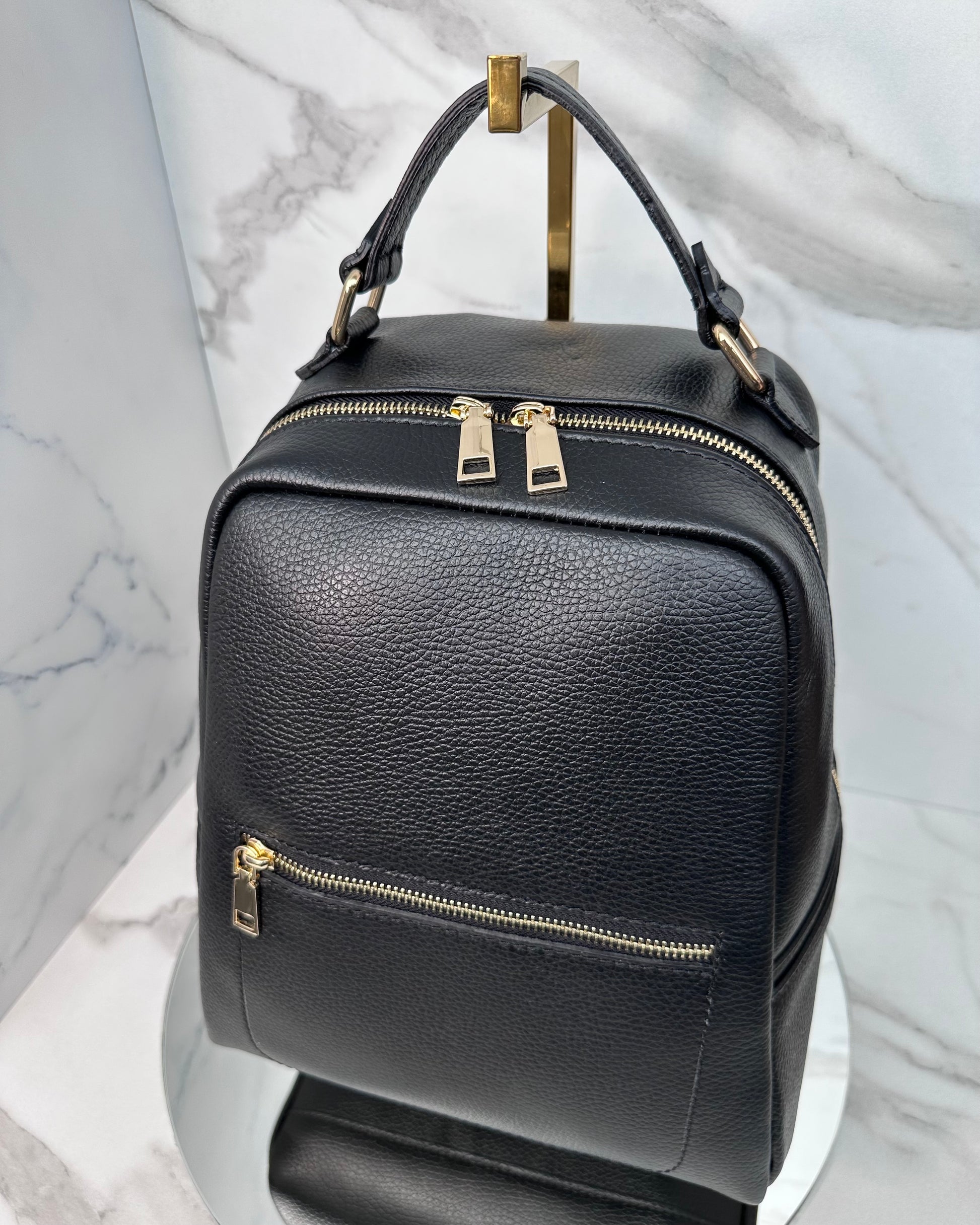 Zaino vera pelle, chiusura con zip, tasca frontale con zip. Dimensioni zaino altezza 29 cm larghezza 25 cm profondità 14 cm